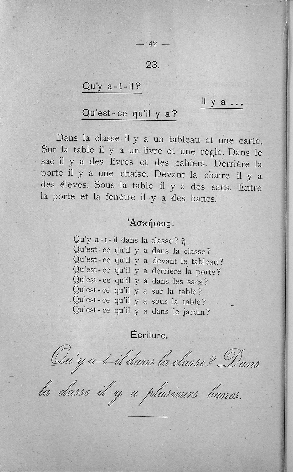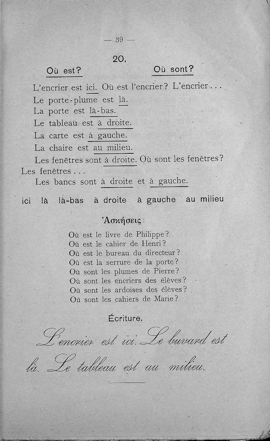 Σχολικό εγχειρίδιο Γαλλικών Β΄ και Γ' Ελληνικού Σχολείου, Αστικού Σχολείου και Παρθεναγωγείου που περιλαμβάνει κείμενα, κανόνες γραμματικής και συντακτικού, ερωτήσεις και ασκήσεις κατανόησης, και λεξιλογικά ...