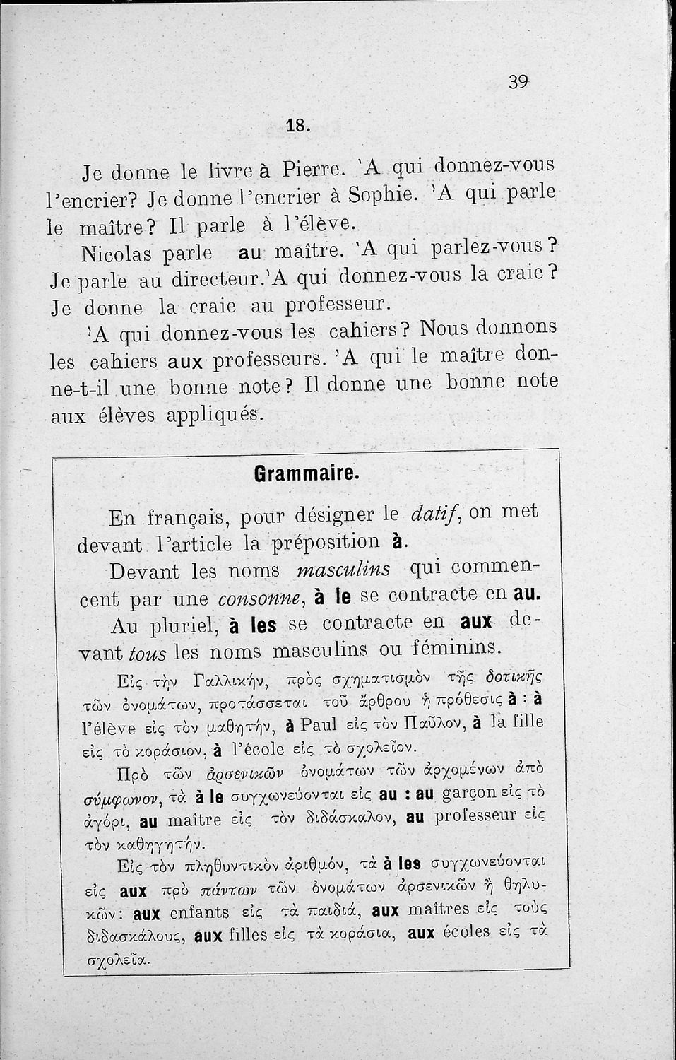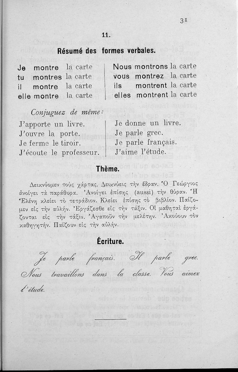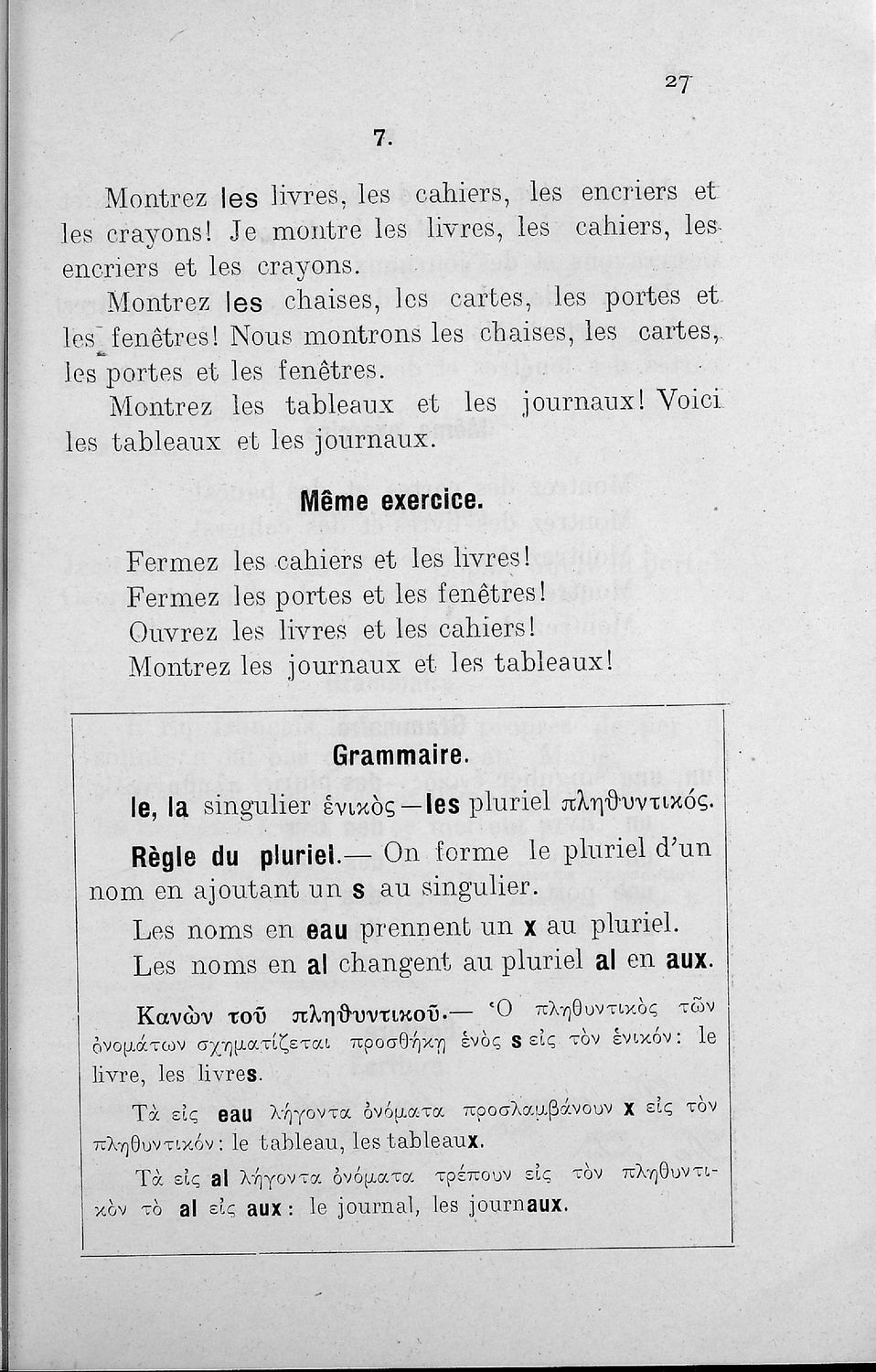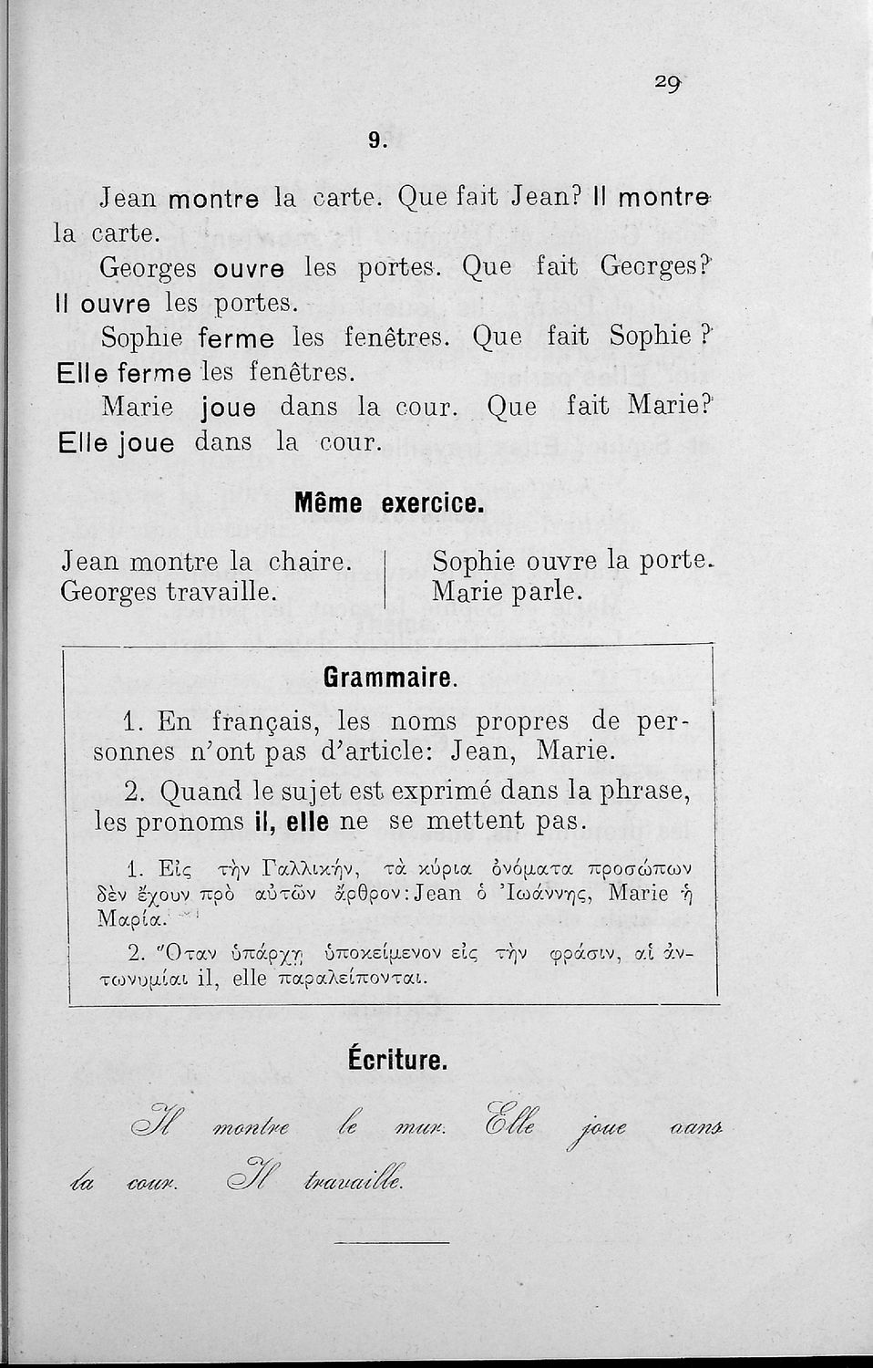 Σχολικό εγχειρίδιο Γαλλικών για τις Β’ και Γ’ Ελληνικού και Αστικού Σχολείου και Παρθεναγωγείου που περιλαμβάνει ασκήσεις προφοράς, συνομιλίας και γραμματικής, και λεξιλόγιο.