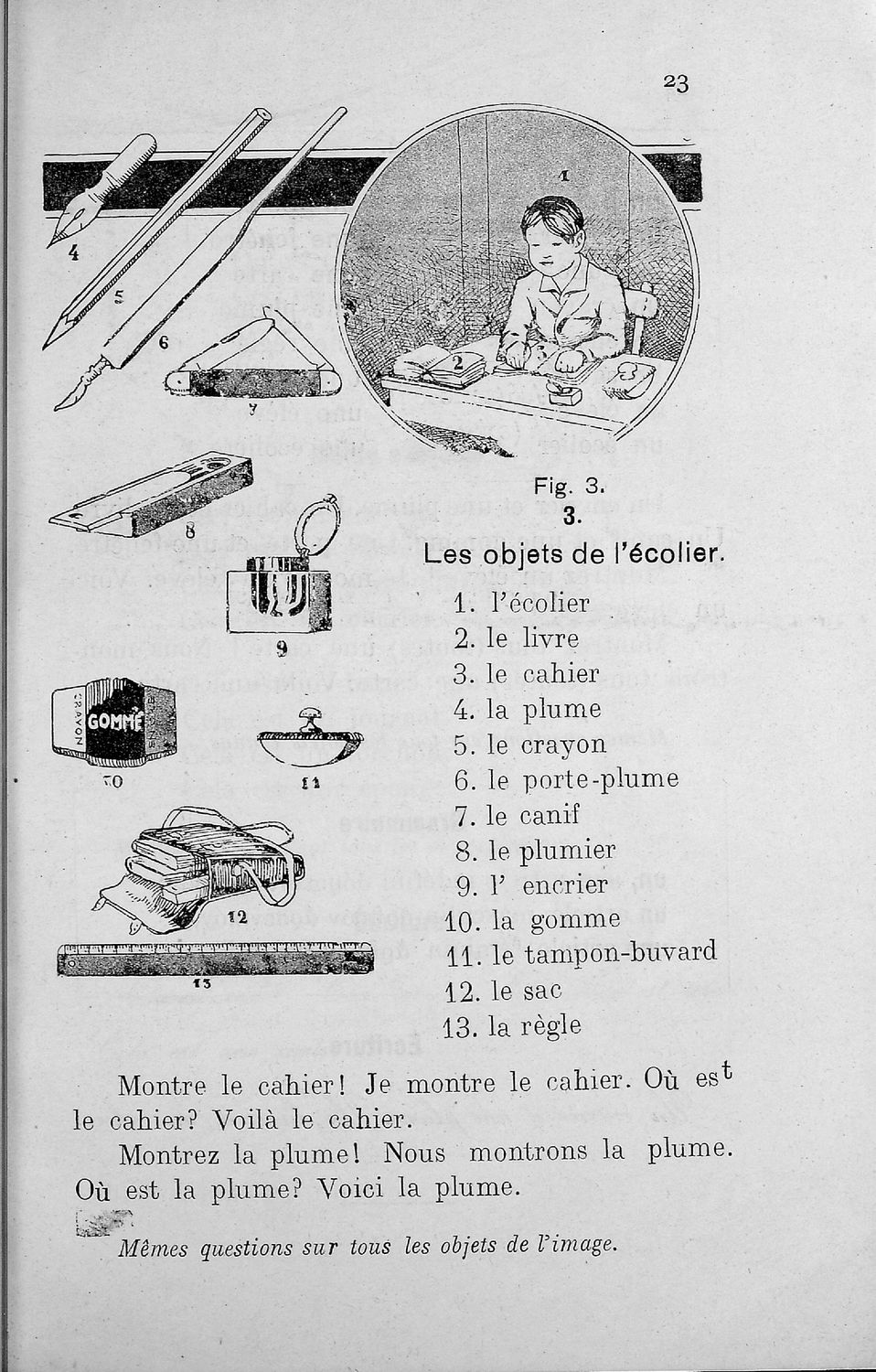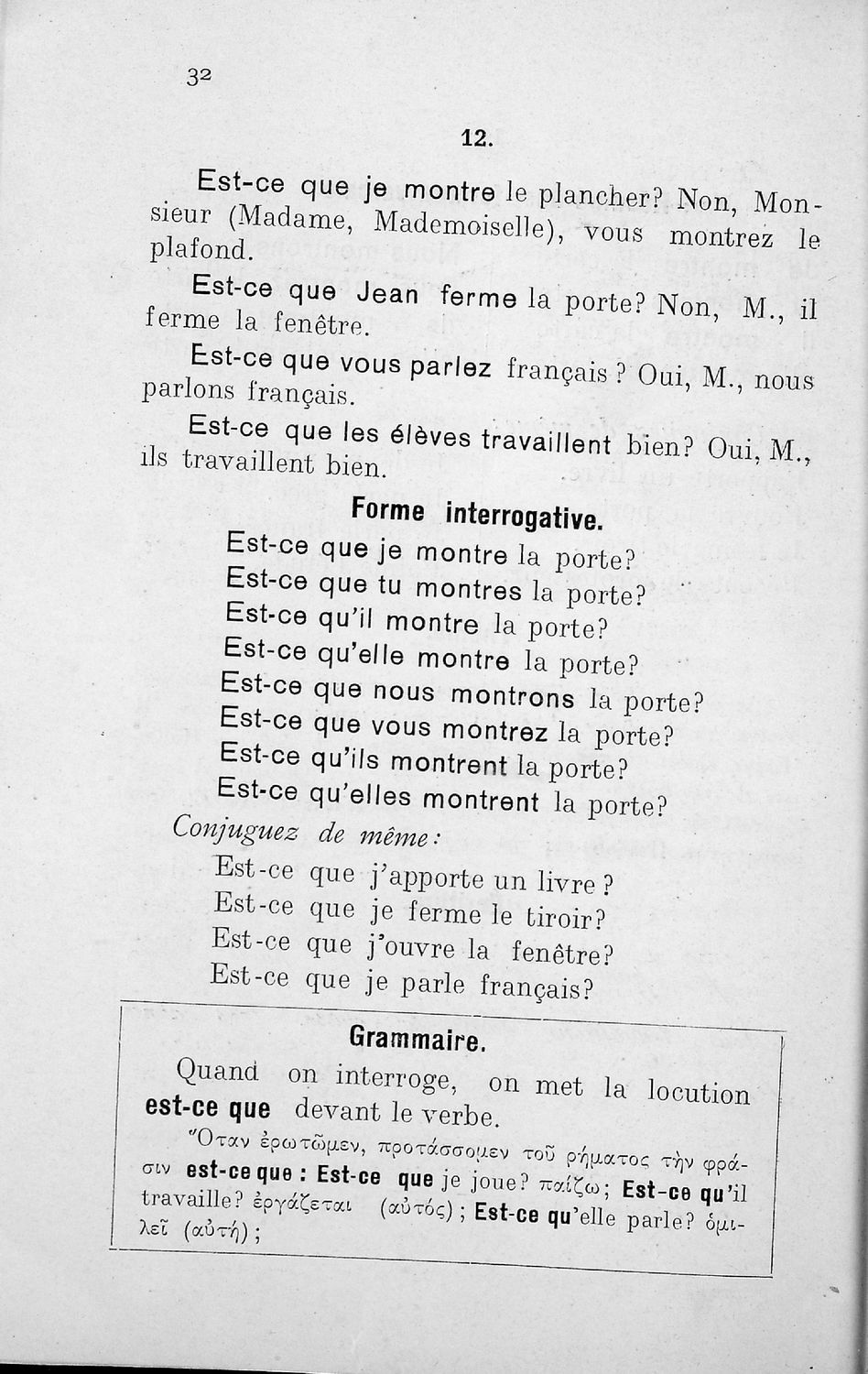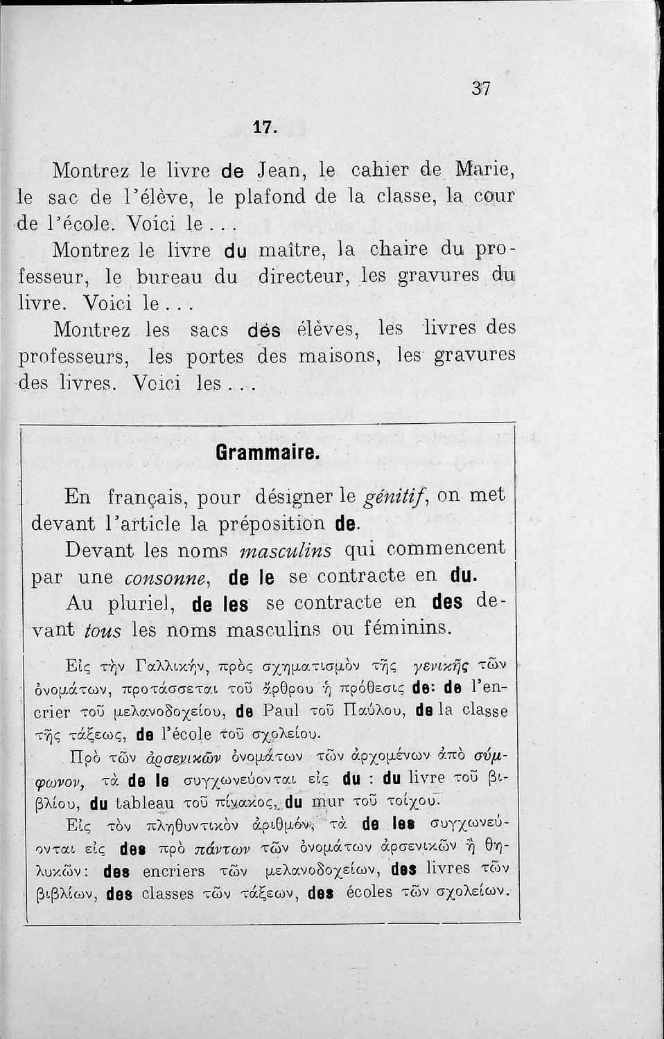 Σχολικό εγχειρίδιο Γαλλικών για τις Β’ και Γ’ Ελληνικού και Αστικού Σχολείου και Παρθεναγωγείου που περιλαμβάνει ασκήσεις προφοράς, συνομιλίας και γραμματικής, και λεξιλόγιο.
