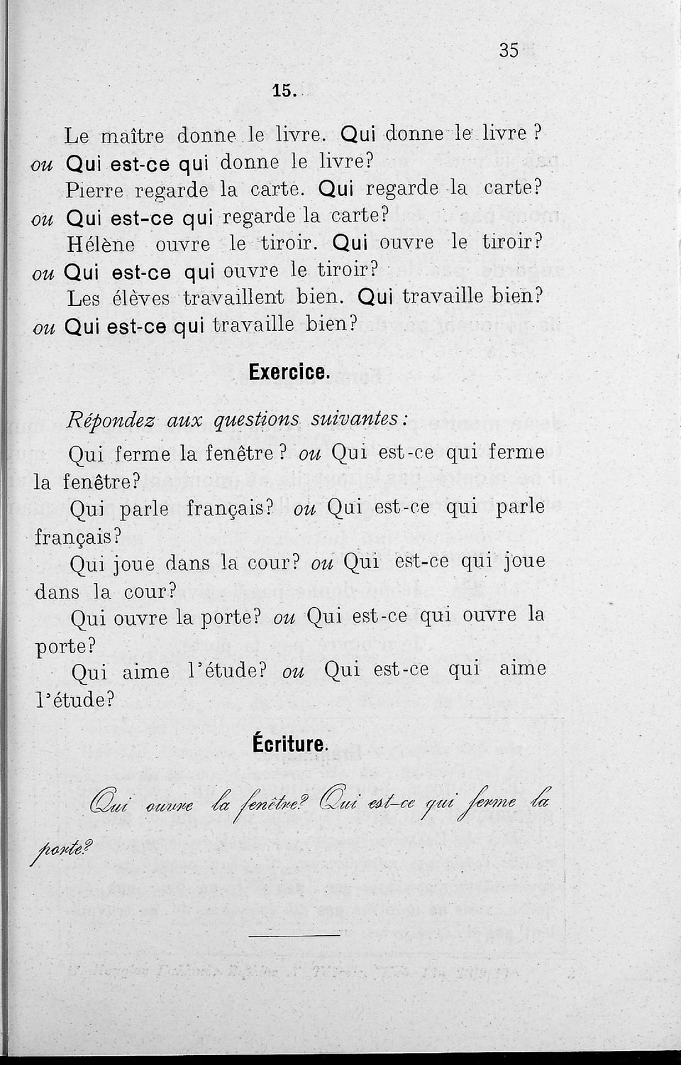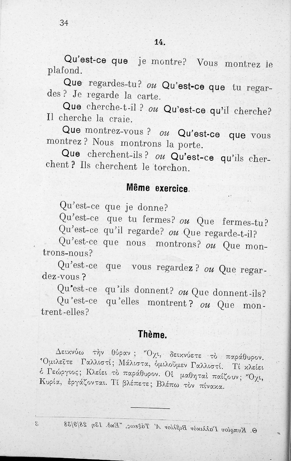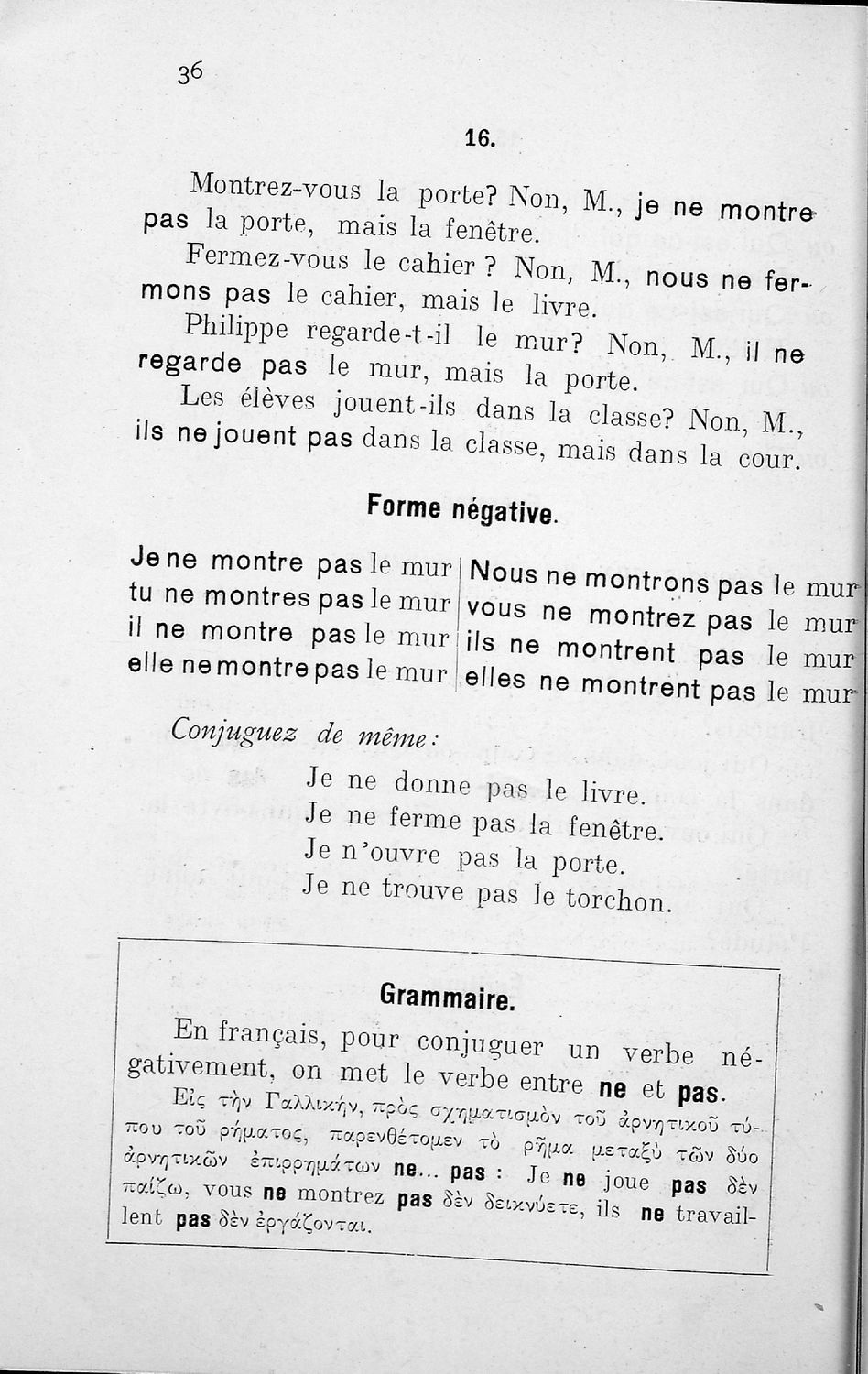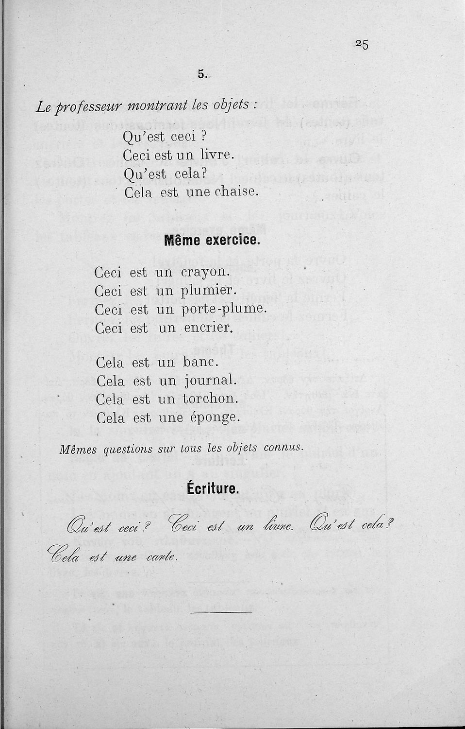 Σχολικό εγχειρίδιο Γαλλικών για τις Β’ και Γ’ Ελληνικού και Αστικού Σχολείου και Παρθεναγωγείου που περιλαμβάνει ασκήσεις προφοράς, συνομιλίας και γραμματικής, και λεξιλόγιο.