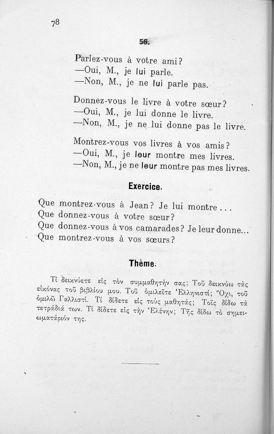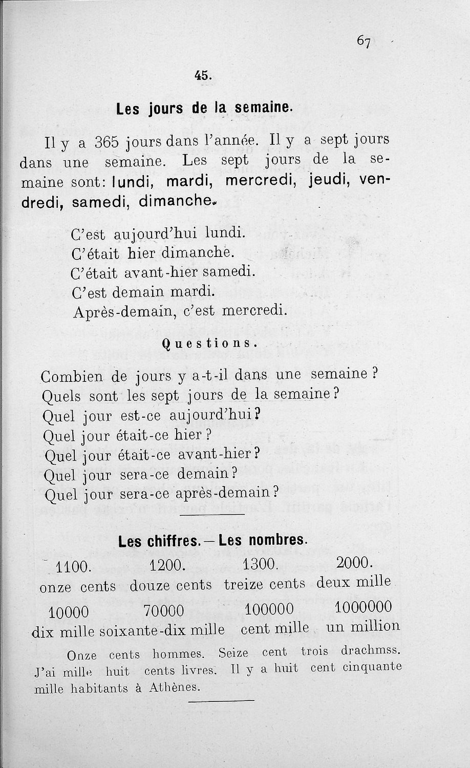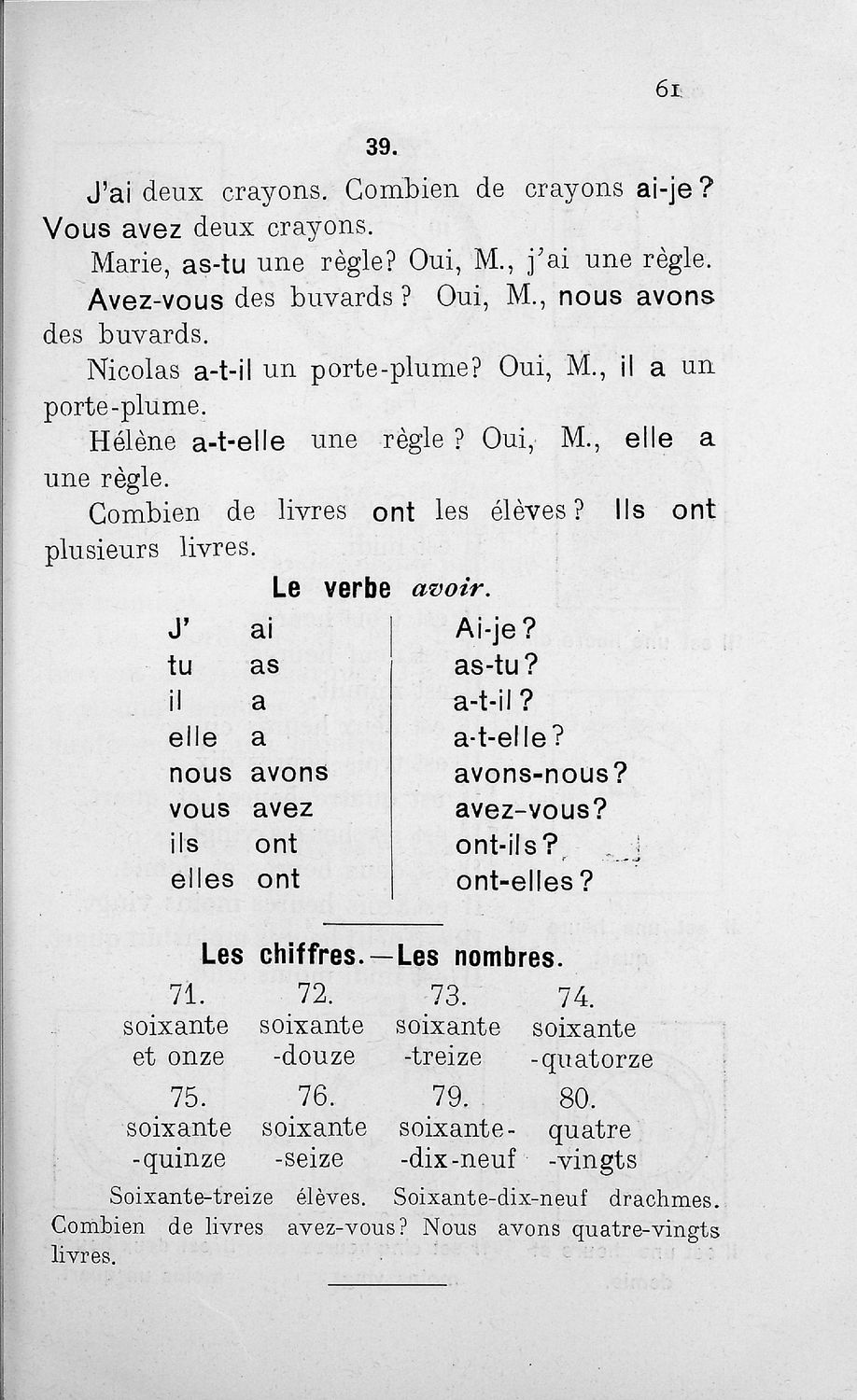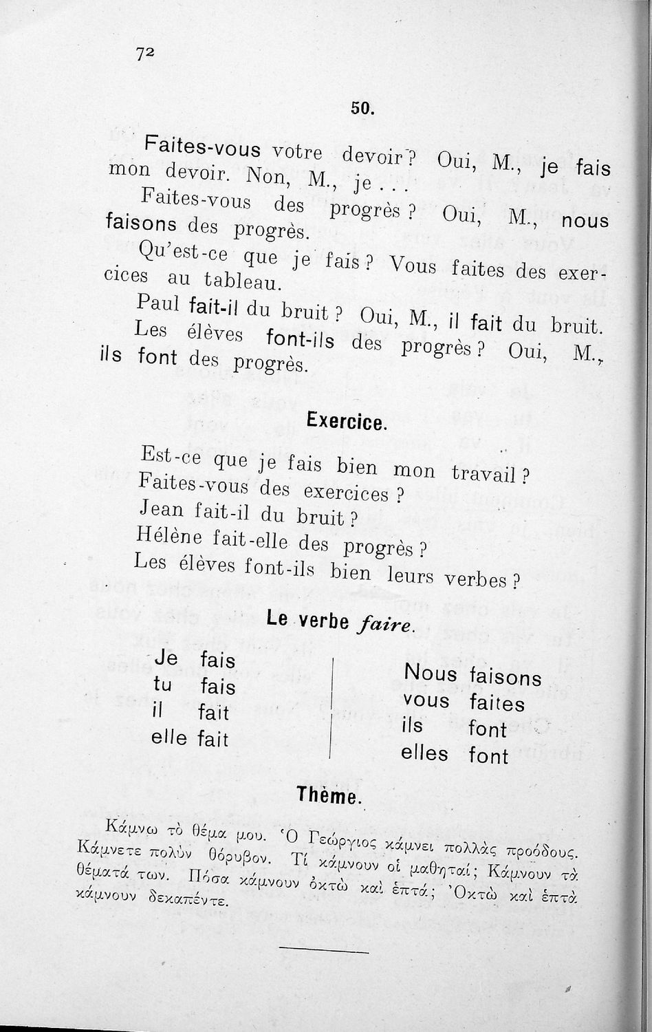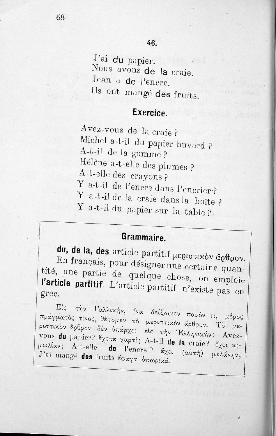 Σχολικό εγχειρίδιο Γαλλικών για τις Β’ και Γ’ Ελληνικού και Αστικού Σχολείου και Παρθεναγωγείου που περιλαμβάνει ασκήσεις προφοράς, συνομιλίας και γραμματικής, και λεξιλόγιο.
