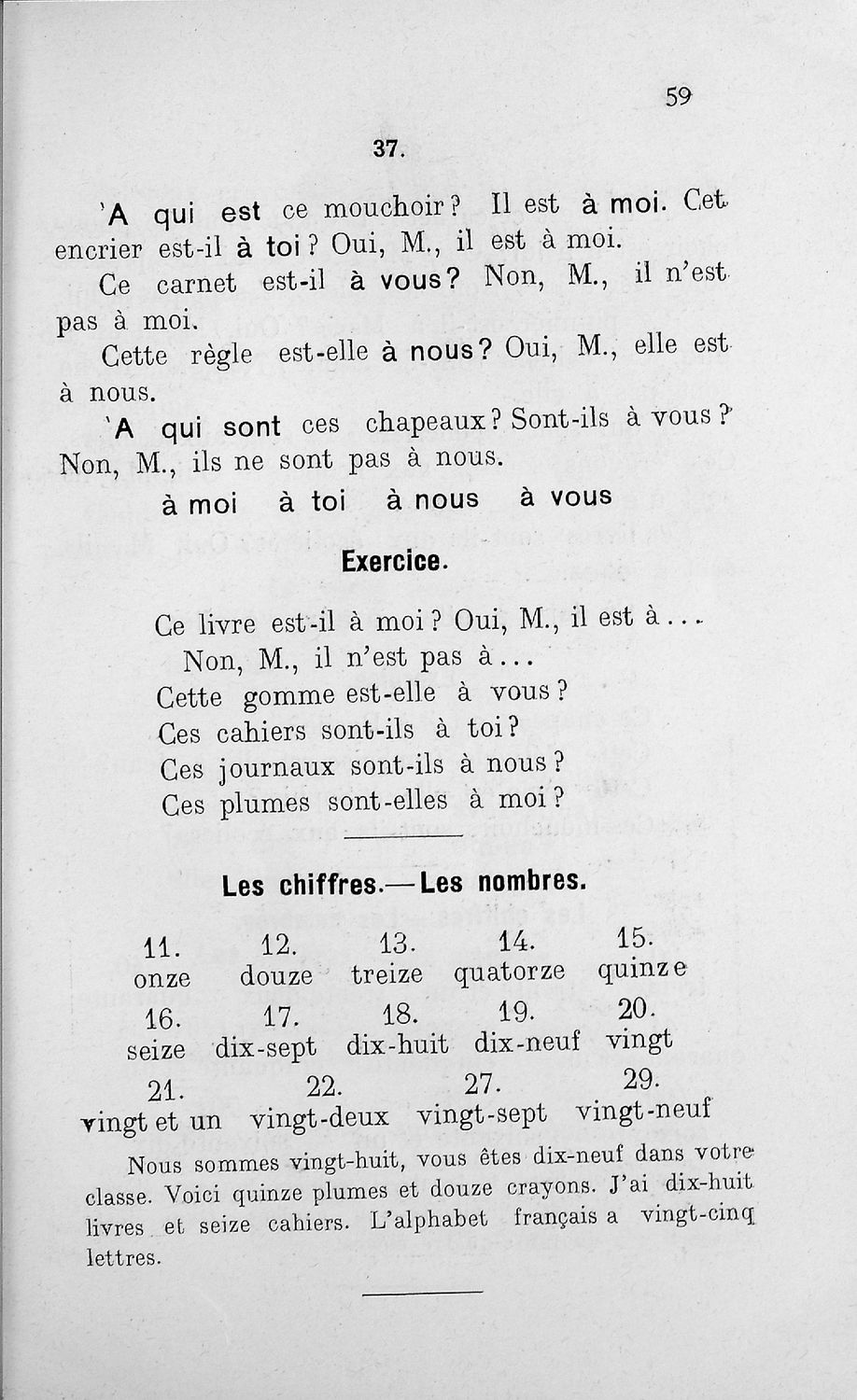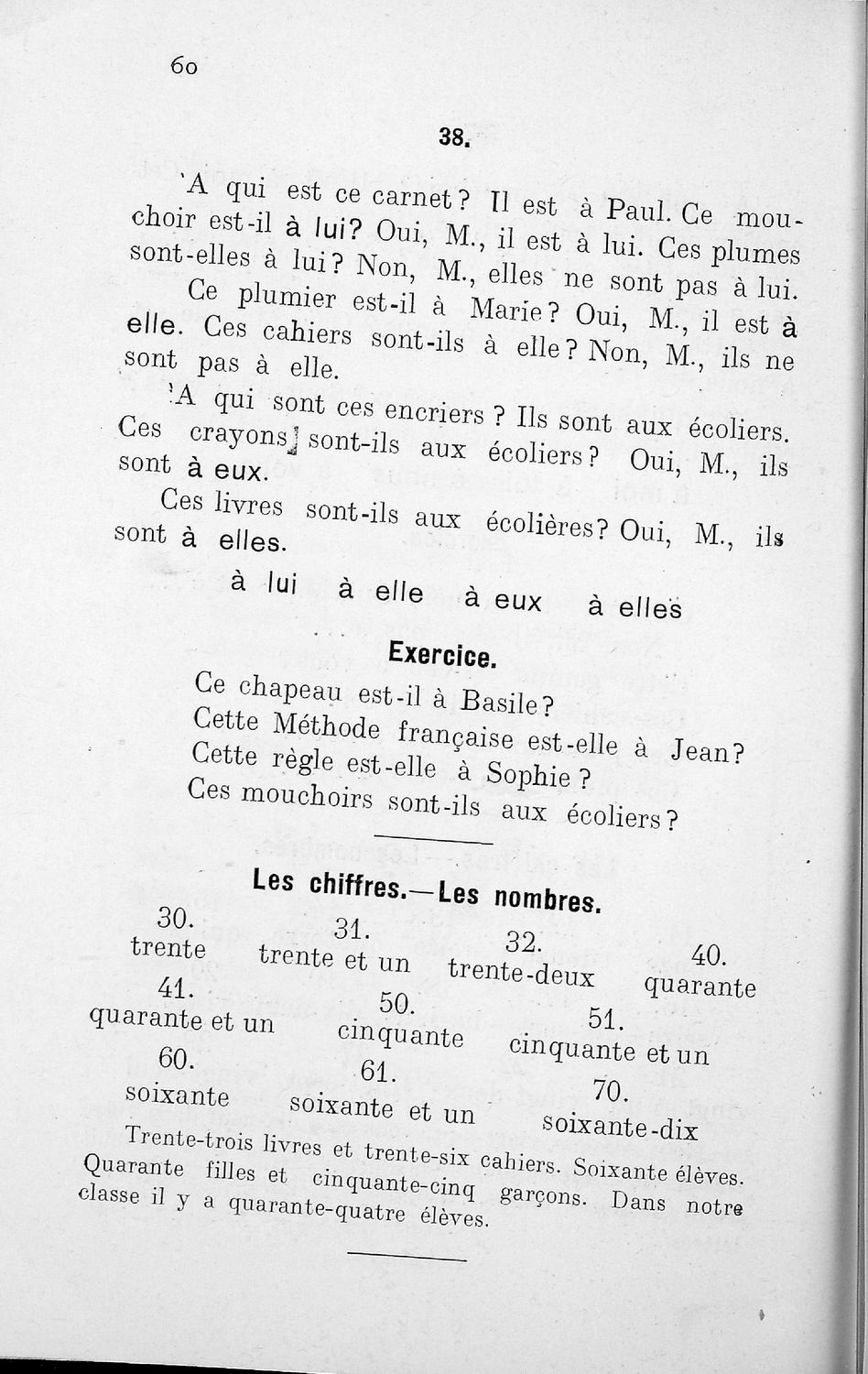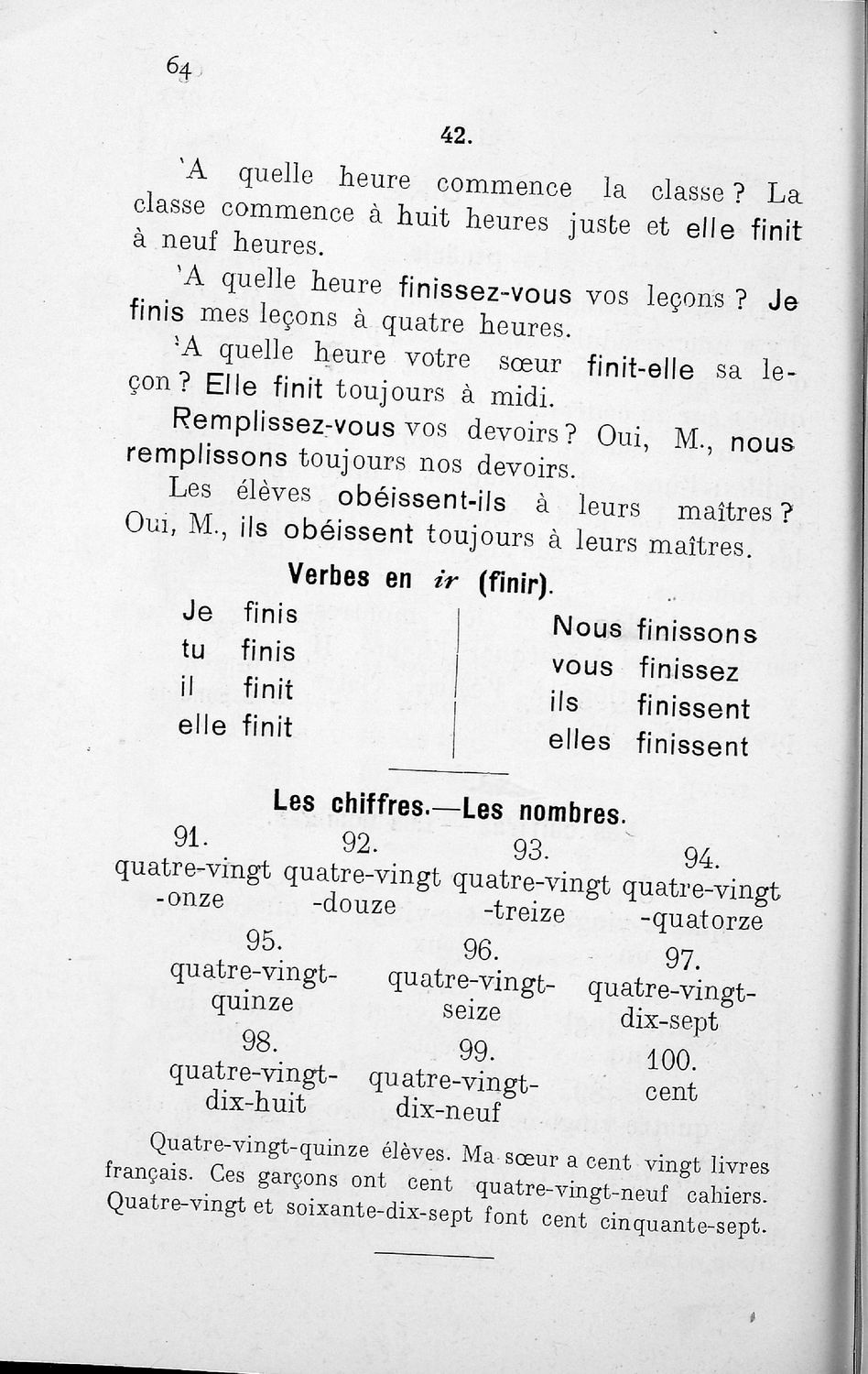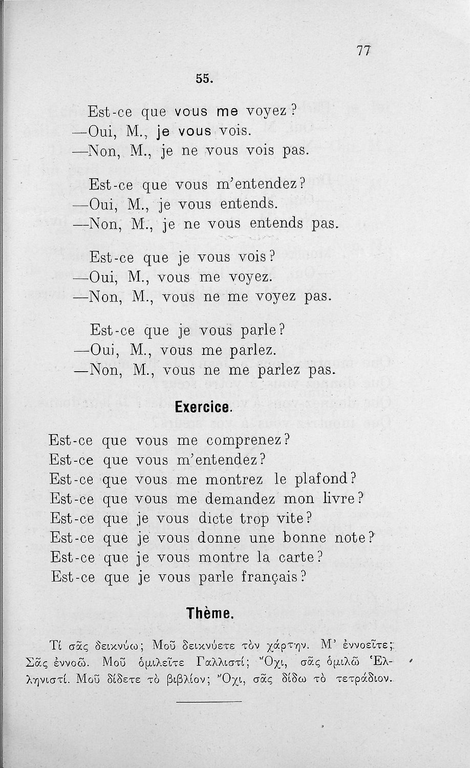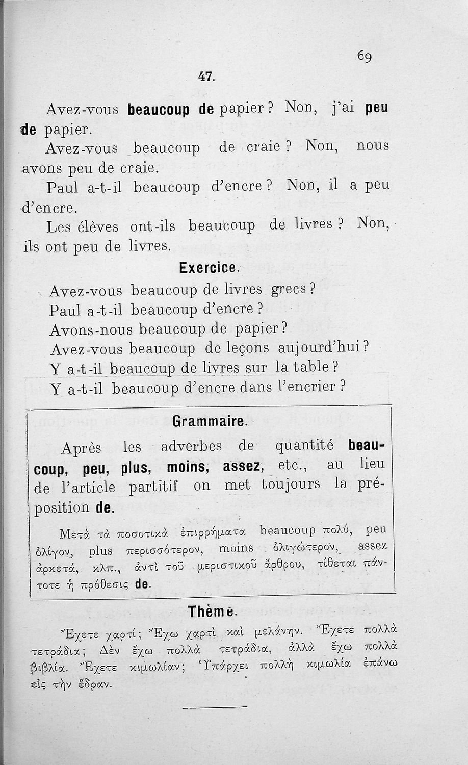 Σχολικό εγχειρίδιο Γαλλικών για τις Β’ και Γ’ Ελληνικού και Αστικού Σχολείου και Παρθεναγωγείου που περιλαμβάνει ασκήσεις προφοράς, συνομιλίας και γραμματικής, και λεξιλόγιο.