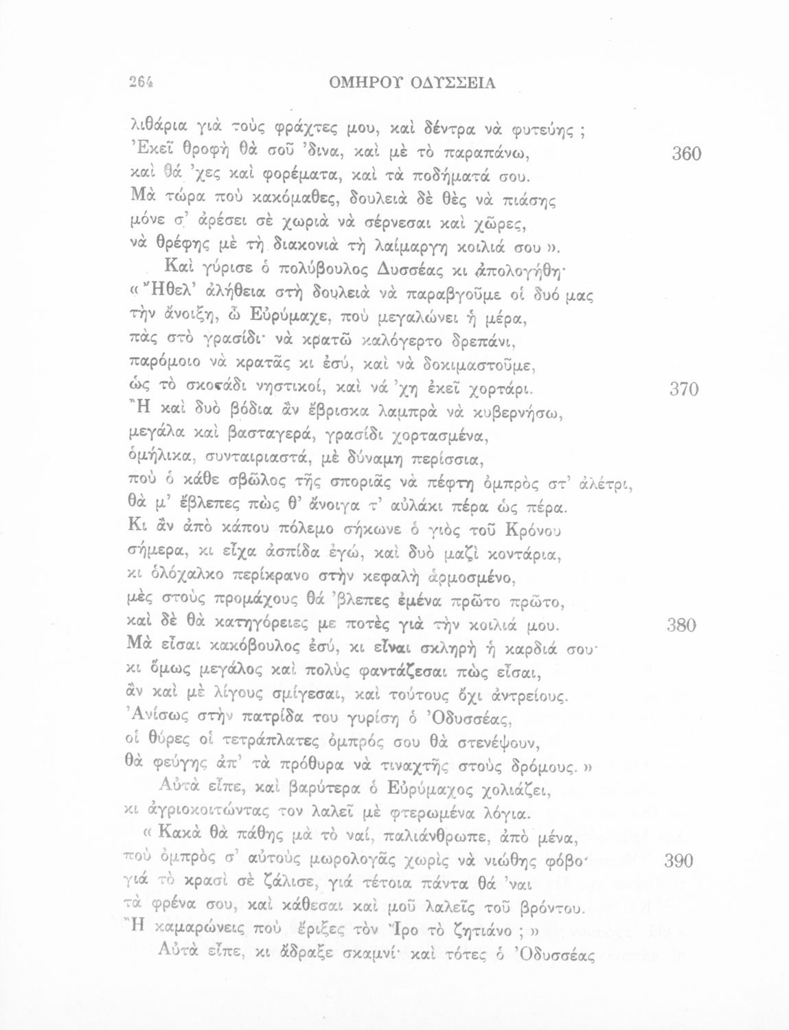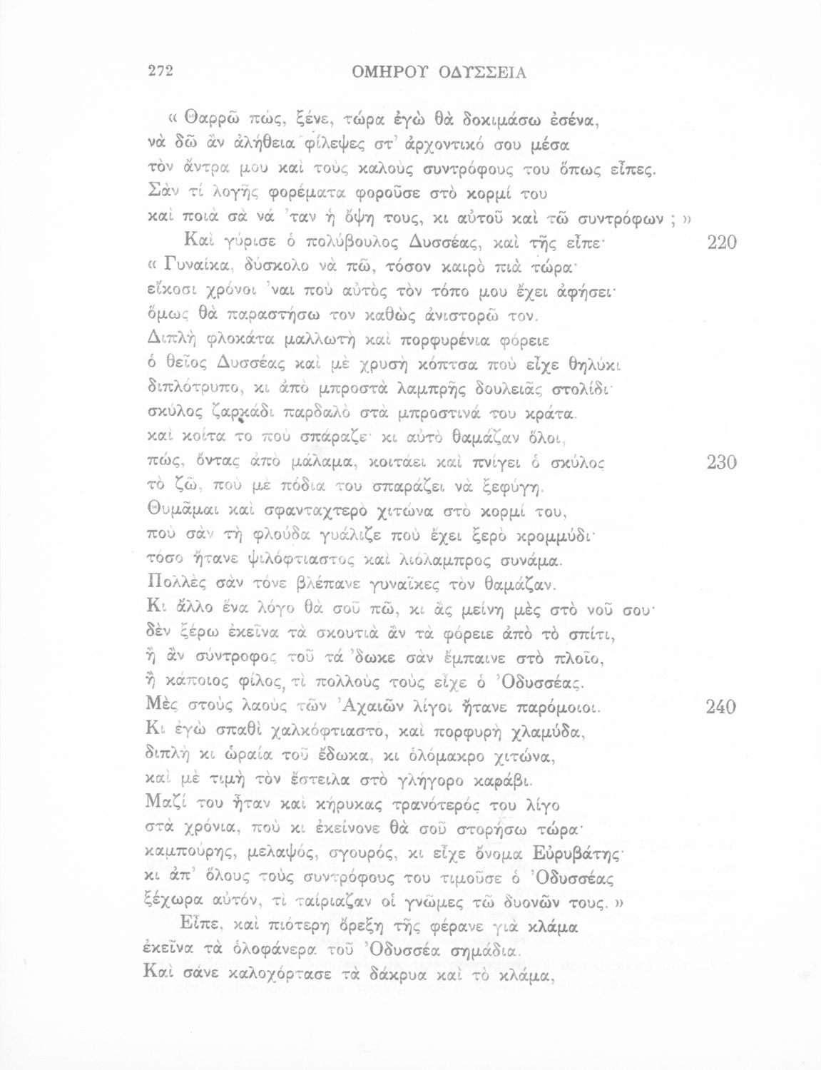 Σχολικό εγχειρίδιο του Γυμνασίου για το μάθημα των Αρχαίων Ελληνικών. Πρόκειται για το κείμενο της Οδύσσειας μεταφρασμένο στο τέλος περιλαμβάνει λεξιλόγιο.