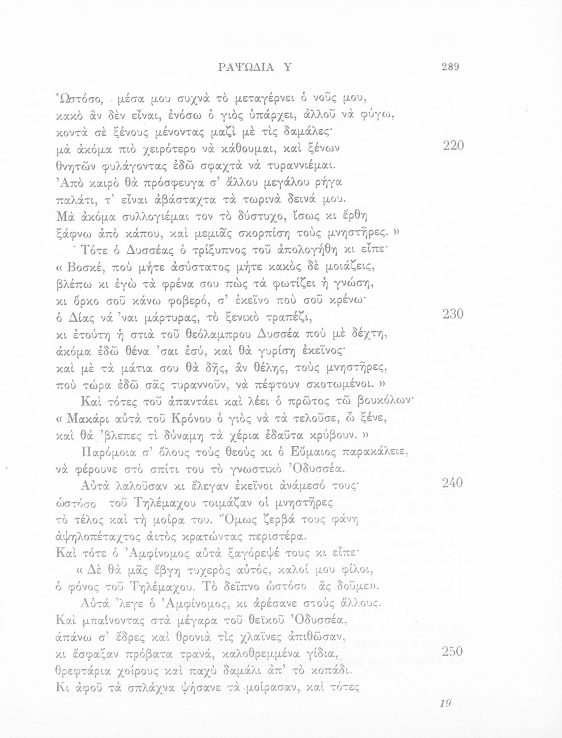Παιδαγωγικό βοήθημα Αρχαίων Ελληνικών που περιλαμβάνει μετάφραση της Ομήρου Οδύσσειας στη νέα ελληνική, εισαγωγή στην επική ποίηση και στην Οδύσσεια, περιλήψεις και σημειώσεις.