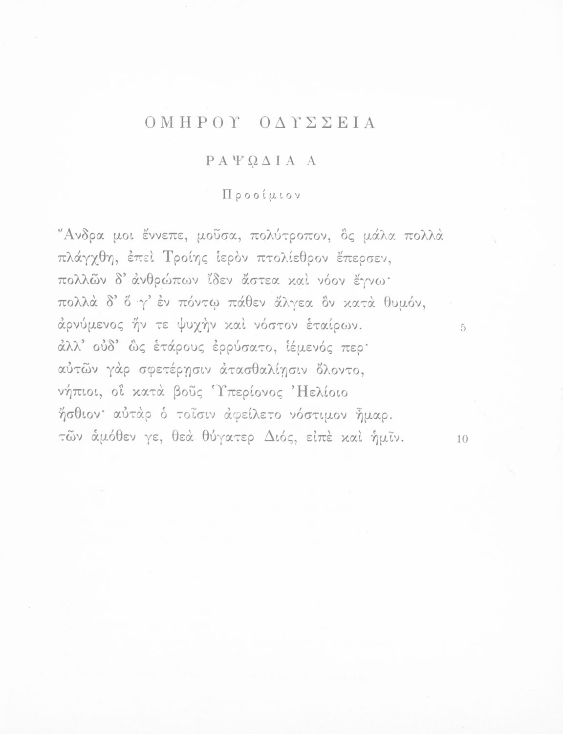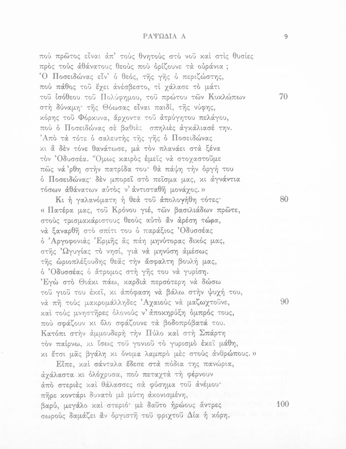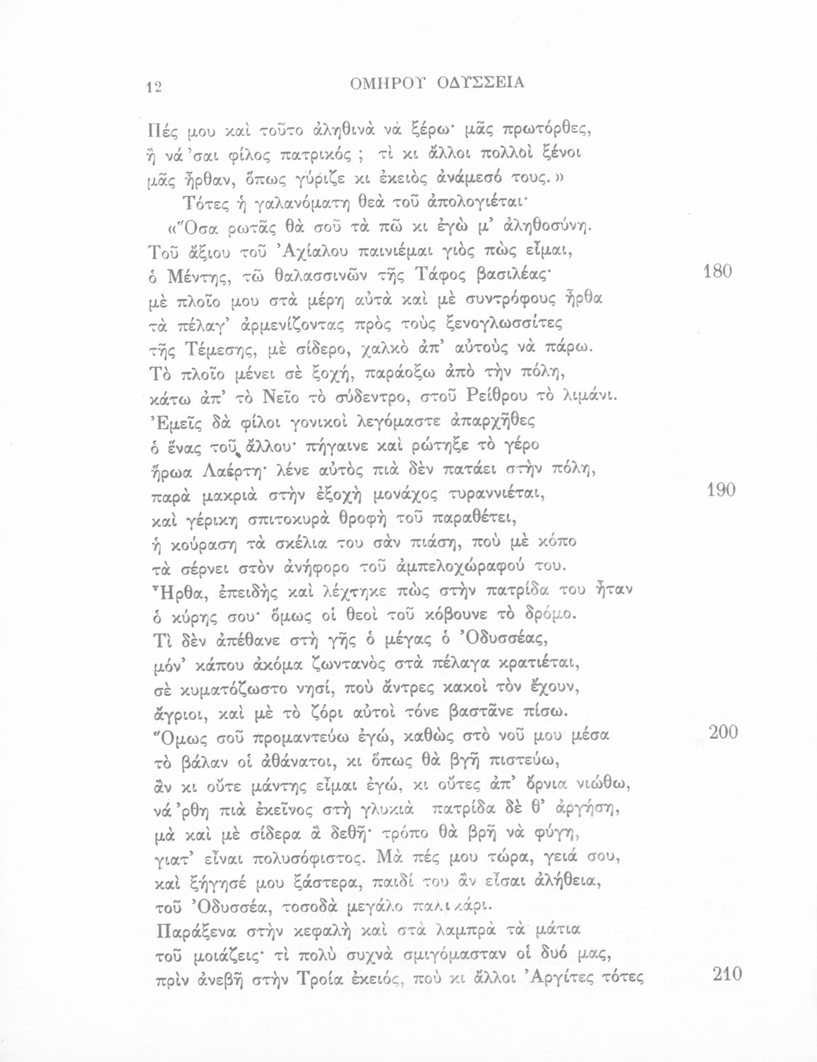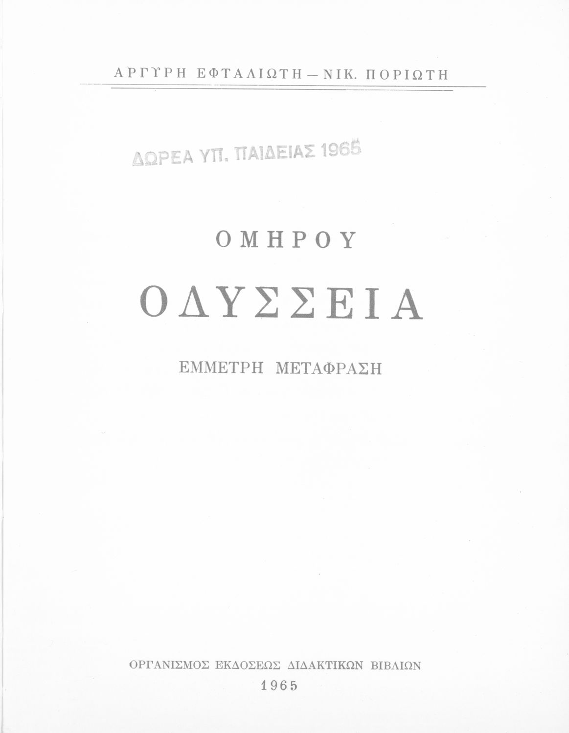 Σχολικό εγχειρίδιο Αρχαίων Ελληνικών για τις τάξεις του Γυμνασίου. Βιβλίο Οδύσσειας του Ομήρου για το Γυμνάσιο. Το προοίμιο αναφέρεται στο πρωτότυπο κείμενο. Η μετάφραση είναι έμμετρη.