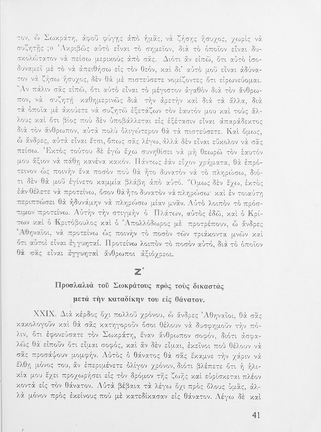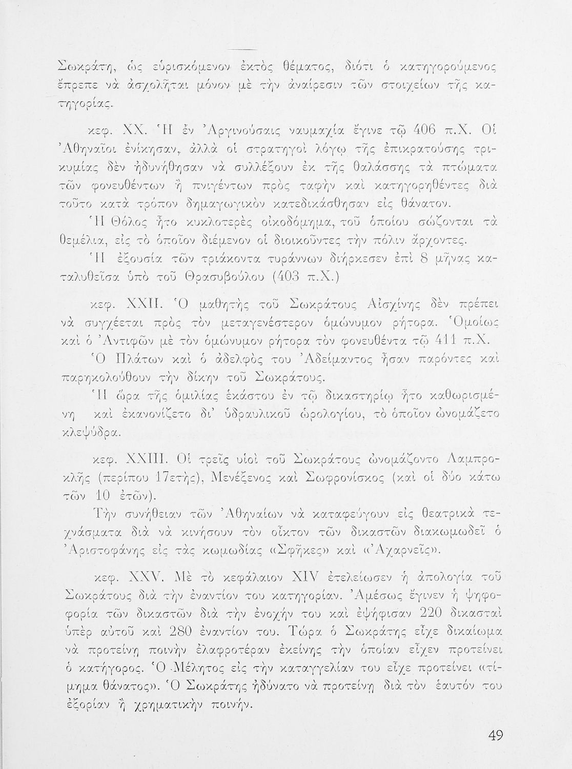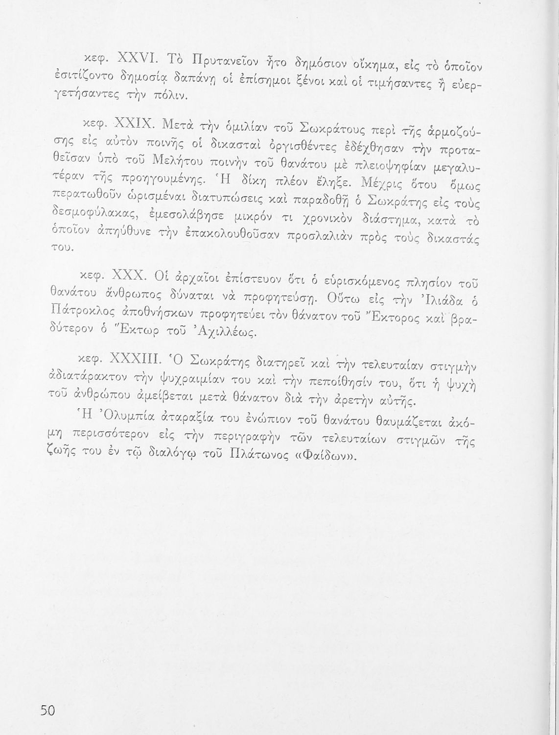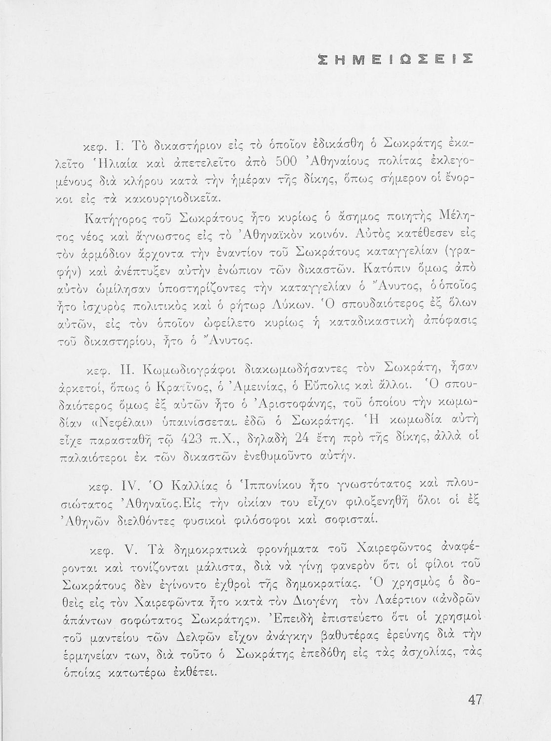 Σχολικό εγχειρίδιο Αρχαίων Ελληνικών που περιλαμβάνει έργο του Πλάτωνα και σημειώσεις του συγγραφέα. Τα κείμενα είναι μετάφραση από το πρωτότυπο. Στο βιβλίο υπάρχει το σύμβολο της επταετίας.