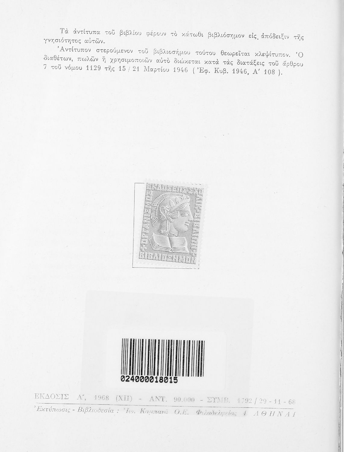 Εκδότης: Οργανισμός Εκδόσεως Διδακτικών Βιβλίων Έτος έκδοσης: 1968 Τόπος έκδοσης: Αθήνα Έκδοση: 1η Υπουργική απόφαση / Σύμβαση: 1792/29-11-1968 Έτος έγκρισης: 1968 |
