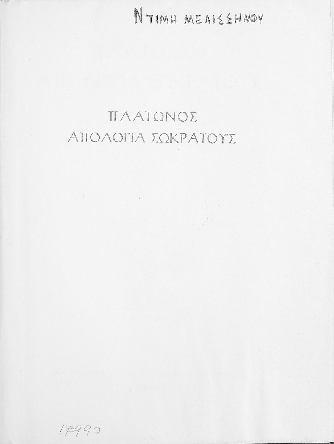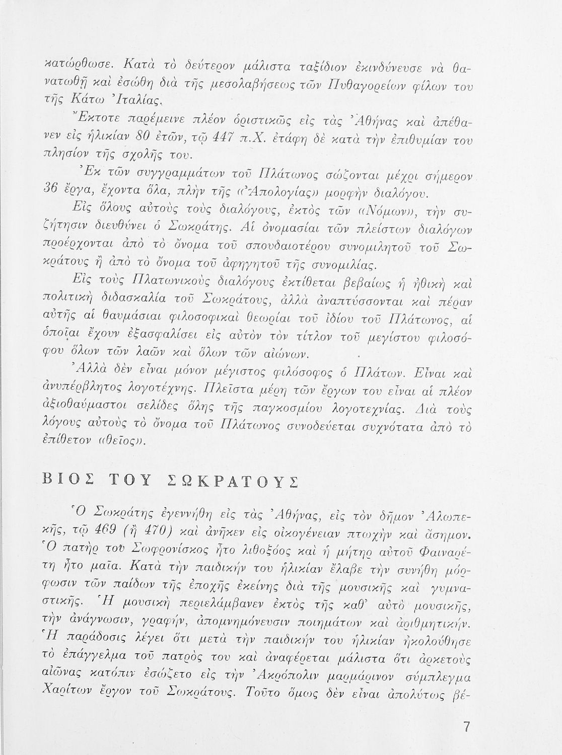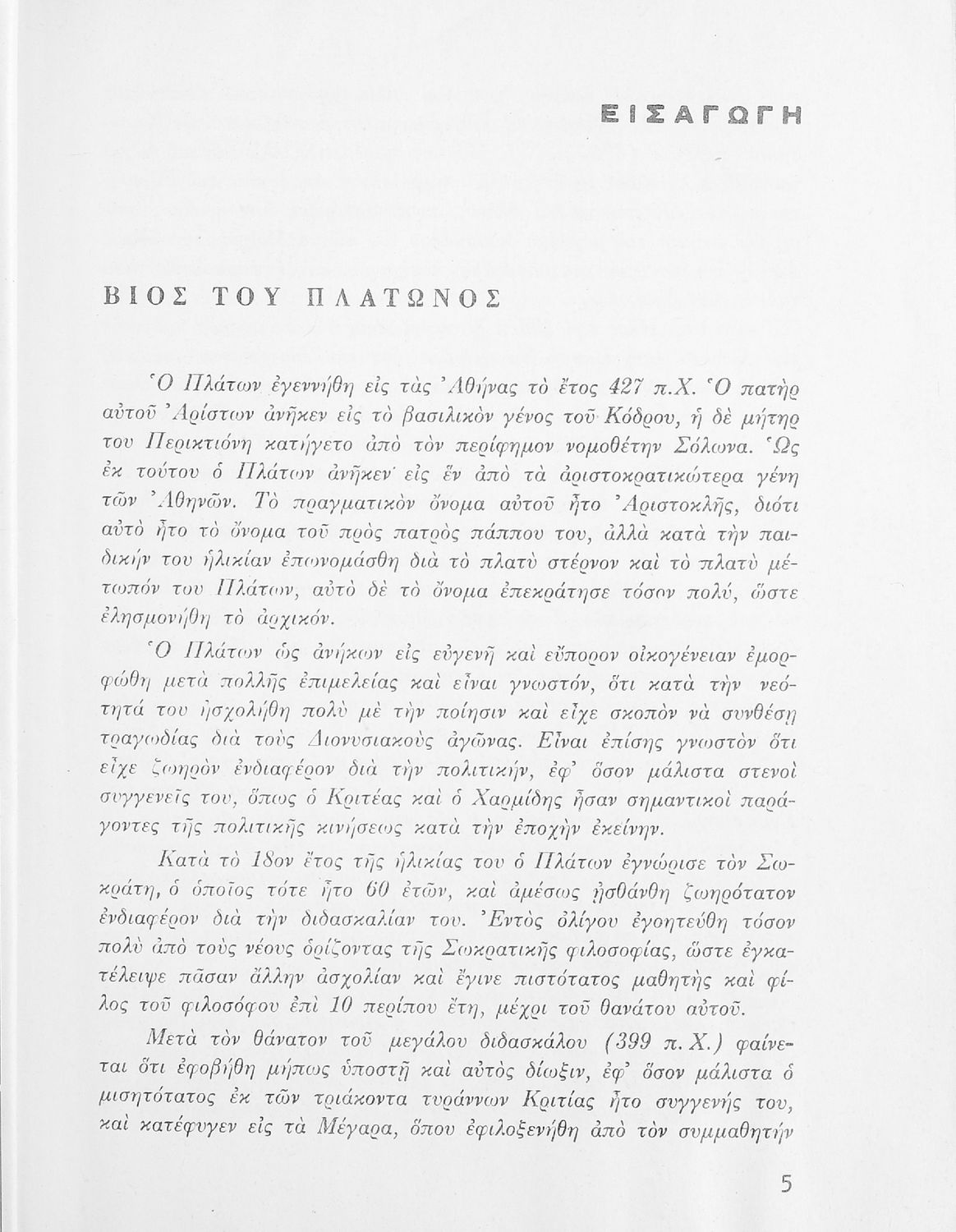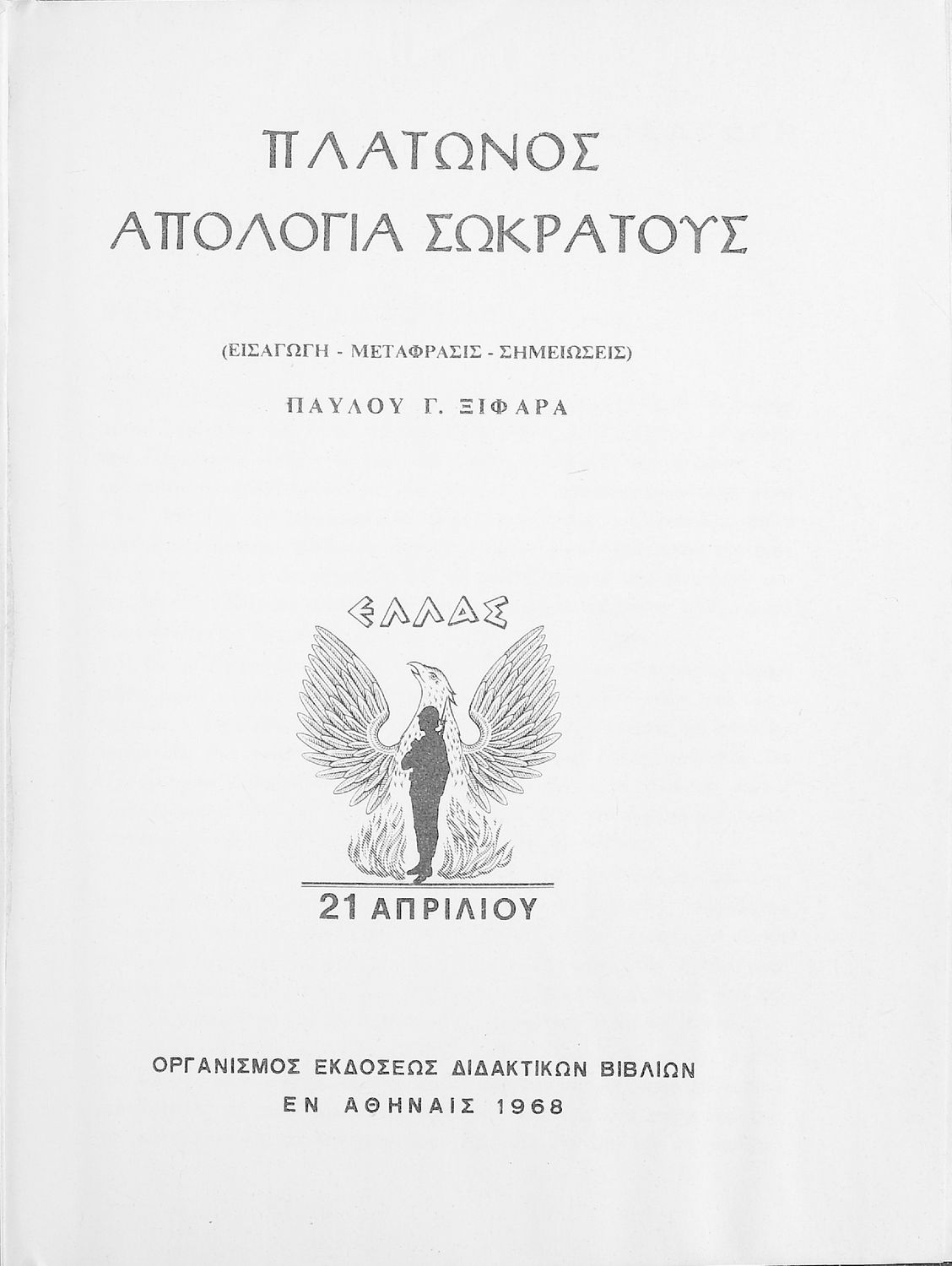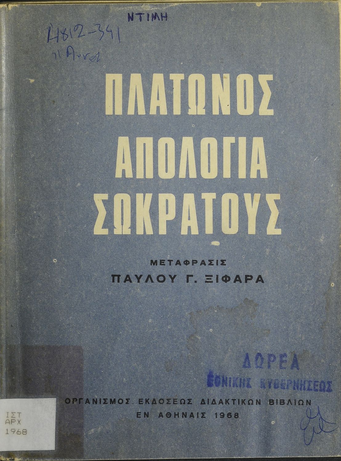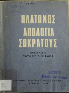 Σχολικό εγχειρίδιο Αρχαίων Ελληνικών που περιλαμβάνει έργο του Πλάτωνα και σημειώσεις του συγγραφέα. Τα κείμενα είναι μετάφραση από το πρωτότυπο. Στο βιβλίο υπάρχει το σύμβολο της επταετίας.