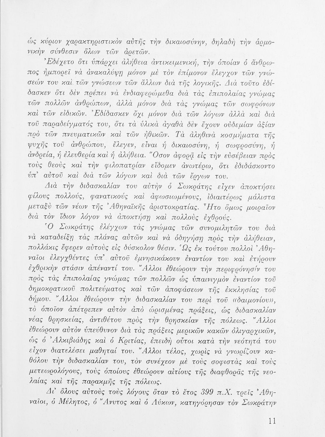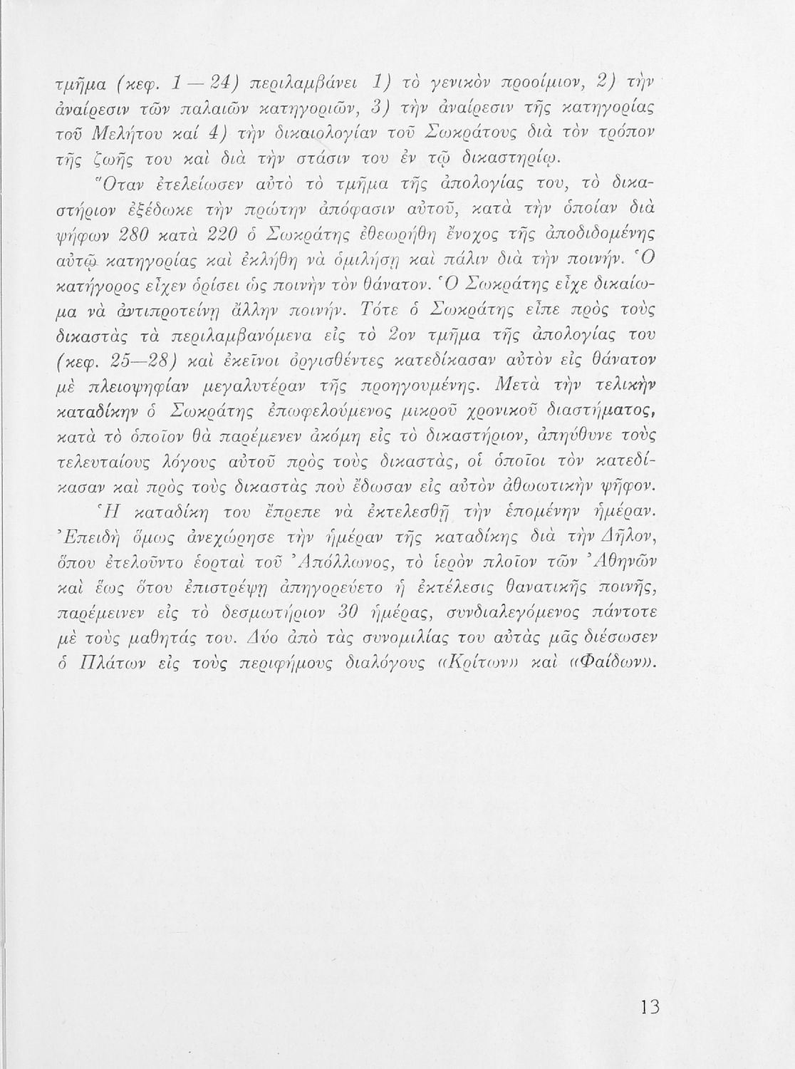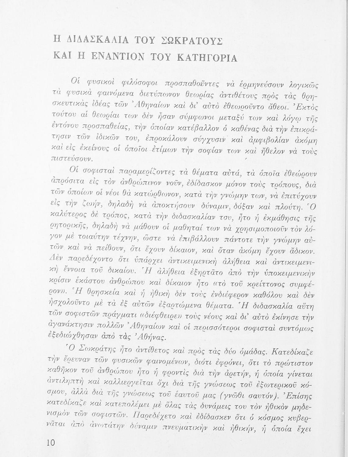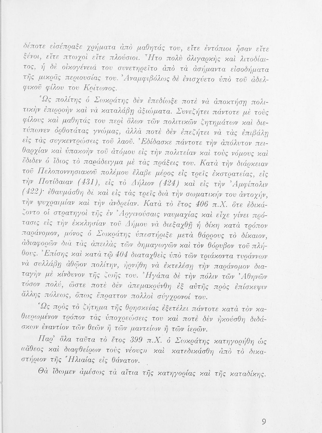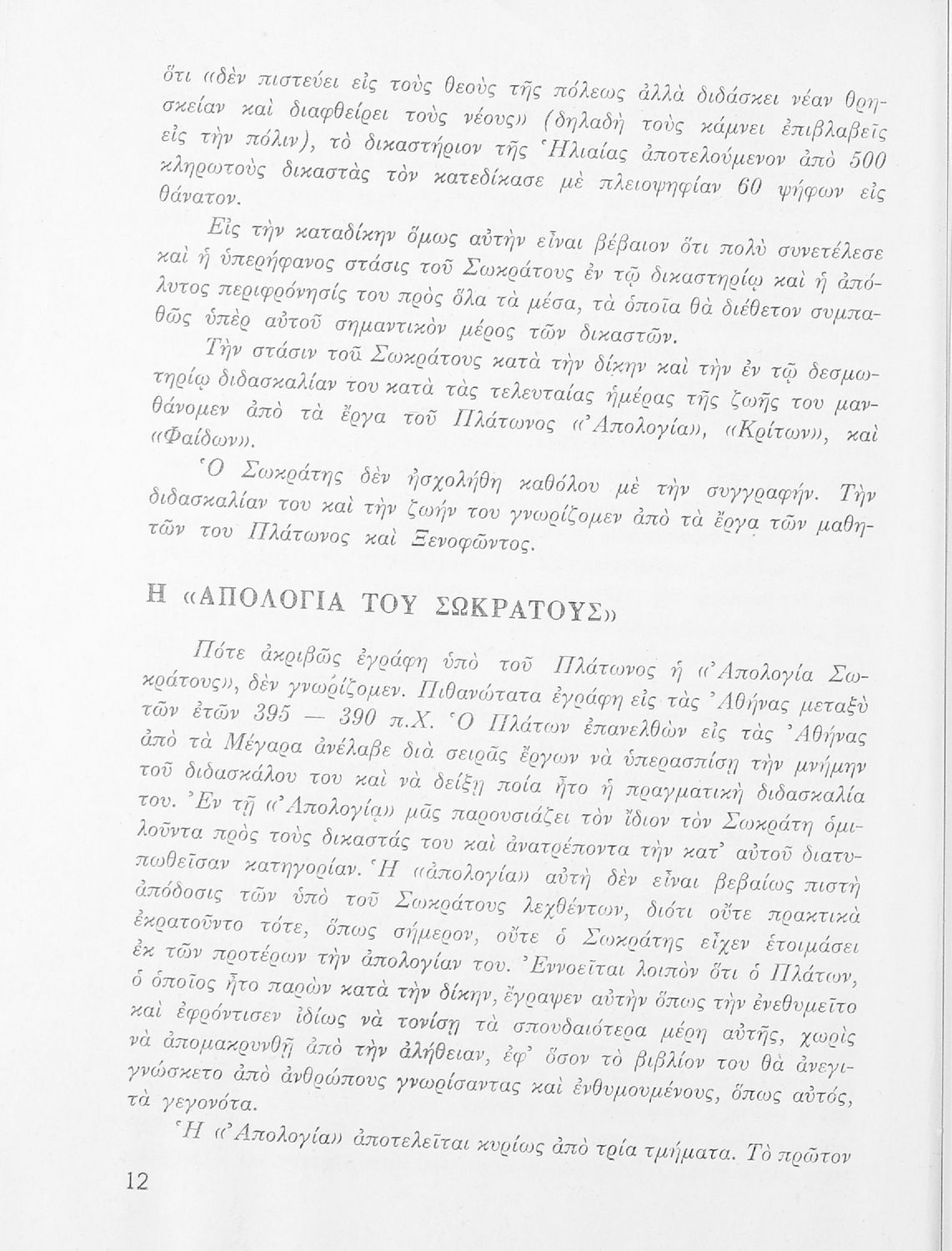 Σχολικό εγχειρίδιο Αρχαίων Ελληνικών που περιλαμβάνει έργο του Πλάτωνα και σημειώσεις του συγγραφέα. Τα κείμενα είναι μετάφραση από το πρωτότυπο. Στο βιβλίο υπάρχει το σύμβολο της επταετίας.