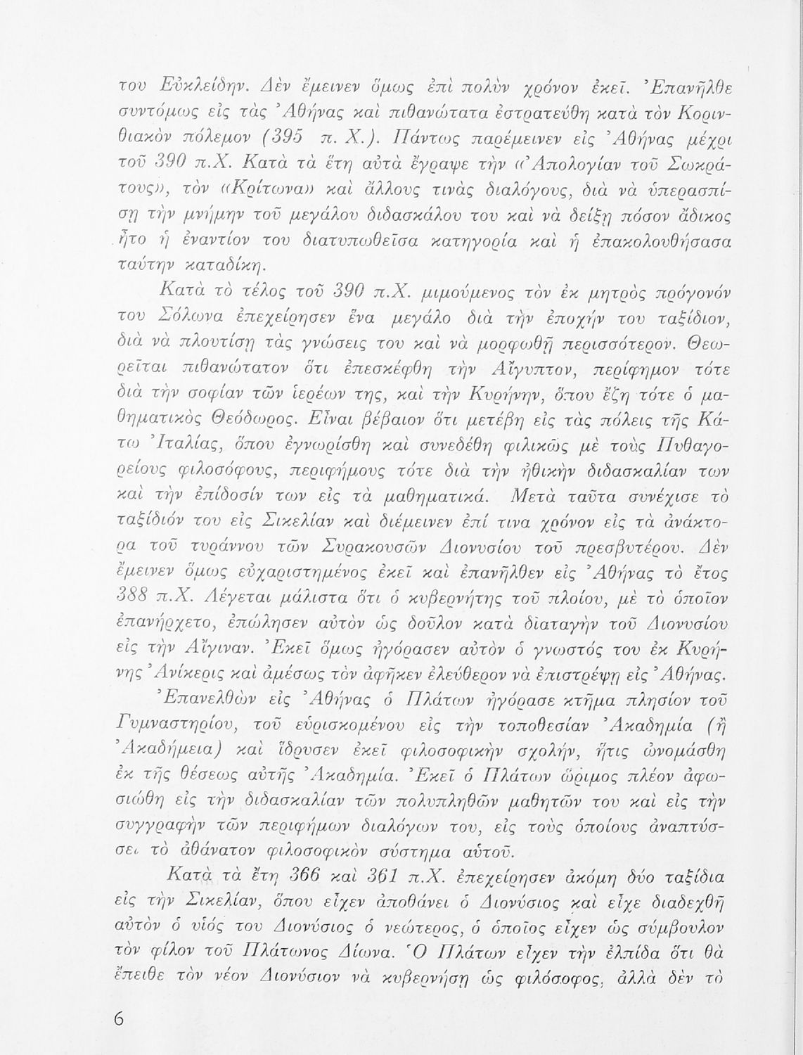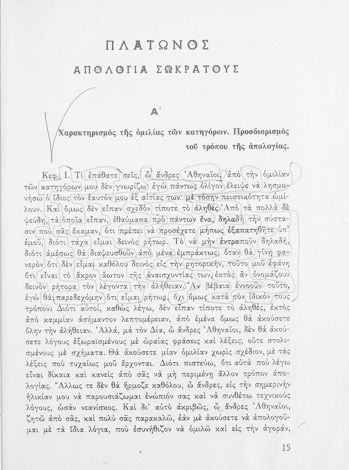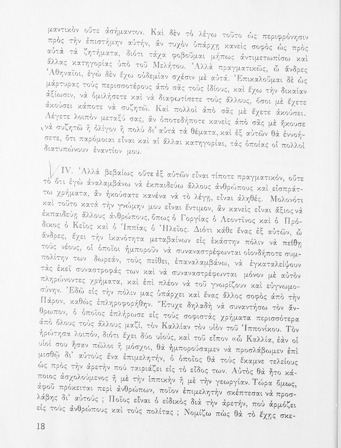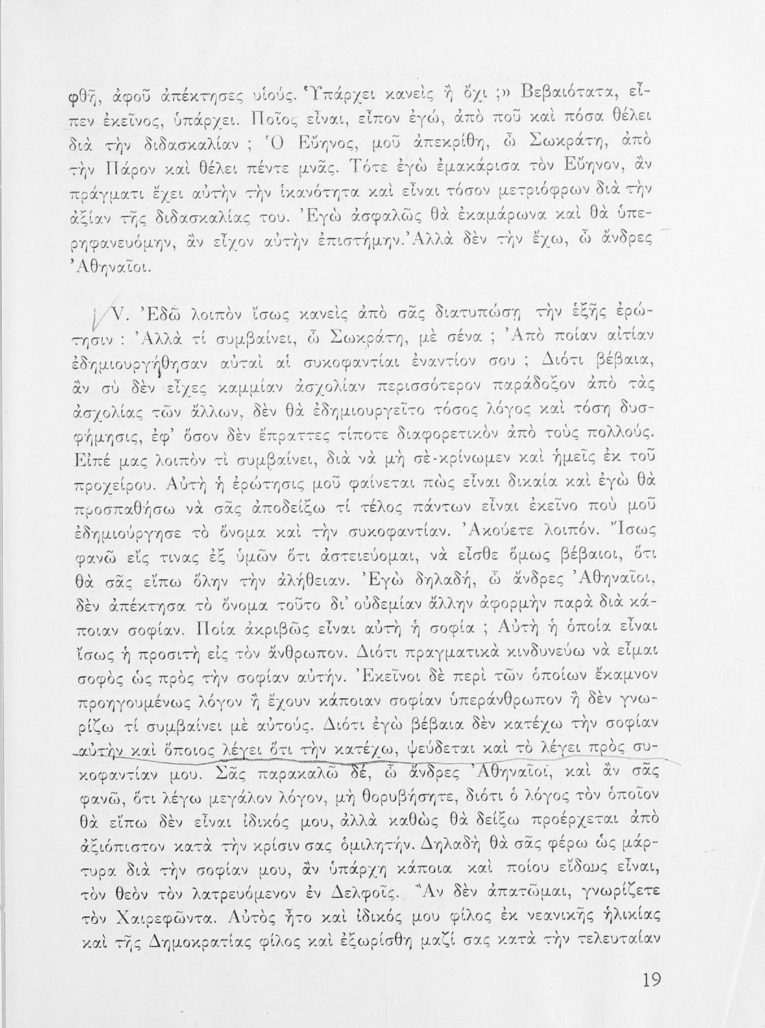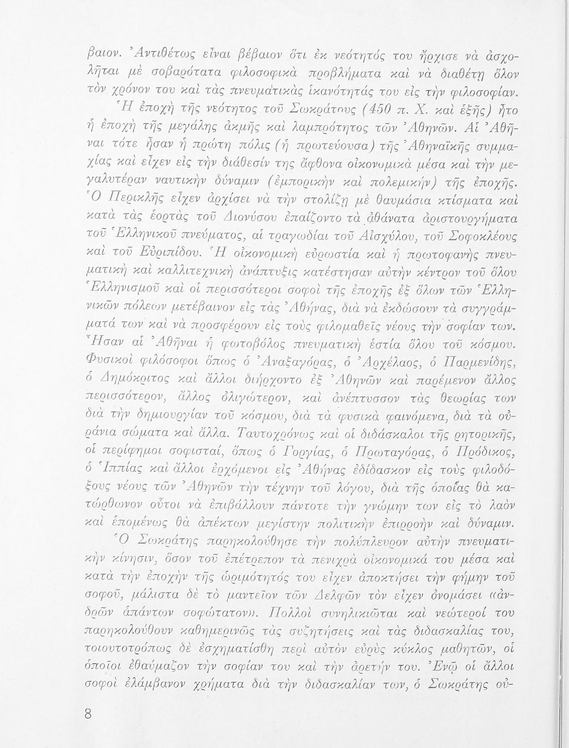 Σχολικό εγχειρίδιο Αρχαίων Ελληνικών που περιλαμβάνει έργο του Πλάτωνα και σημειώσεις του συγγραφέα. Τα κείμενα είναι μετάφραση από το πρωτότυπο. Στο βιβλίο υπάρχει το σύμβολο της επταετίας.