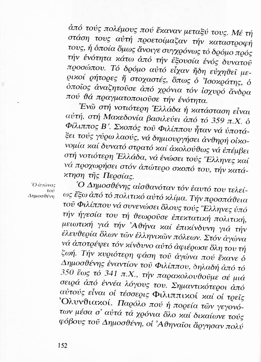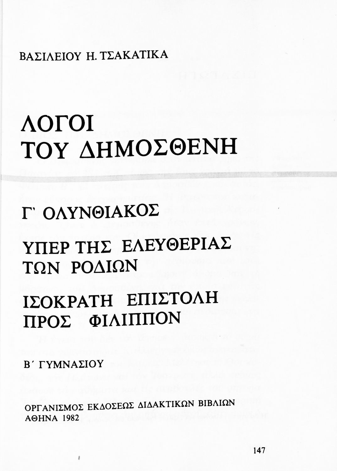 Σχολικό εγχειρίδιο Αρχαίων Ελληνικών Β΄ Γυμνασίου που περιέχει τους Λόγους του Δημοσθένη Φιλιππικός Α΄ και Γ΄, και ερμηνευτικές και πραγματολογικές παρατηρήσεις.