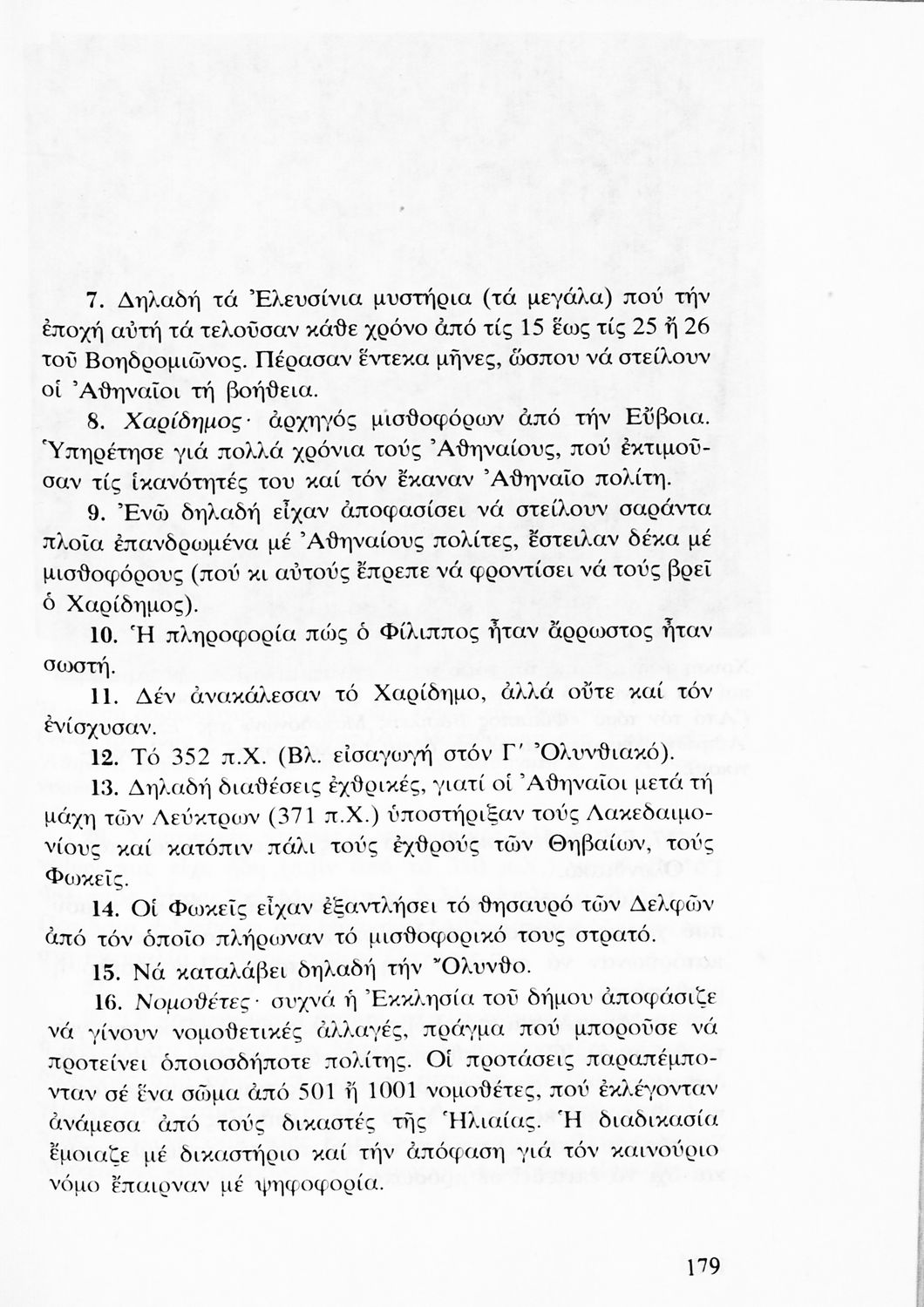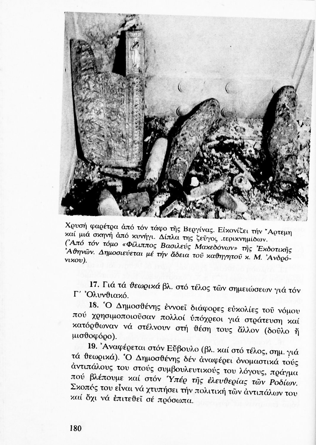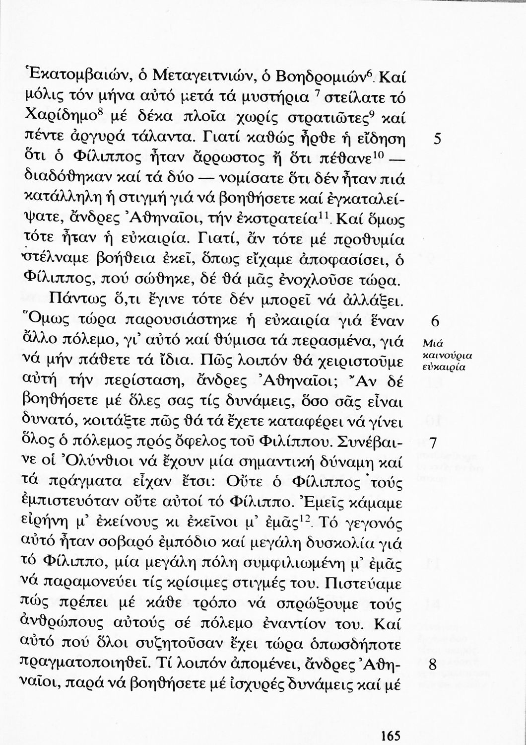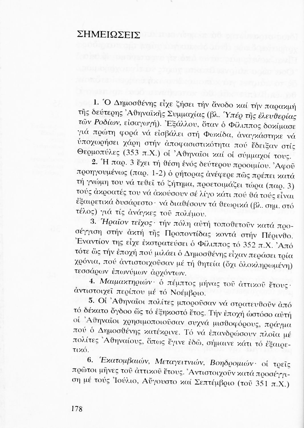 Σχολικό εγχειρίδιο Αρχαίων Ελληνικών Β΄ Γυμνασίου που περιέχει τους Λόγους του Δημοσθένη Φιλιππικός Α΄ και Γ΄, και ερμηνευτικές και πραγματολογικές παρατηρήσεις.