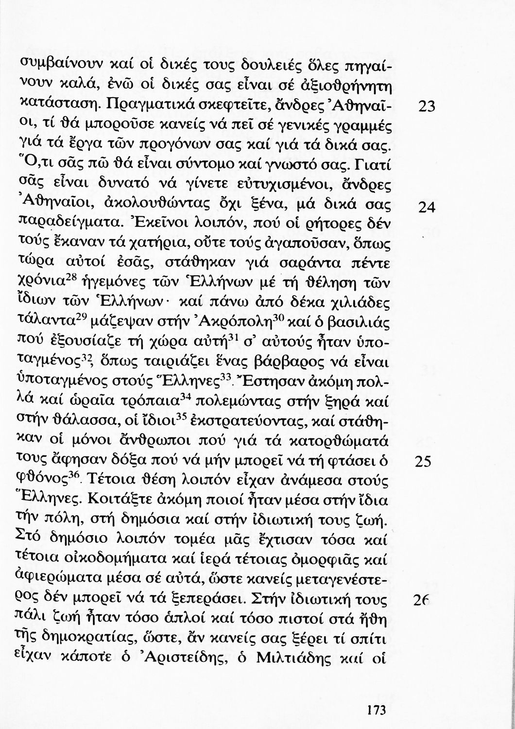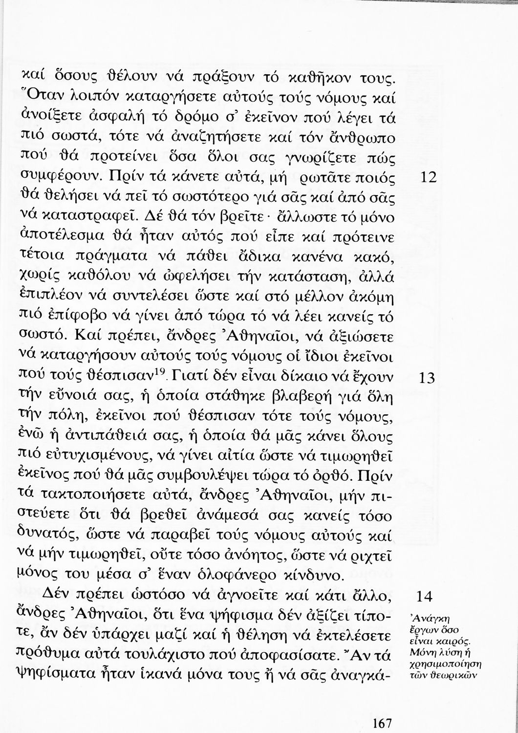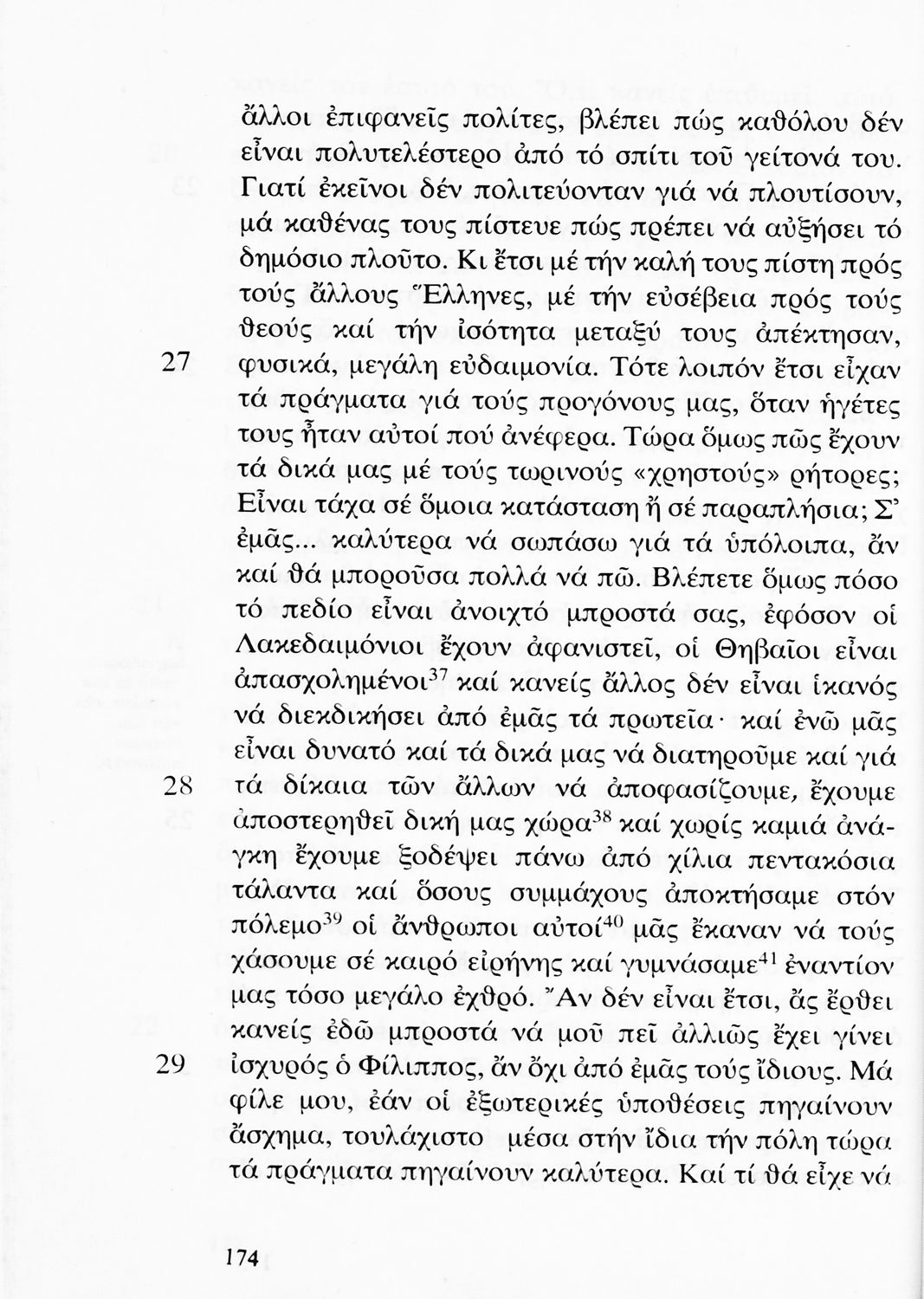 Σχολικό εγχειρίδιο Αρχαίων Ελληνικών για τη Β΄ Γυμνασίου που περιλαμβάνει Λόγους των Λυσία, Ισοκράτη και Δημοσθένη και αποσπάσματα από τα Ελληνικά του Ξενοφώντα σε μετάφραση, εισαγωγή στη ζωή και το έργο τους και ερμηνευτικές σημειώσεις.