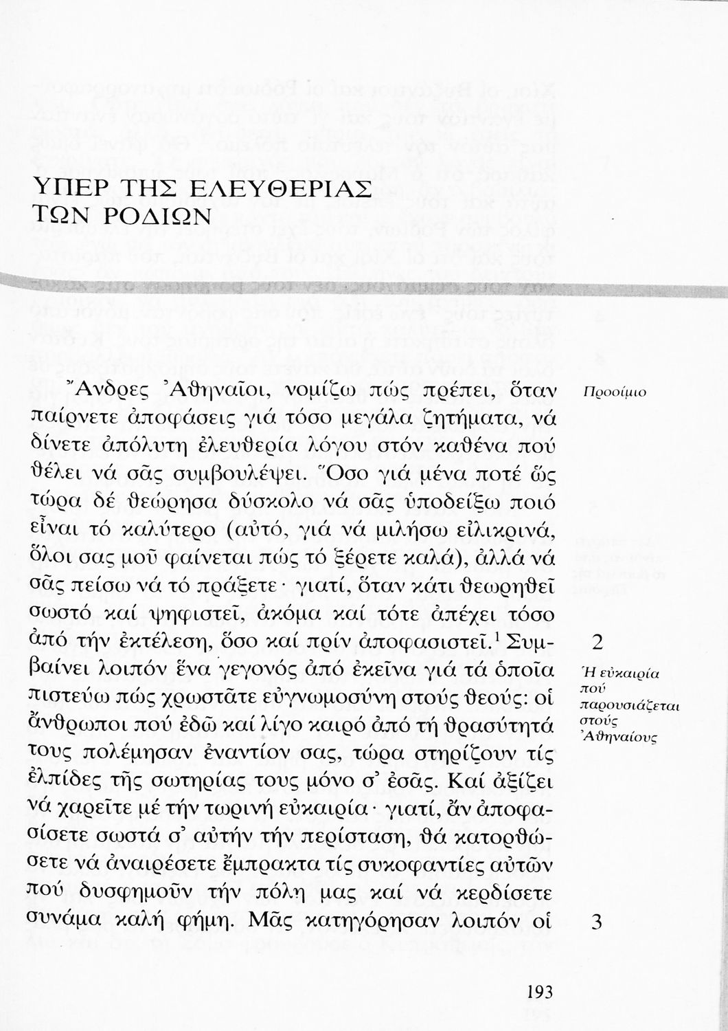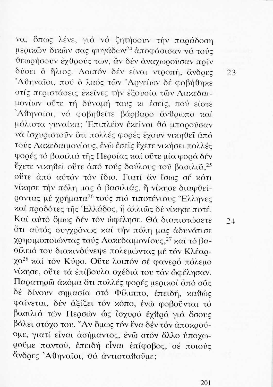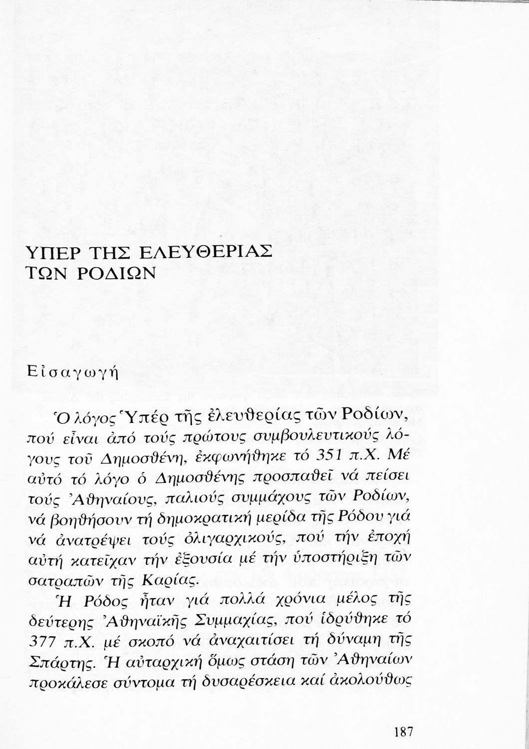Σχολικό εγχειρίδιο Αρχαίων Ελληνικών για τη Β΄ Γυμνασίου που περιλαμβάνει Λόγους των Λυσία, Ισοκράτη και Δημοσθένη και αποσπάσματα από τα Ελληνικά του Ξενοφώντα σε μετάφραση, εισαγωγή στη ζωή και το έργο τους και ερμηνευτικές σημειώσεις.