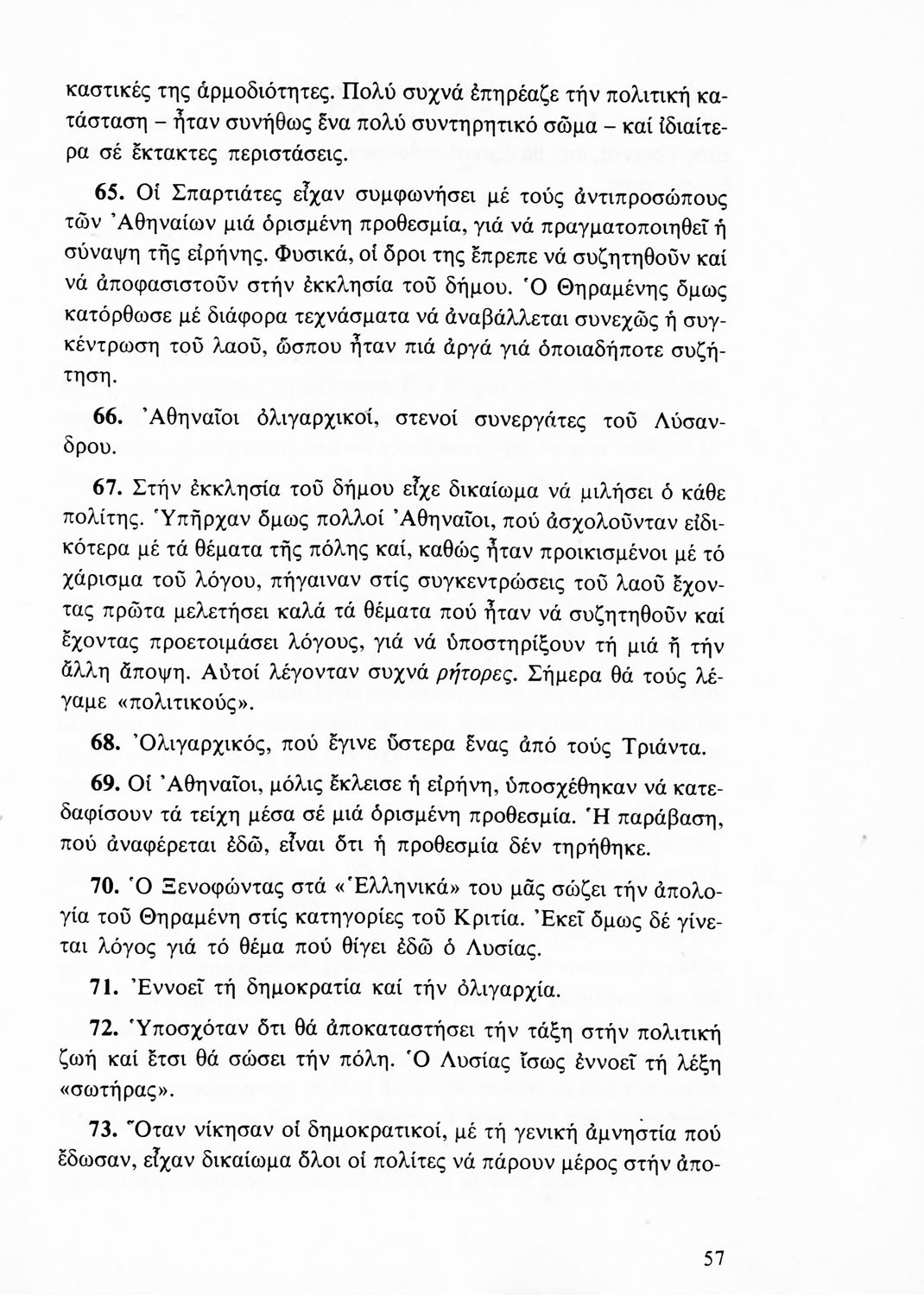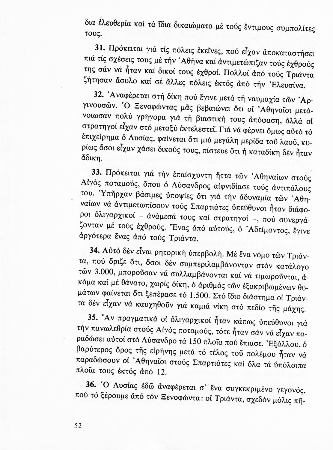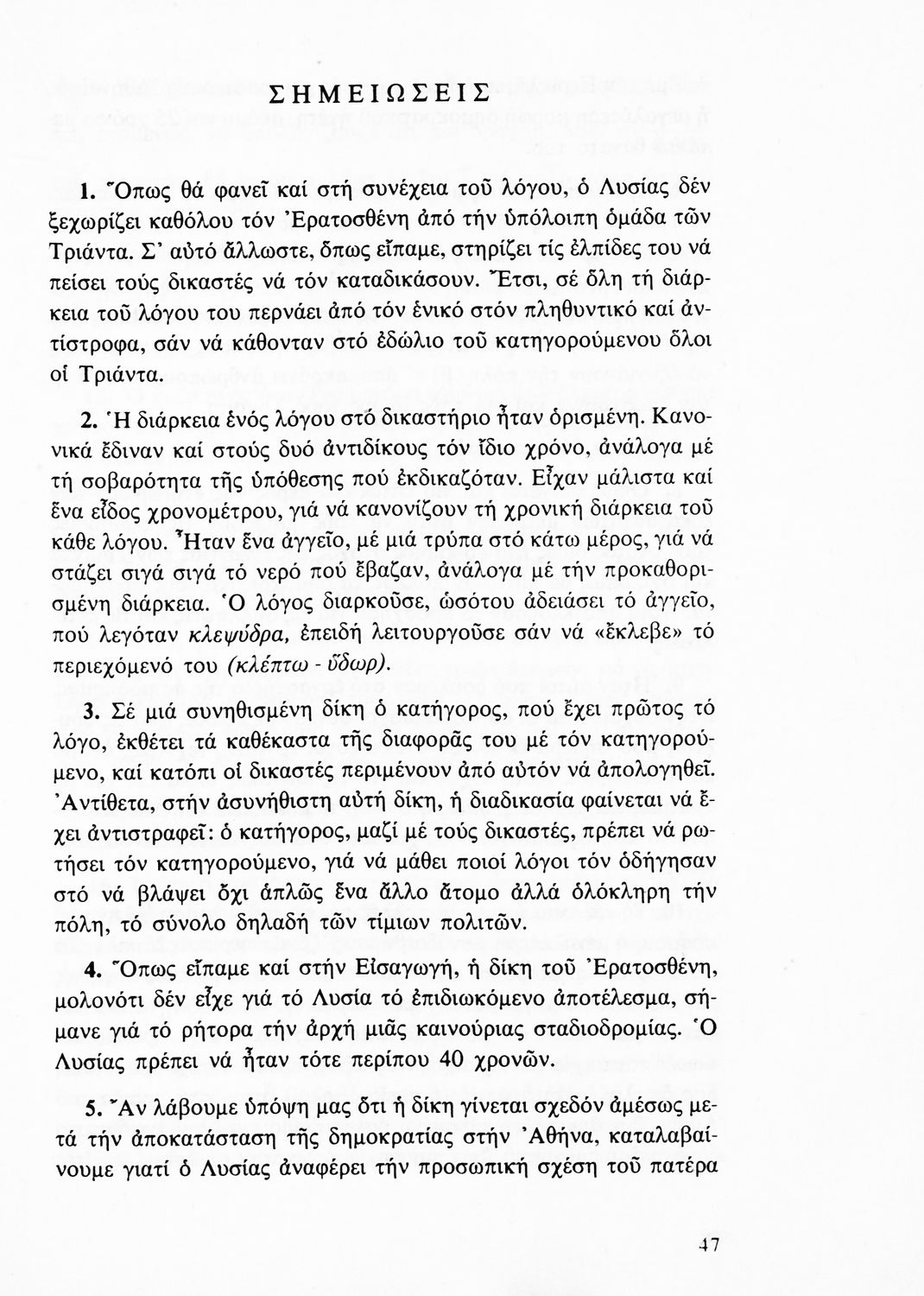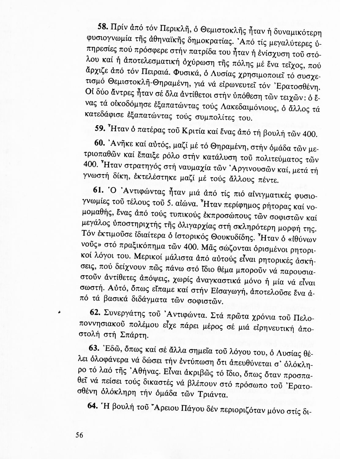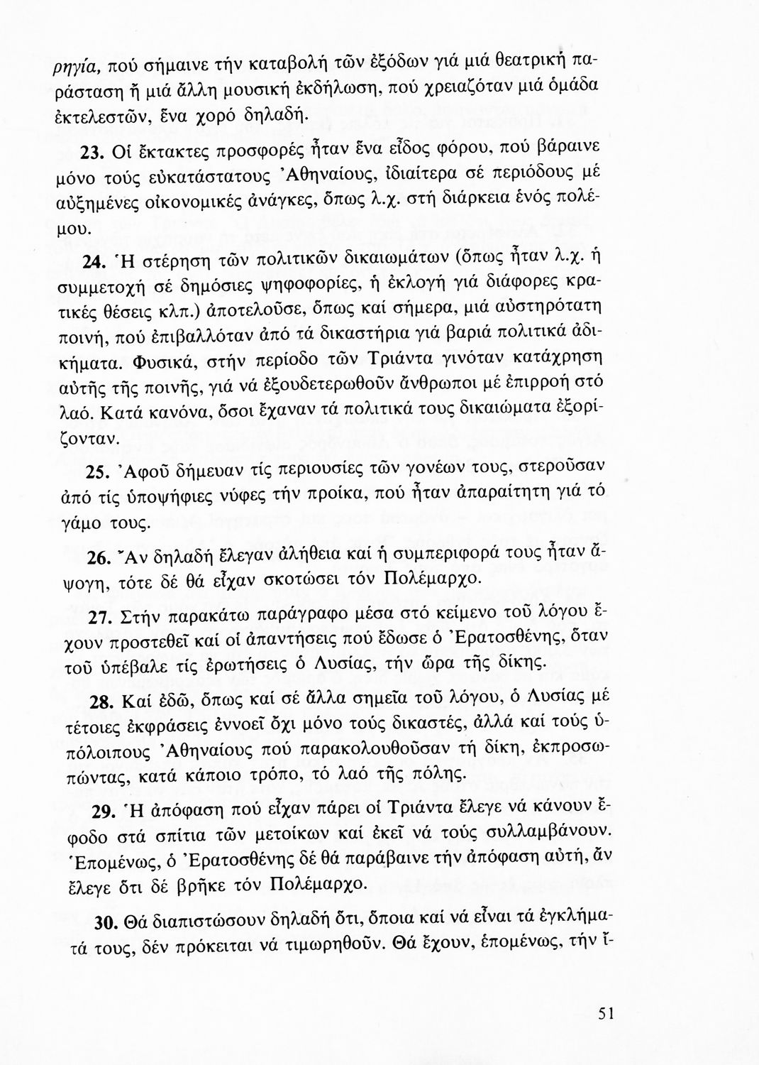 Σχολικό εγχειρίδιο Αρχαίων Ελληνικών για τη Β΄ Γυμνασίου που περιλαμβάνει Λόγους των Λυσία, Ισοκράτη και Δημοσθένη και αποσπάσματα από τα Ελληνικά του Ξενοφώντα σε μετάφραση, εισαγωγή στη ζωή και το έργο τους και ερμηνευτικές σημειώσεις.