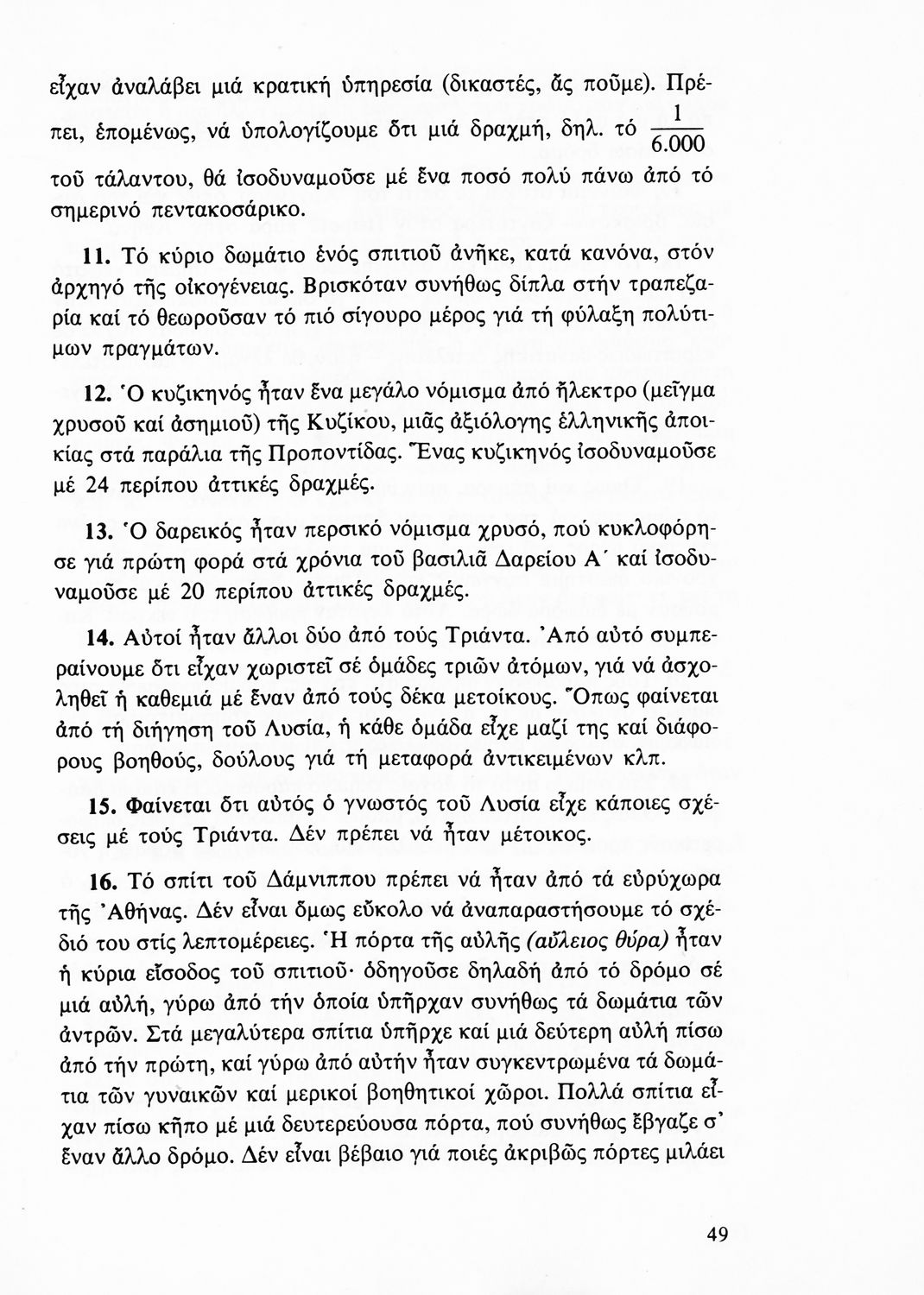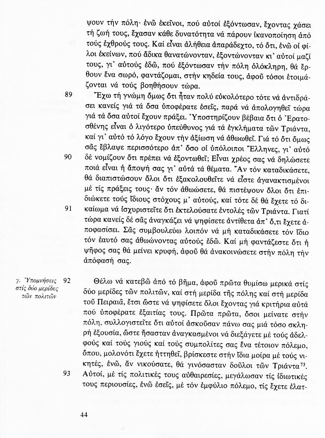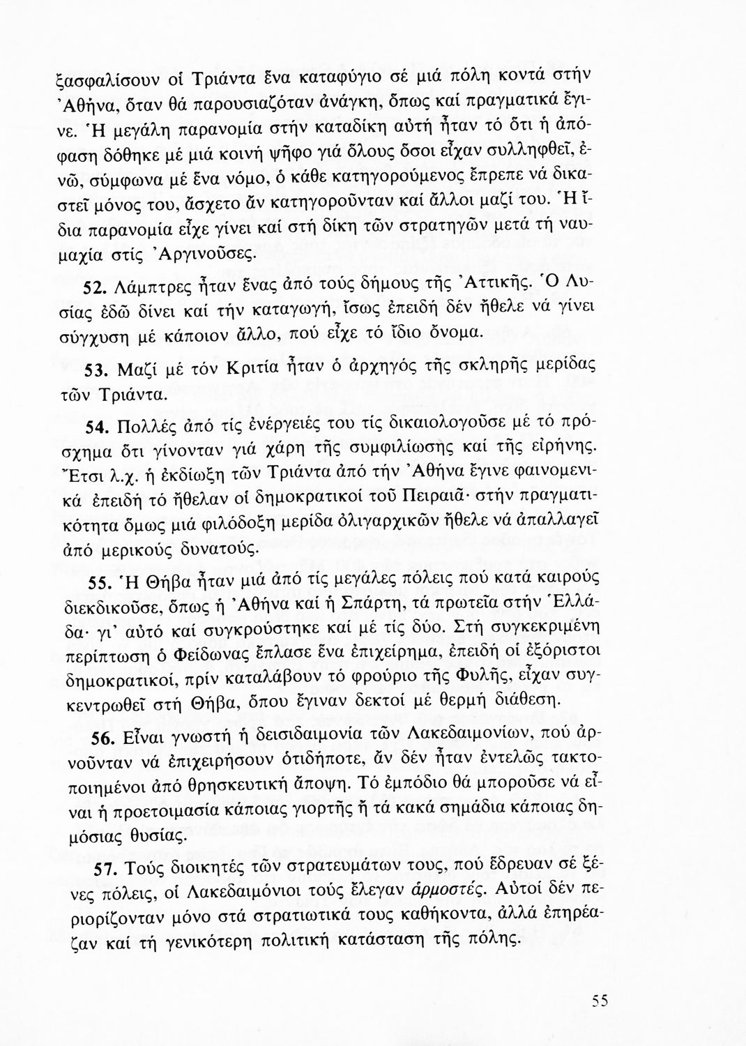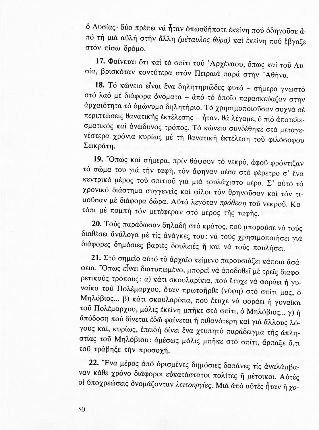 Σχολικό εγχειρίδιο Αρχαίων Ελληνικών για τη Β΄ Γυμνασίου που περιλαμβάνει Λόγους των Λυσία, Ισοκράτη και Δημοσθένη και αποσπάσματα από τα Ελληνικά του Ξενοφώντα σε μετάφραση, εισαγωγή στη ζωή και το έργο τους και ερμηνευτικές σημειώσεις.