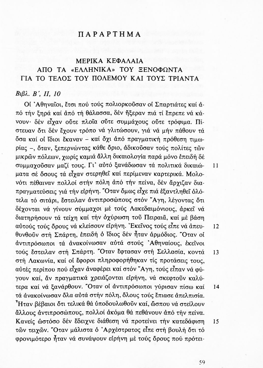 Σχολικό εγχειρίδιο Αρχαίων Ελληνικών Β΄ Γυμνασίου που περιλαμβάνει εισαγωγή στα Ελληνικά του Ξενοφώντα, το 3ο και το 4ο βιβλίο από τα Ελληνικά, ερμηνευτικές σημειώσεις και χωρογραφικό πίνακα της περιοχής.