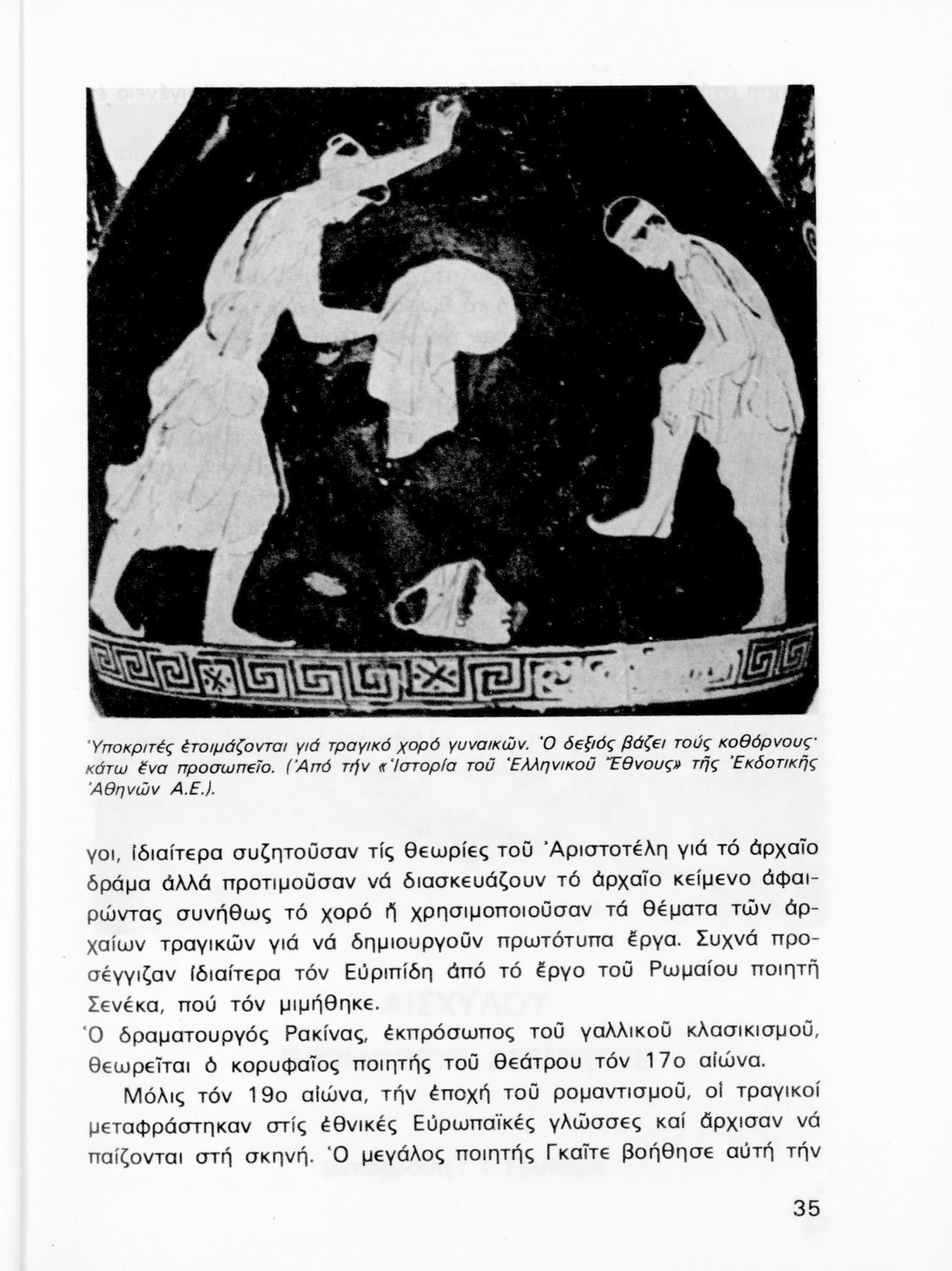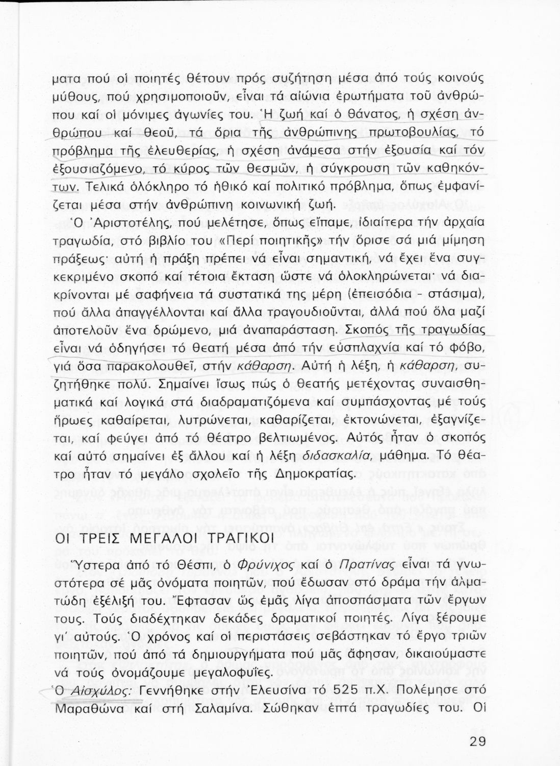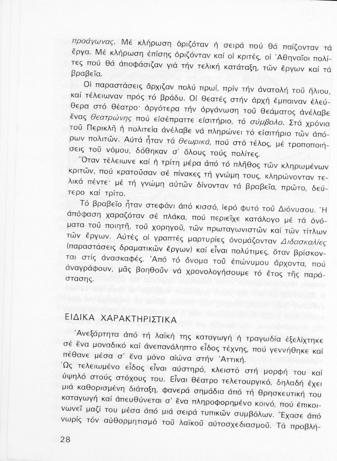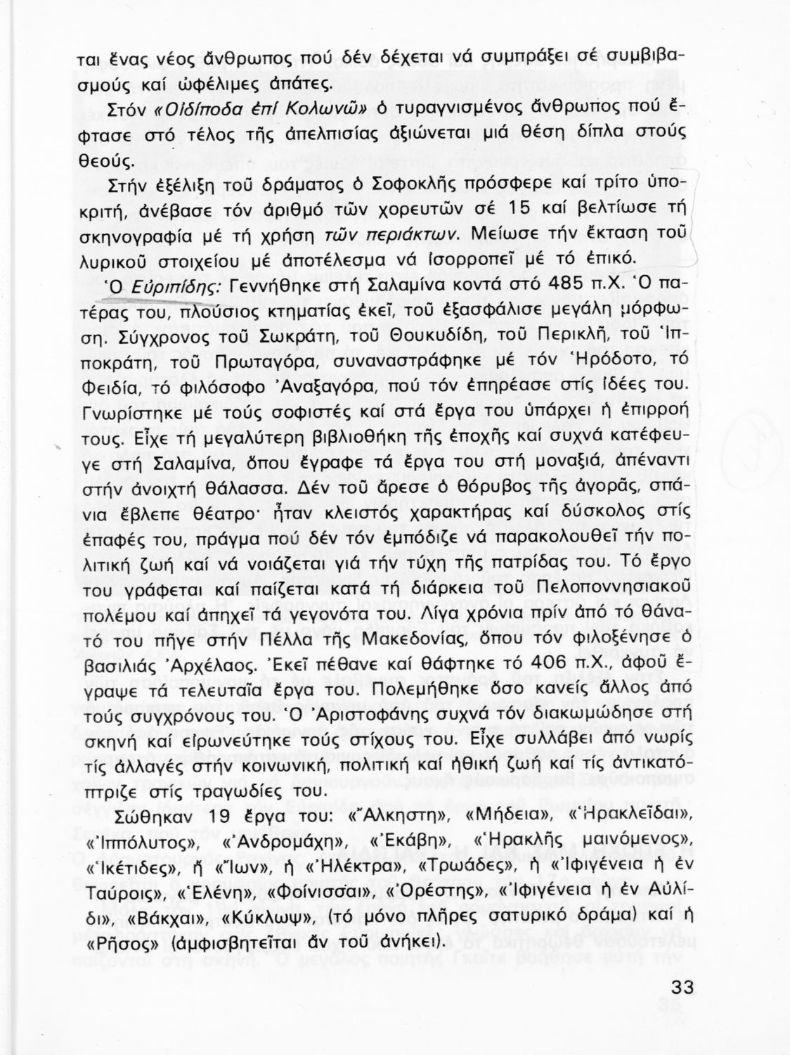 Σχολικό εγχειρίδιο Αρχαίων Ελληνικών Γ΄ Γυμνασίου που περιλαμβάνει εισαγωγή στη δραματική ποίηση, το αρχαίο θέατρο και την τραγωδία, μετάφραση των έργων Προμηθέας Δεσμώτης του Αισχύλου, Αντιγόνη του Σοφοκλή και Ιφιγένεια η εν Ταύροις του Ευριπίδη και ερμηνευτικά σχόλια.
