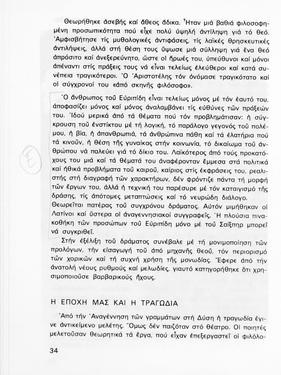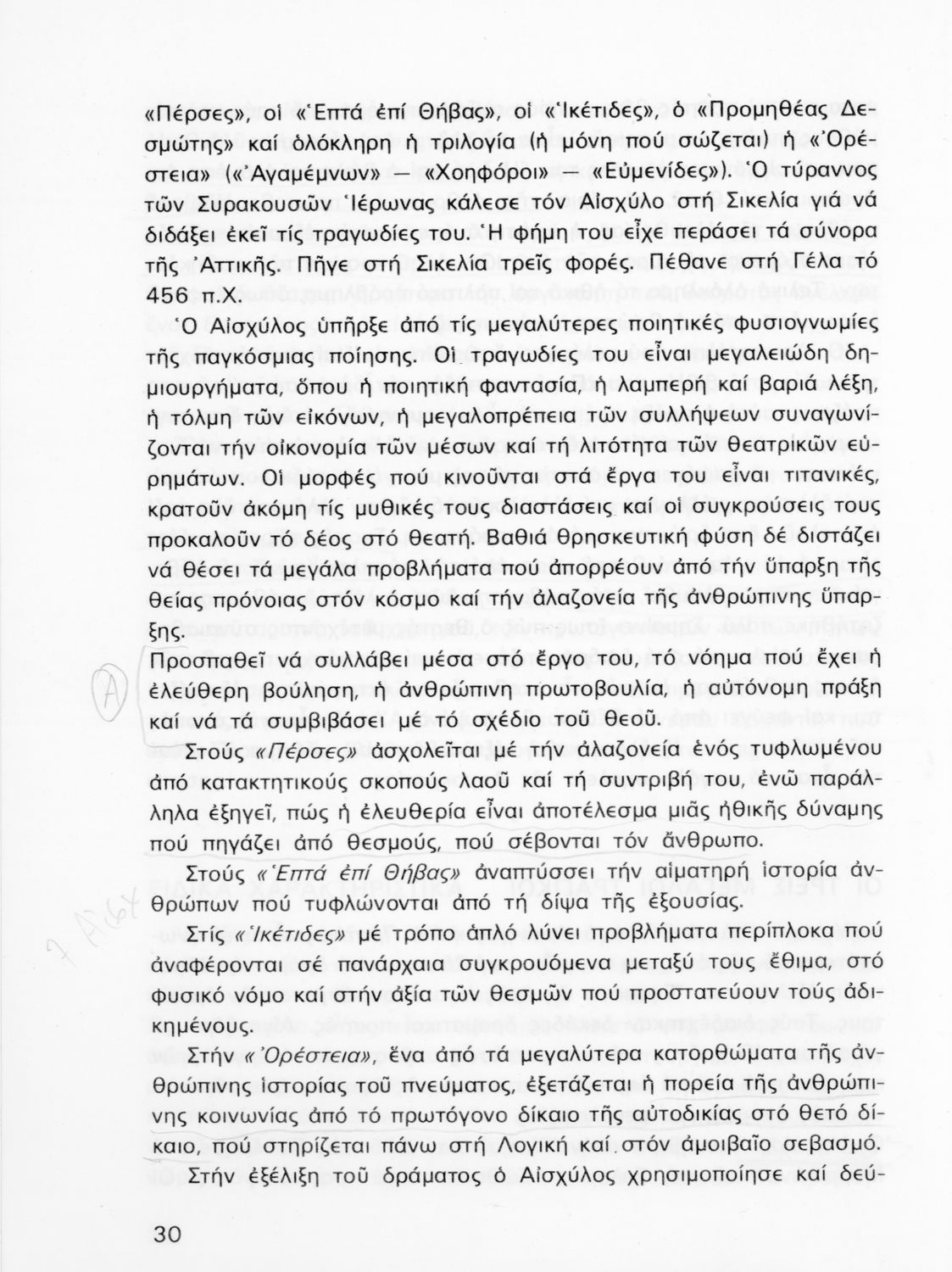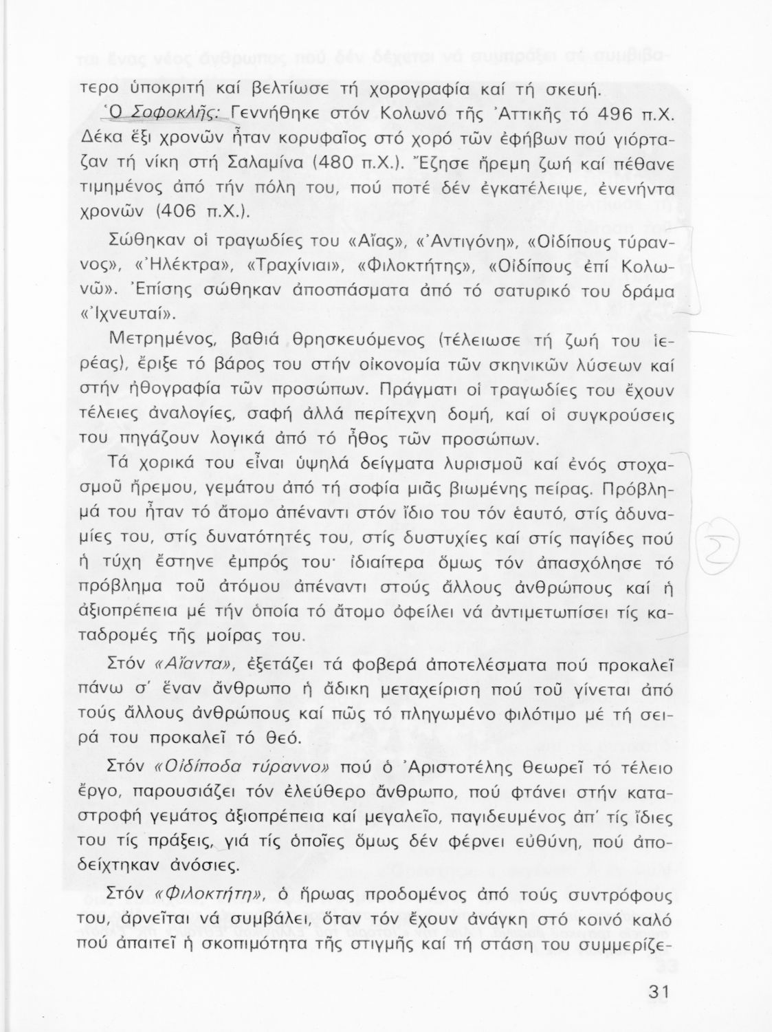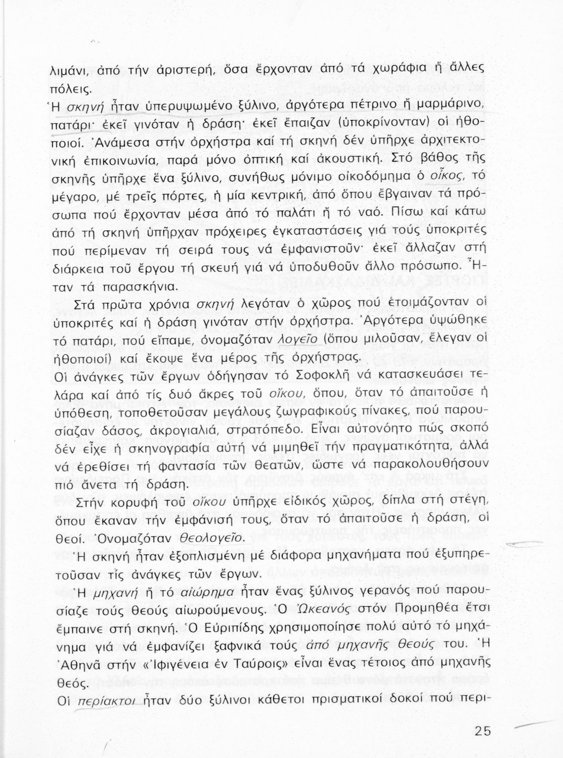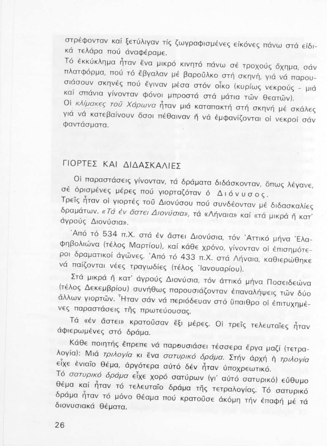 Σχολικό εγχειρίδιο Αρχαίων Ελληνικών Γ΄ Γυμνασίου που περιλαμβάνει εισαγωγή στη δραματική ποίηση, το αρχαίο θέατρο και την τραγωδία, μετάφραση των έργων Προμηθέας Δεσμώτης του Αισχύλου, Αντιγόνη του Σοφοκλή και Ιφιγένεια η εν Ταύροις του Ευριπίδη και ερμηνευτικά σχόλια.