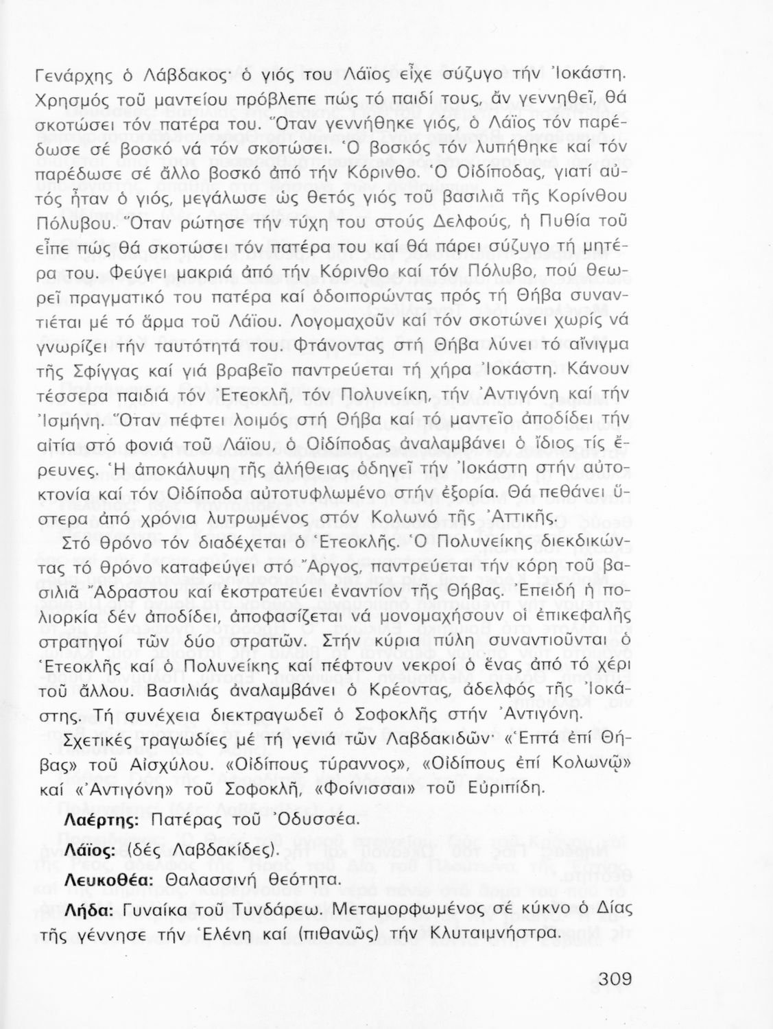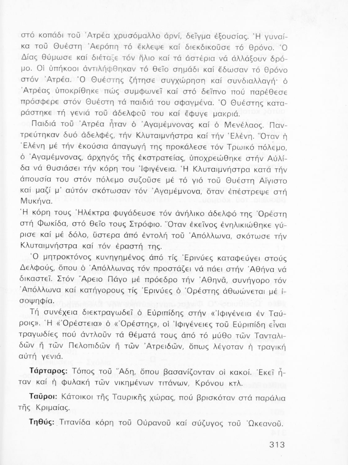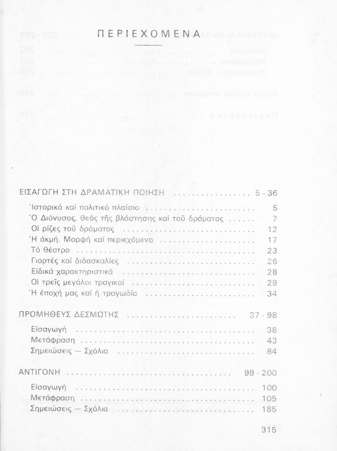 Σχολικό εγχειρίδιο Αρχαίων Ελληνικών Γ΄ Γυμνασίου που περιλαμβάνει εισαγωγή στη δραματική ποίηση, το αρχαίο θέατρο και την τραγωδία, μετάφραση των έργων Προμηθέας Δεσμώτης του Αισχύλου, Αντιγόνη του Σοφοκλή και Ιφιγένεια η εν Ταύροις του Ευριπίδη και ερμηνευτικά σχόλια.