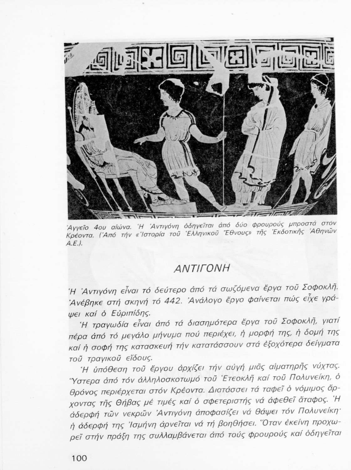 Σχολικό εγχειρίδιο Αρχαίων Ελληνικών Γ΄ Γυμνασίου που περιλαμβάνει εισαγωγή στη δραματική ποίηση, το αρχαίο θέατρο και την τραγωδία, μετάφραση των έργων Προμηθέας Δεσμώτης του Αισχύλου, Αντιγόνη του Σοφοκλή ...