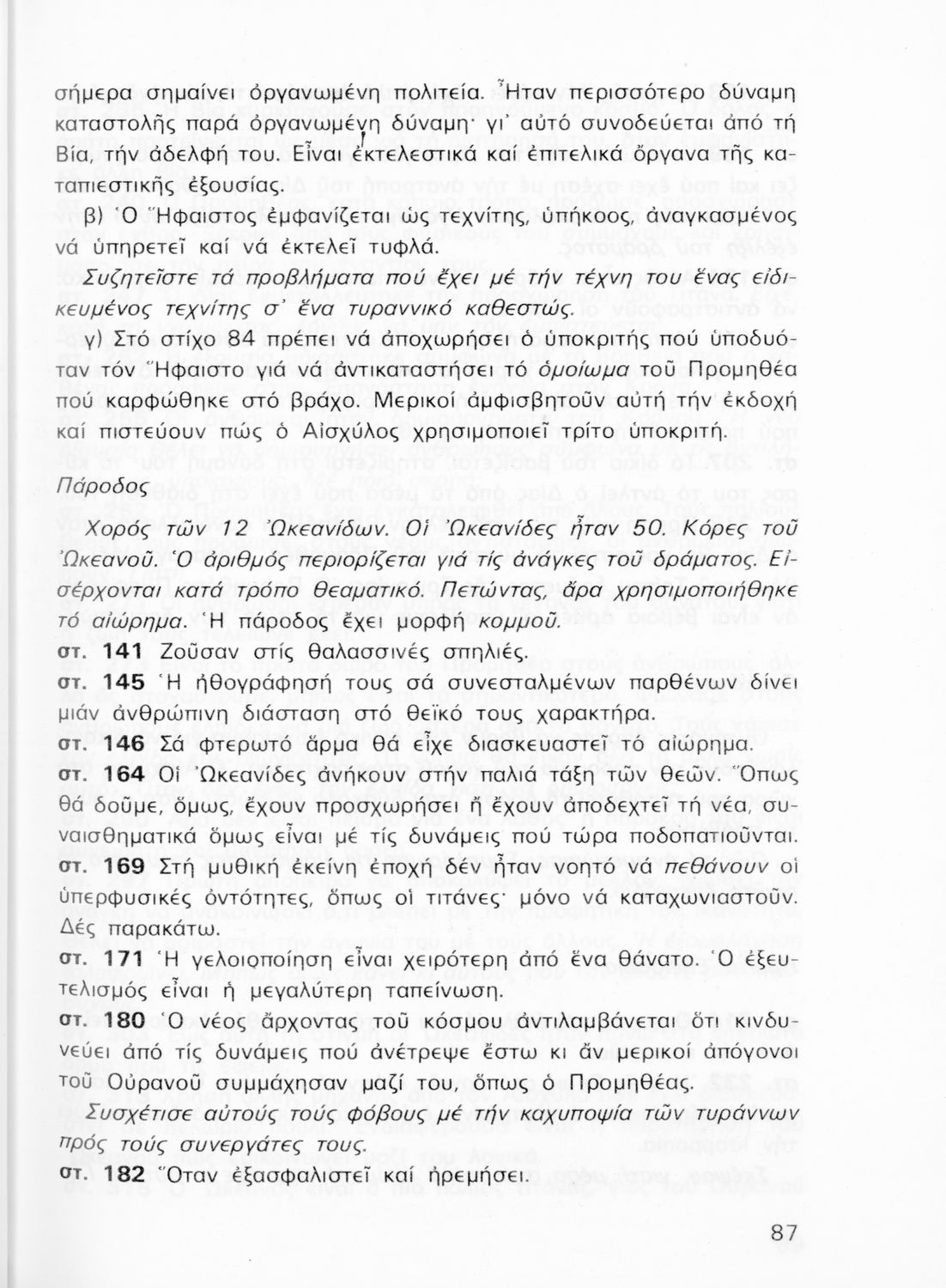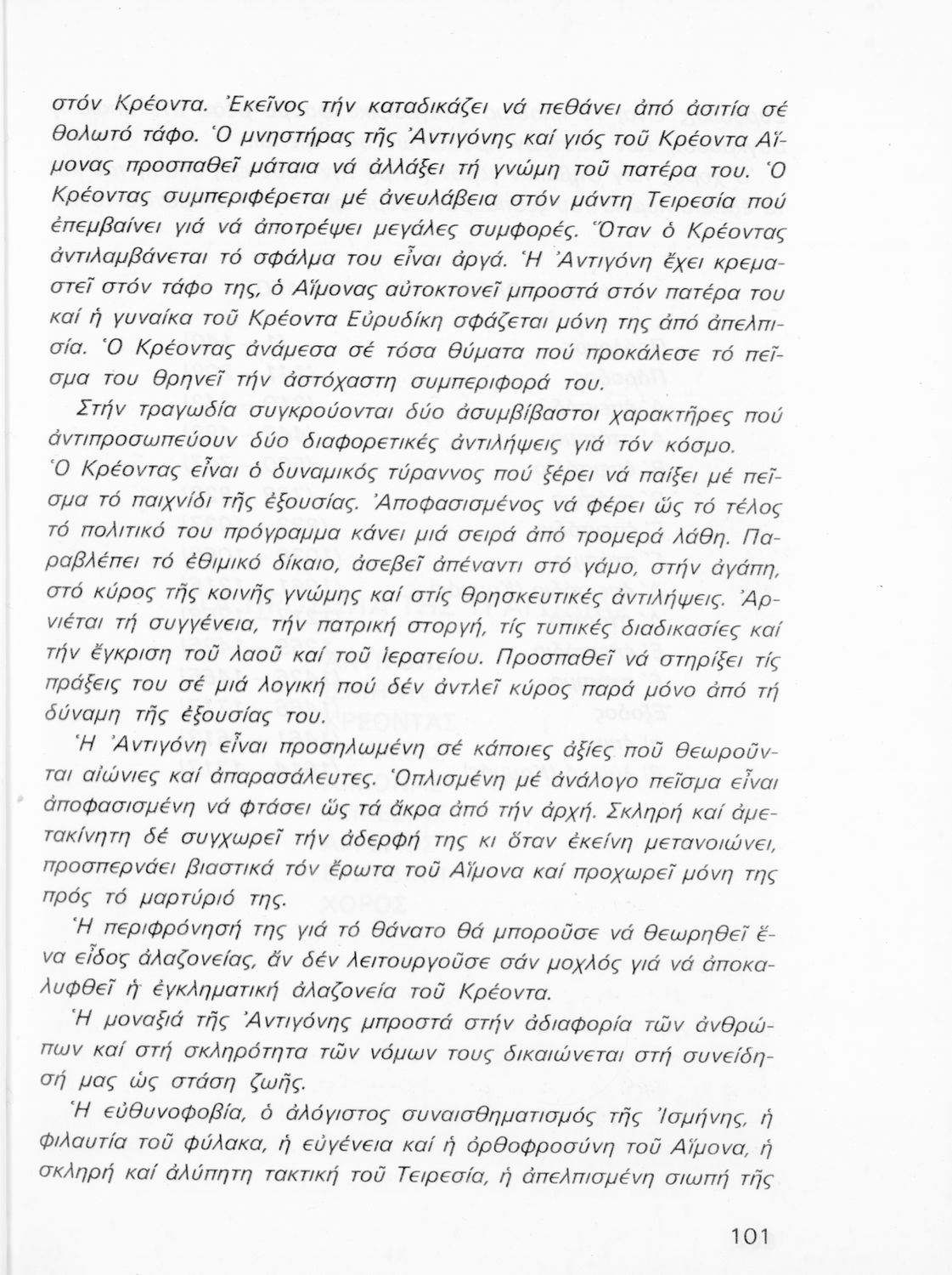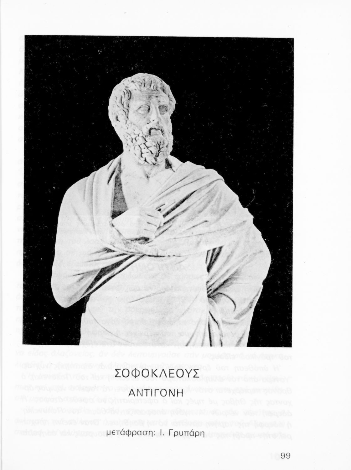 Σχολικό εγχειρίδιο Αρχαίων Ελληνικών Γ΄ Γυμνασίου που περιλαμβάνει εισαγωγή στη δραματική ποίηση, το αρχαίο θέατρο και την τραγωδία, μετάφραση των έργων Προμηθέας Δεσμώτης του Αισχύλου, Αντιγόνη του Σοφοκλή και Ιφιγένεια η εν Ταύροις του Ευριπίδη και ερμηνευτικά σχόλια.