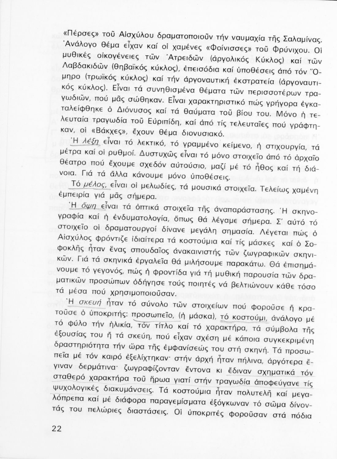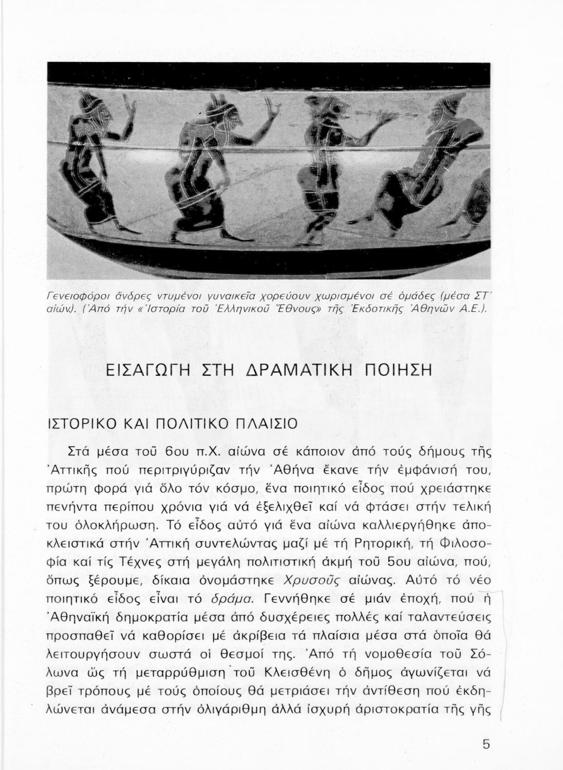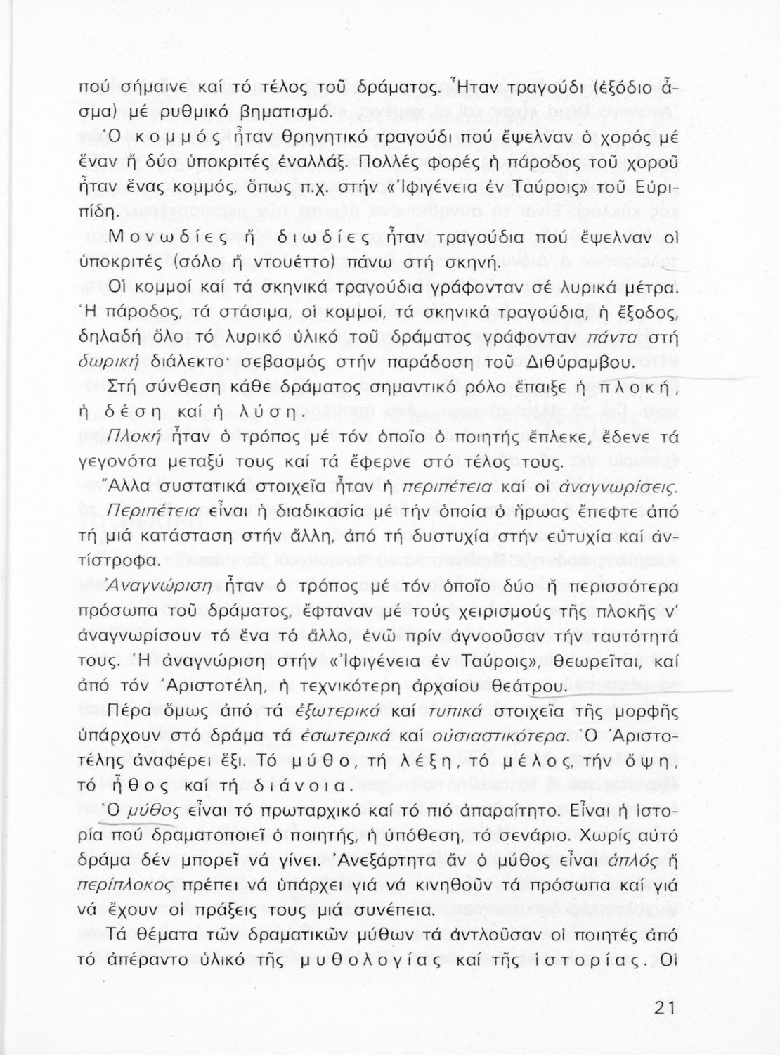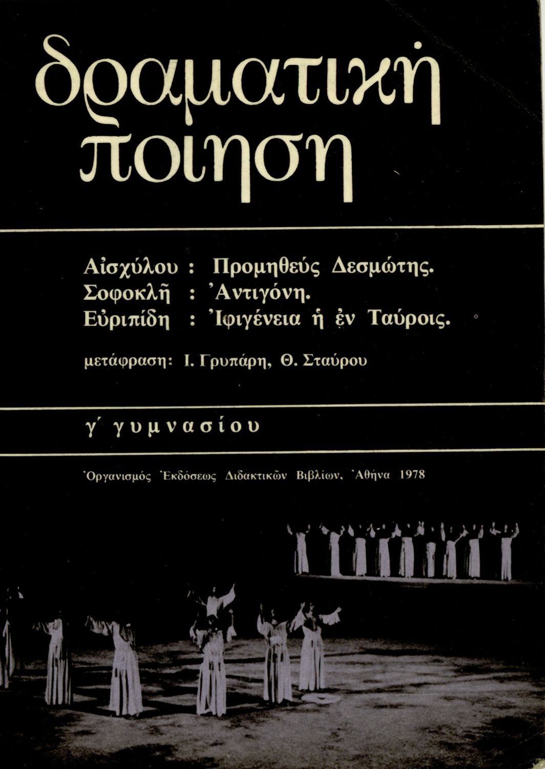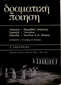 Σχολικό εγχειρίδιο Αρχαίων Ελληνικών Γ΄ Γυμνασίου που περιλαμβάνει εισαγωγή στη δραματική ποίηση, το αρχαίο θέατρο και την τραγωδία, μετάφραση των έργων Προμηθέας Δεσμώτης του Αισχύλου, Αντιγόνη του Σοφοκλή και Ιφιγένεια η εν Ταύροις του Ευριπίδη και ερμηνευτικά σχόλια.