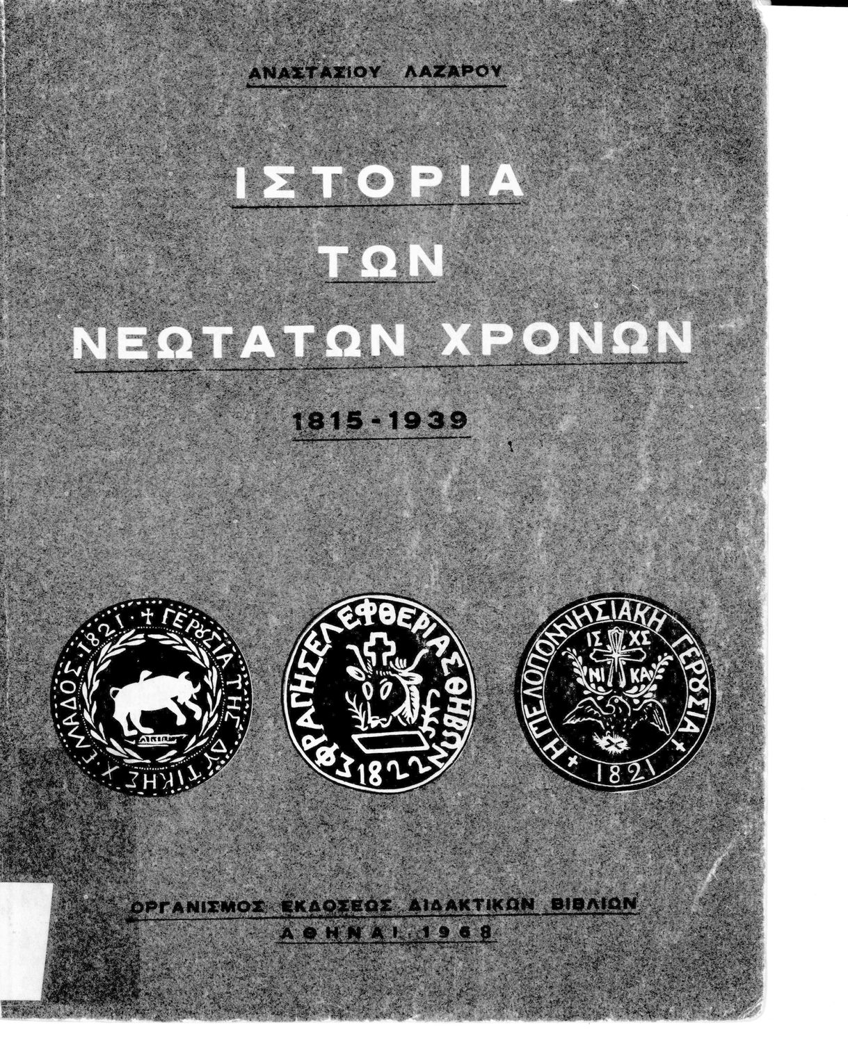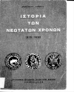 Κωδικός αναγνώρισης: 01-18006 Τίτλος: Ιστορία των νεωτάτων χρόνων. Από τη Συνθήκη της Βιέννης (1815) μέχρι του Β΄ Παγκοσμίου Πολέμου (1939) Συγγραφέας: Α. Λαζάρου Εικονογράφος: Γ. Λυδάκης Μέγεθος και υπόστρωμα: Σχολικό εγχειρίδιο, σκληρό εξώφυλλο, 308 σελίδες. Σκίτσα, χάρτης, εικόνες (ασπρόμαυρα). |