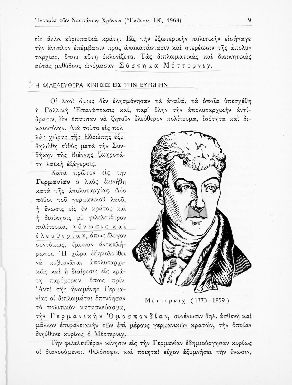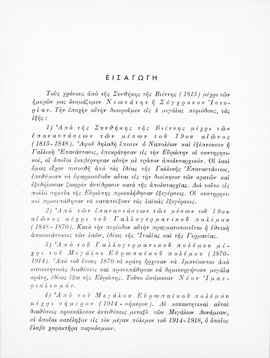 Σχολικό εγχειρίδιο Ιστορίας που καλύπτει την περίοδο από τη Συνθήκη της Βιέννης και την εδραίωση των εθνικών κρατών μέχρι τον Α΄ Παγκόσμιο Πόλεμο και τις εξελίξεις στην Ευρώπη. Αναφέρεται και στα επιτεύγματα του ευρωπαϊκού πολιτισμού, τις τέχνες και τα γράμματα. Φέρει το σύμβολο της δικτατορίας.