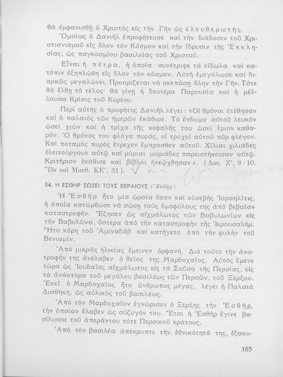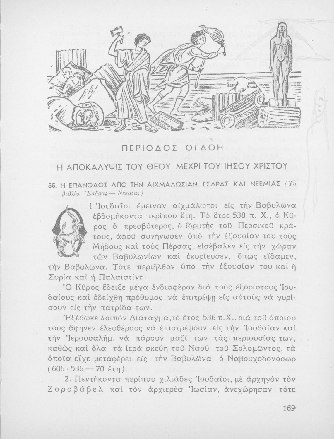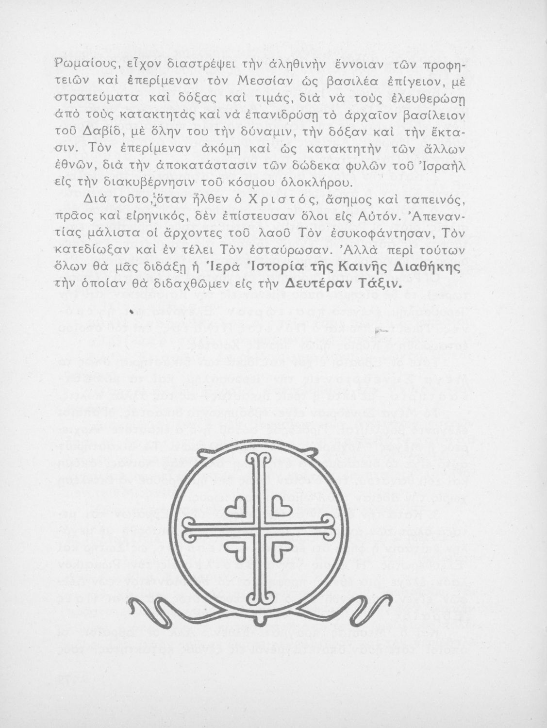 Σχολικό εγχειρίδιο Θρησκευτικών που συνιστά μία εξιστόρηση της Παλαιάς Διαθήκης από τη δημιουργία του κόσμου ως την υποταγή των Εβραίων στους Ρωμαίους. Περιέχει και στοιχεία γεωγραφίας της Παλαιστίνης.
