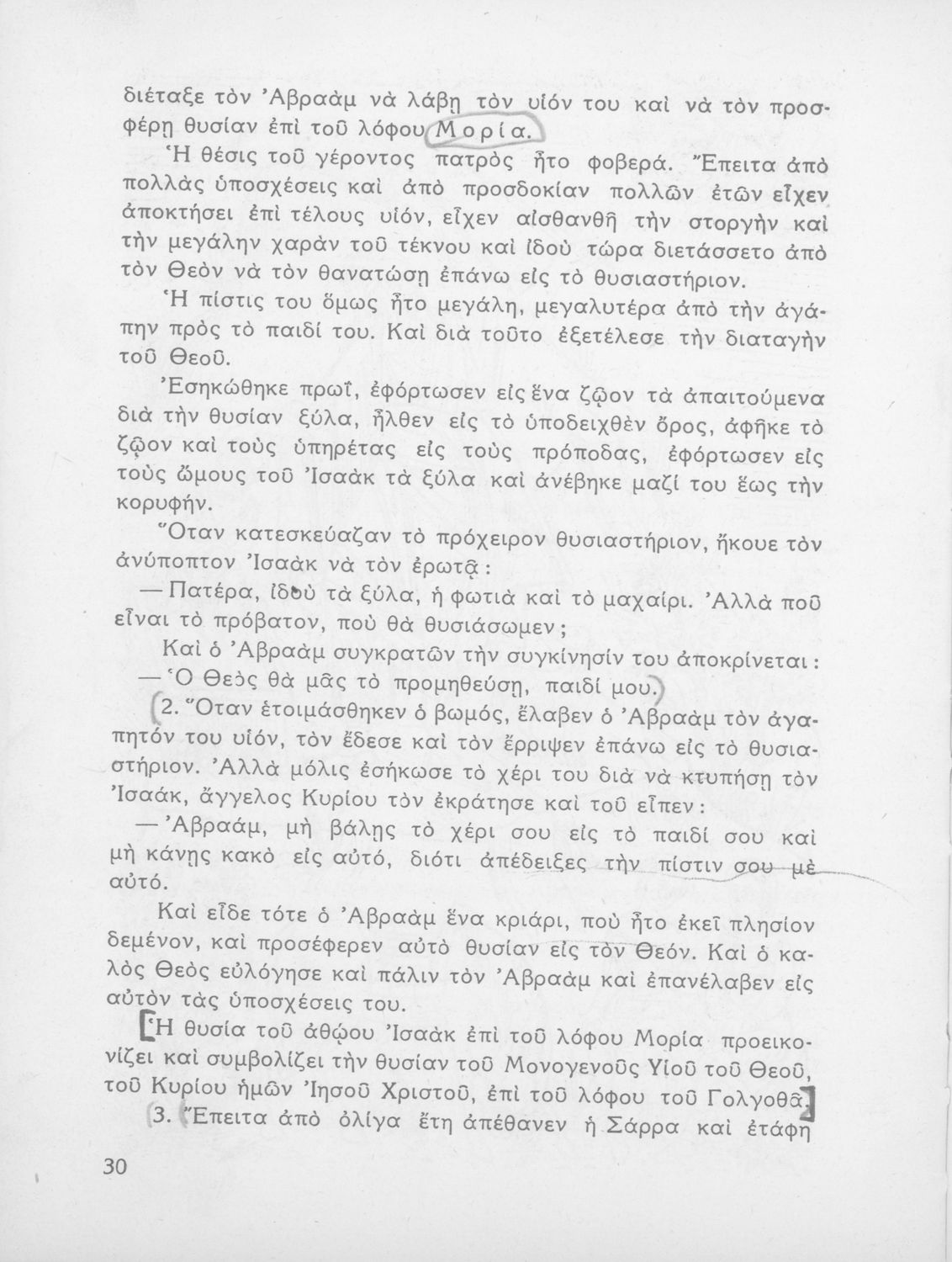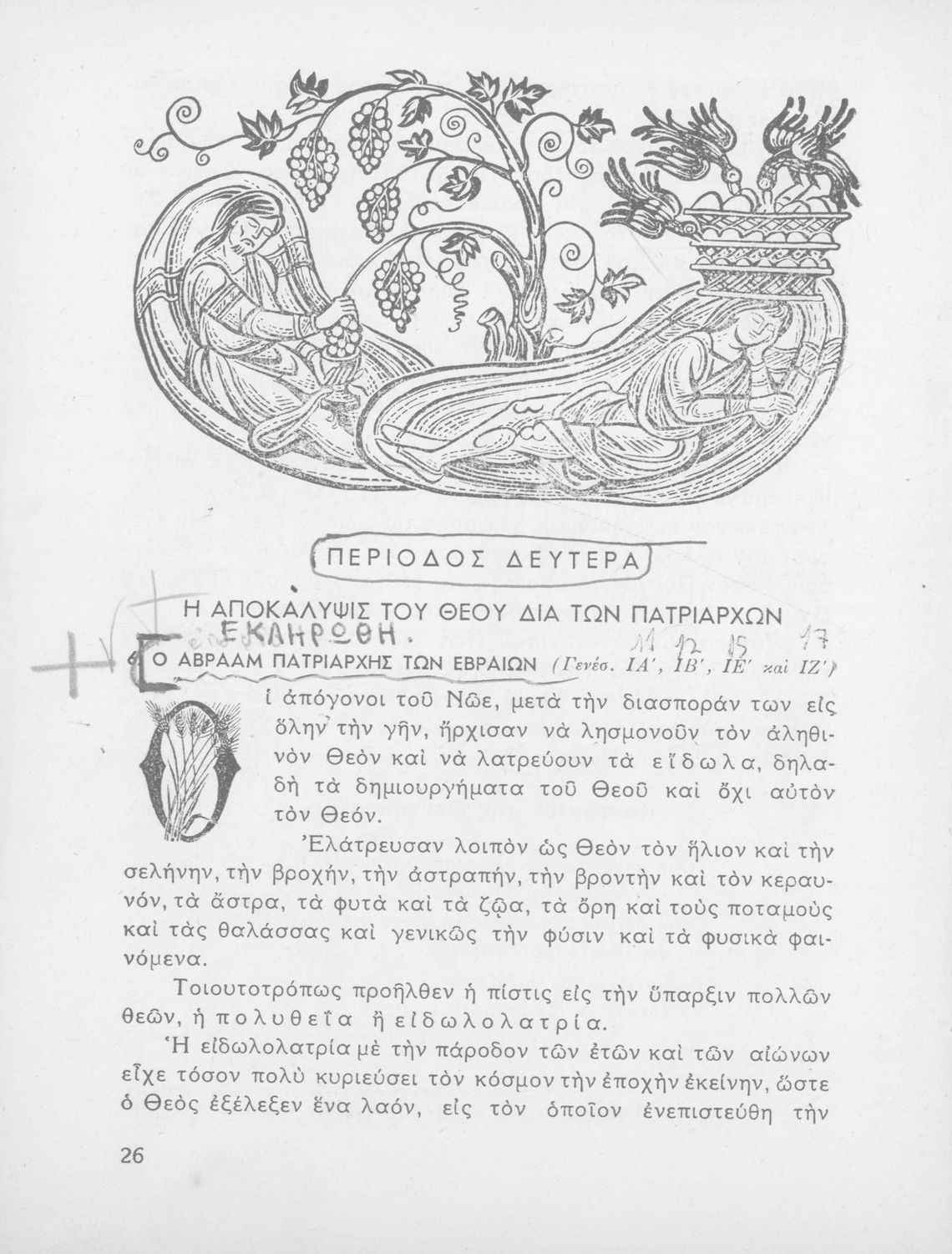 Σχολικό εγχειρίδιο Θρησκευτικών Δημοτικού που συνιστά μία εξιστόρηση της Παλαιάς Διαθήκης από τη δημιουργία του κόσμου ως τους Μακκαβαίους. Περιέχει και ποιήματα θρησκευτικού περιεχομένου.
