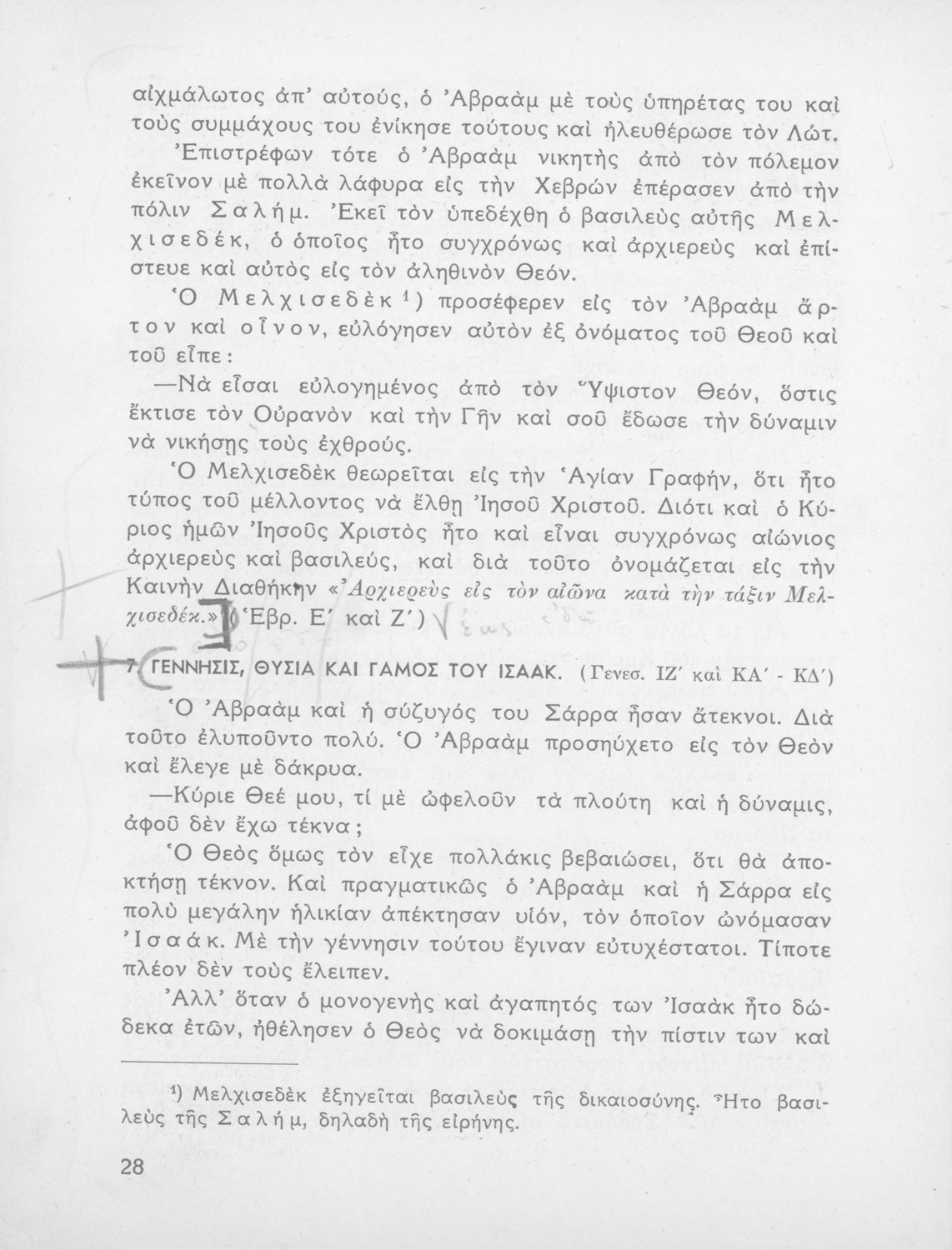 Σχολικό εγχειρίδιο Θρησκευτικών που συνιστά μία εξιστόρηση της Παλαιάς Διαθήκης από τη δημιουργία του κόσμου ως την υποταγή των Εβραίων στους Ρωμαίους.
