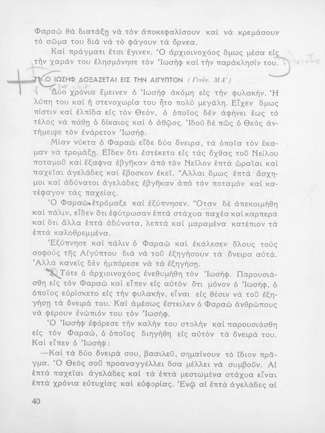Σχολικό εγχειρίδιο Θρησκευτικών που συνιστά μία εξιστόρηση της Παλαιάς Διαθήκης από τη δημιουργία του κόσμου ως τους Προφήτες. Φέρει το σύμβολο της δικτατορίας.