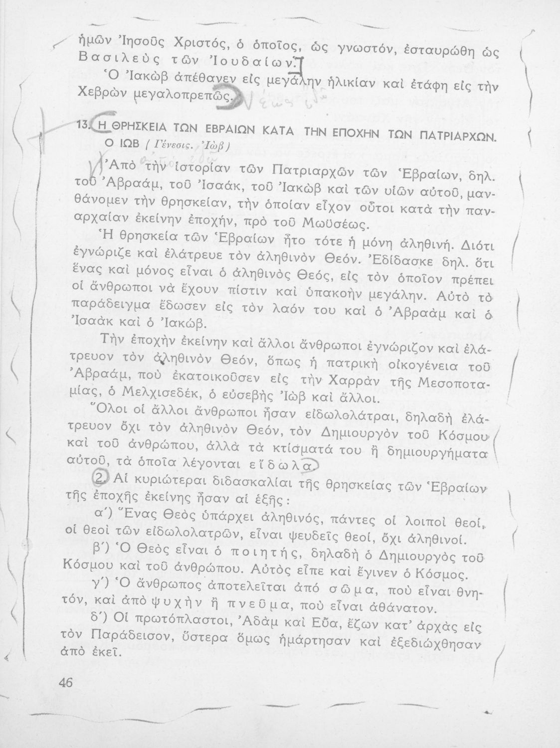Παρουσίαση περιεχομένου: Σχολικό εγχειρίδιο Θρησκευτικών που συνιστά μία εξιστόρηση της Παλαιάς Διαθήκης από τη δημιουργία του κόσμου ως την υποταγή των Εβραίων στους Ρωμαίους.