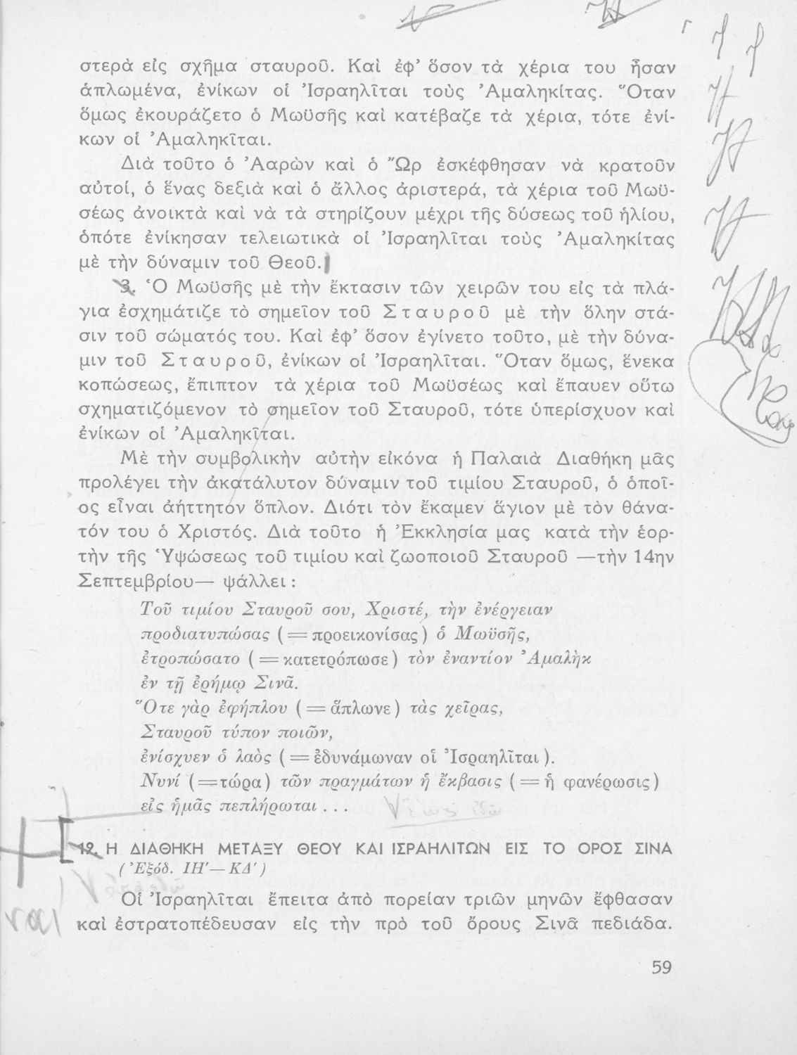 Σχολικό εγχειρίδιο Θρησκευτικών που συνιστά μία εξιστόρηση της Παλαιάς Διαθήκης από τη δημιουργία του κόσμου ως τους Προφήτες. Φέρει το σύμβολο της δικτατορίας.