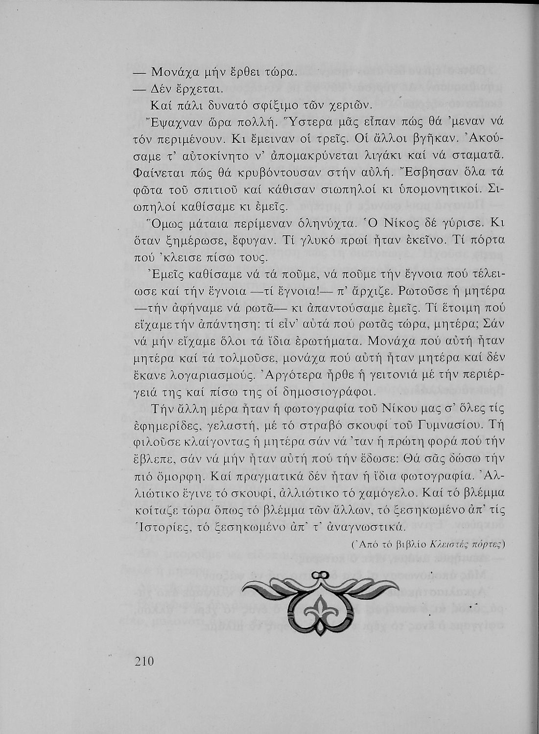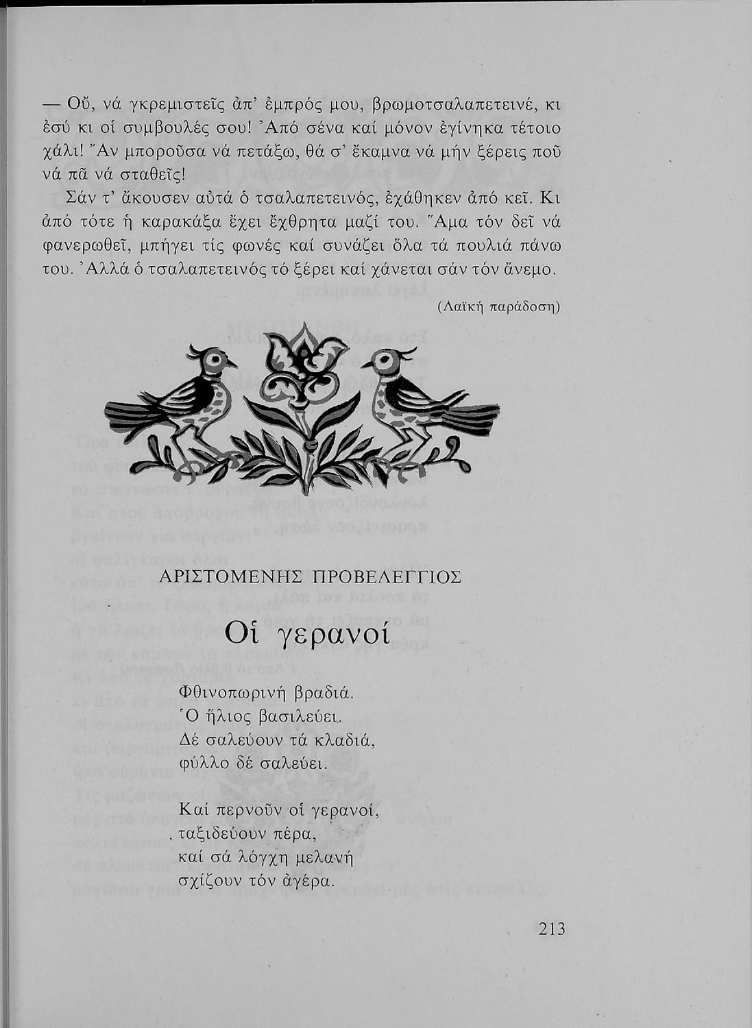 Αναγνωστικό για τις Ε' και ΣΤ΄ Δημοτικού που περιλαμβάνει πεζά και ποιήματα της Νέας Ελληνικής Λογοτεχνίας εμπνευσμένα από την καθημερινότητα των παιδιών και των οικογενειών τους, την ελληνική ιστορία, τις οικογενειακές στιγμές και εορτές, το παιχνίδι και την εθνική παράδοση, και τα δημοτικά και ακριτικά τραγούδια. Περιέχει και 5 κείμενα γραμμένα στην καθαρεύουσα με θέματα από τον κοινωνικό και εθνικό βίο, και ερμηνευτικό λεξιλόγιο.. Το βιβλίο είναι αφιερωμένο στη μνήμη της Πηνελόπης Δέλτα.