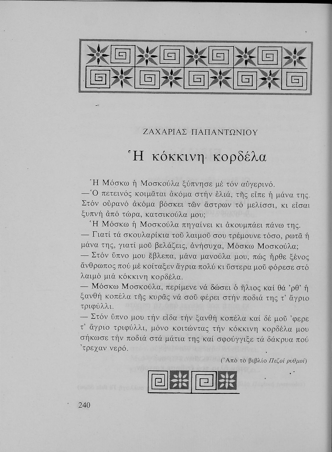 Αναγνωστικό για τις Ε' και ΣΤ΄ Δημοτικού που περιλαμβάνει πεζά και ποιήματα της Νέας Ελληνικής Λογοτεχνίας εμπνευσμένα από την καθημερινότητα των παιδιών και των οικογενειών τους, την ελληνική ιστορία, τις οικογενειακές στιγμές και εορτές, το παιχνίδι και την εθνική παράδοση, και τα δημοτικά και ακριτικά τραγούδια. Περιέχει και 5 κείμενα γραμμένα στην καθαρεύουσα με θέματα από τον κοινωνικό και εθνικό βίο, και ερμηνευτικό λεξιλόγιο.. Το βιβλίο είναι αφιερωμένο στη μνήμη της Πηνελόπης Δέλτα.