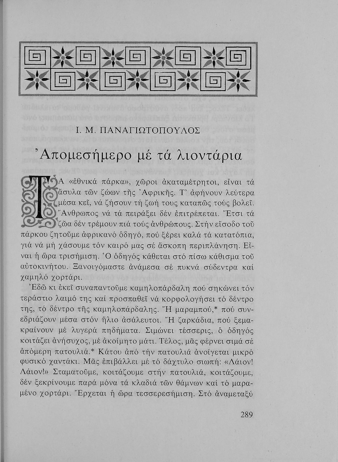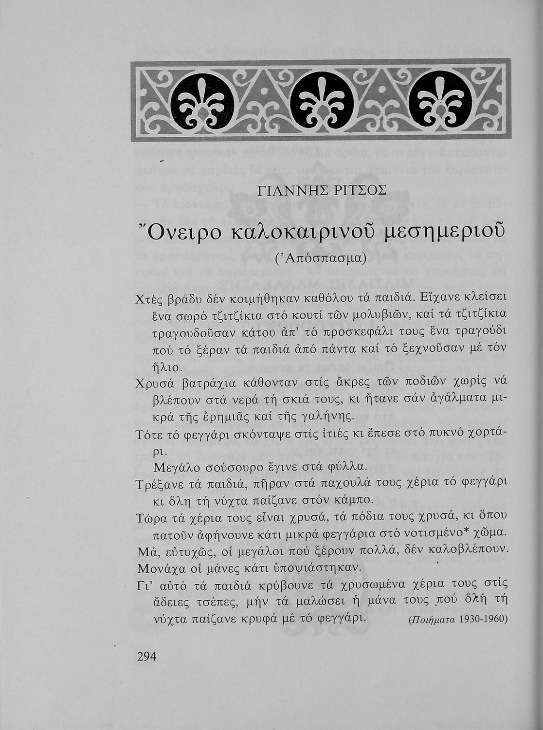 Αναγνωστικό για τις Ε' και ΣΤ΄ Δημοτικού που περιλαμβάνει πεζά και ποιήματα της Νέας Ελληνικής Λογοτεχνίας εμπνευσμένα από την καθημερινότητα των παιδιών και των οικογενειών τους, την ελληνική ιστορία, τις οικογενειακές στιγμές και εορτές, το παιχνίδι και την εθνική παράδοση, και τα δημοτικά και ακριτικά τραγούδια. Περιέχει και 5 κείμενα γραμμένα στην καθαρεύουσα με θέματα από τον κοινωνικό και εθνικό βίο, και ερμηνευτικό λεξιλόγιο.. Το βιβλίο είναι αφιερωμένο στη μνήμη της Πηνελόπης Δέλτα.