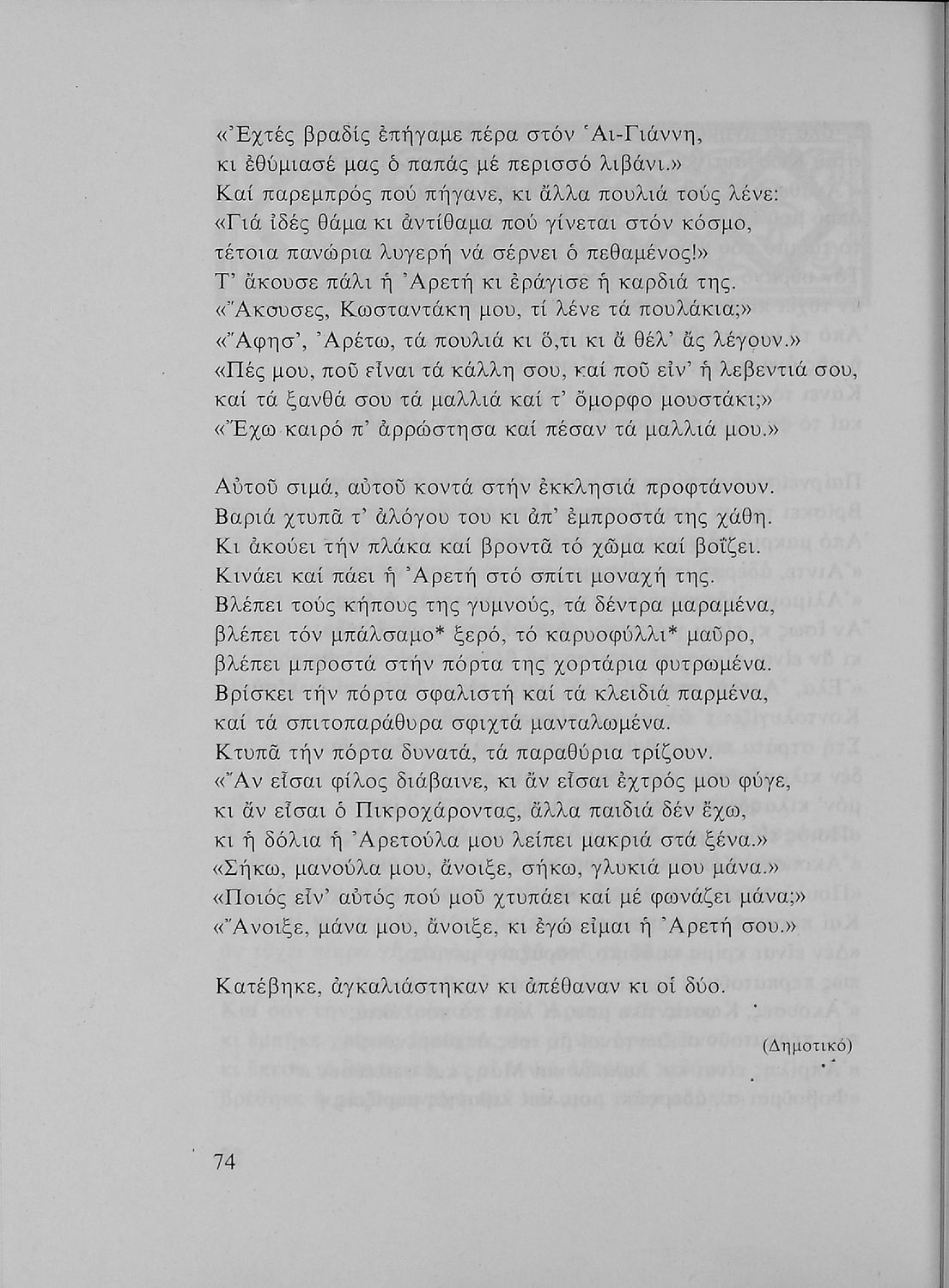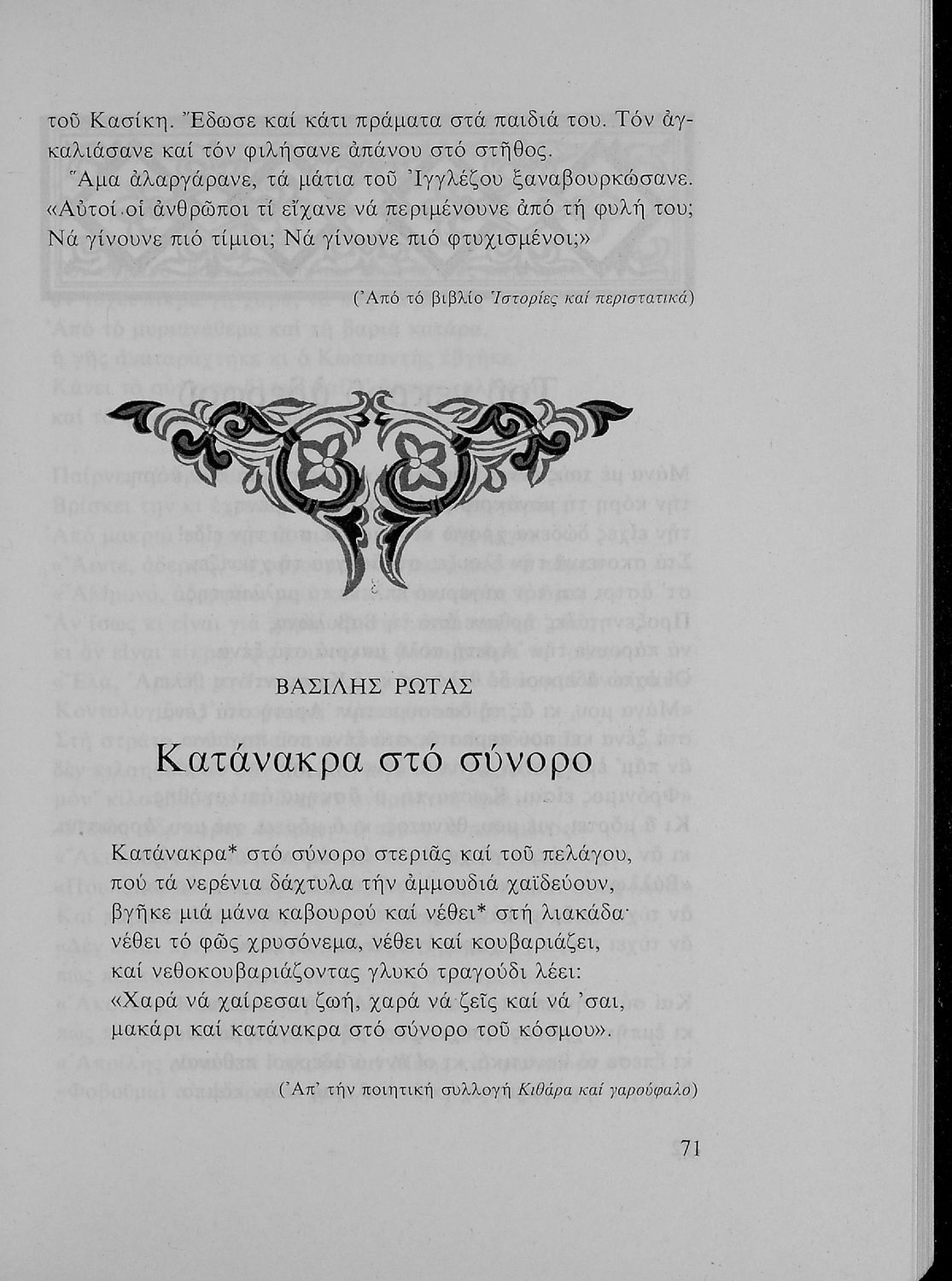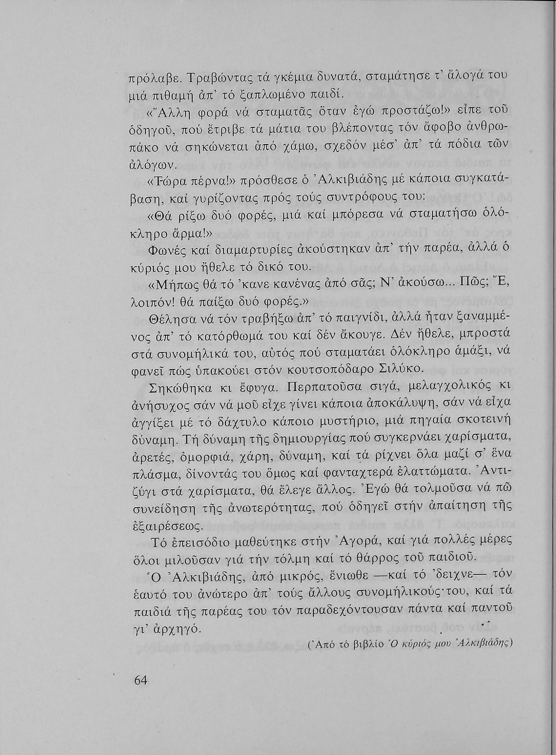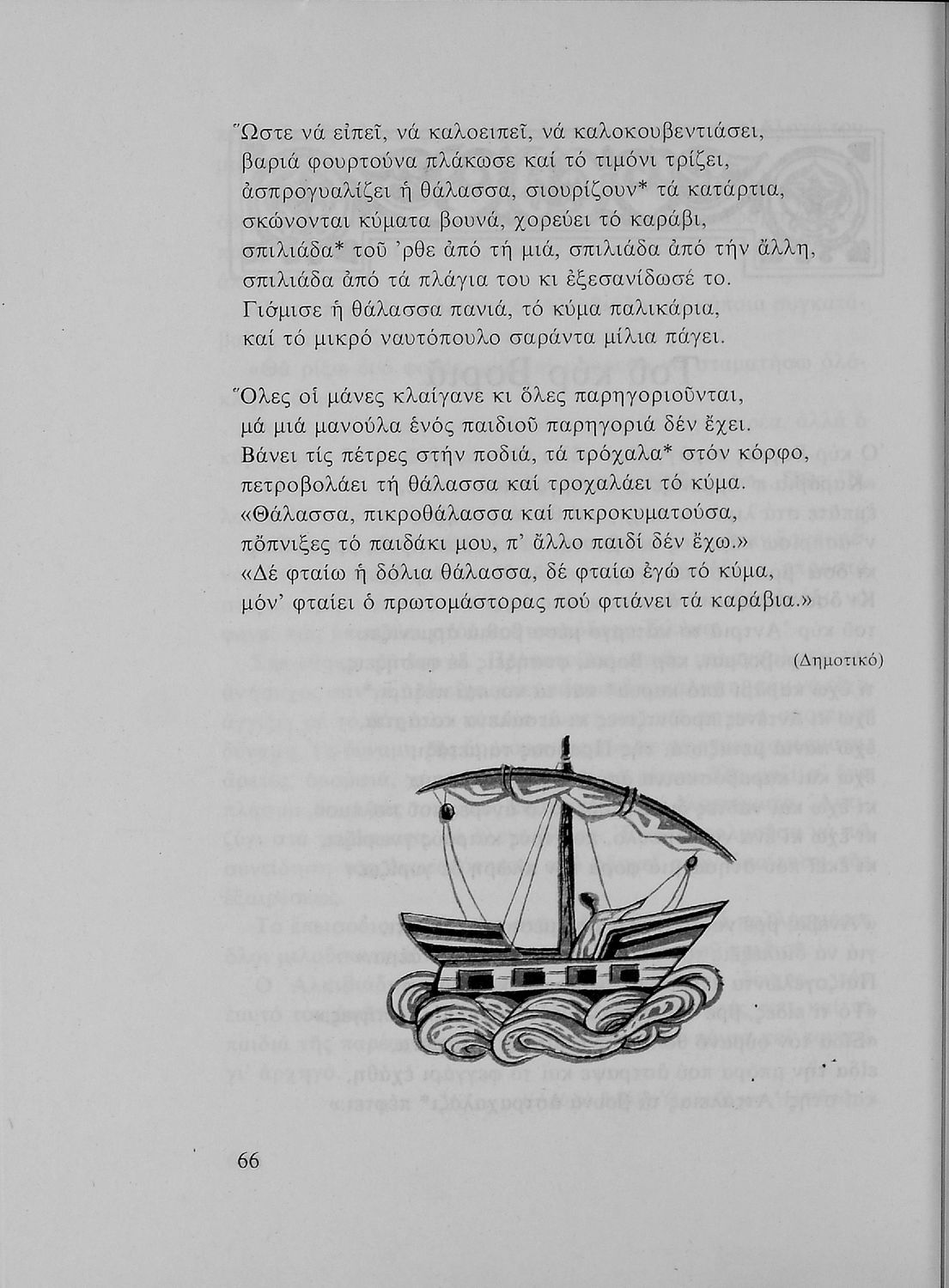 Αναγνωστικό για τις Ε' και ΣΤ΄ Δημοτικού που περιλαμβάνει πεζά και ποιήματα της Νέας Ελληνικής Λογοτεχνίας εμπνευσμένα από την καθημερινότητα των παιδιών και των οικογενειών τους, την ελληνική ιστορία, τις οικογενειακές στιγμές και εορτές, το παιχνίδι και την εθνική παράδοση, και τα δημοτικά και ακριτικά τραγούδια. Περιέχει και 5 κείμενα γραμμένα στην καθαρεύουσα με θέματα από τον κοινωνικό και εθνικό βίο, και ερμηνευτικό λεξιλόγιο.. Το βιβλίο είναι αφιερωμένο στη μνήμη της Πηνελόπης Δέλτα.
