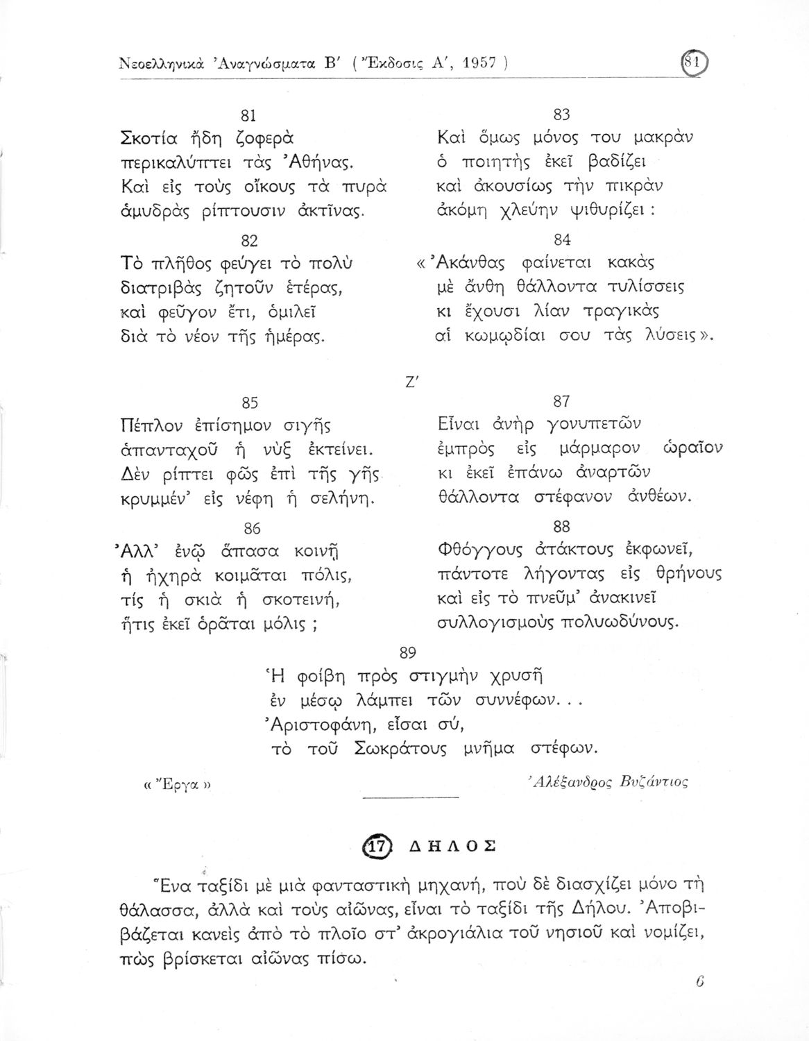 Σχολικό εγχειρίδιο Νέων Ελληνικών Β΄ Εξαταξίου Γυμνασίου που περιλαμβάνει που περιλαμβάνει ποιήματα και πεζά Ελλήνων συγγραφέων εμπνευσμένα από την αρχαία και σύγχρονη ελληνική ιστορία, την ελληνική φύση και ...
