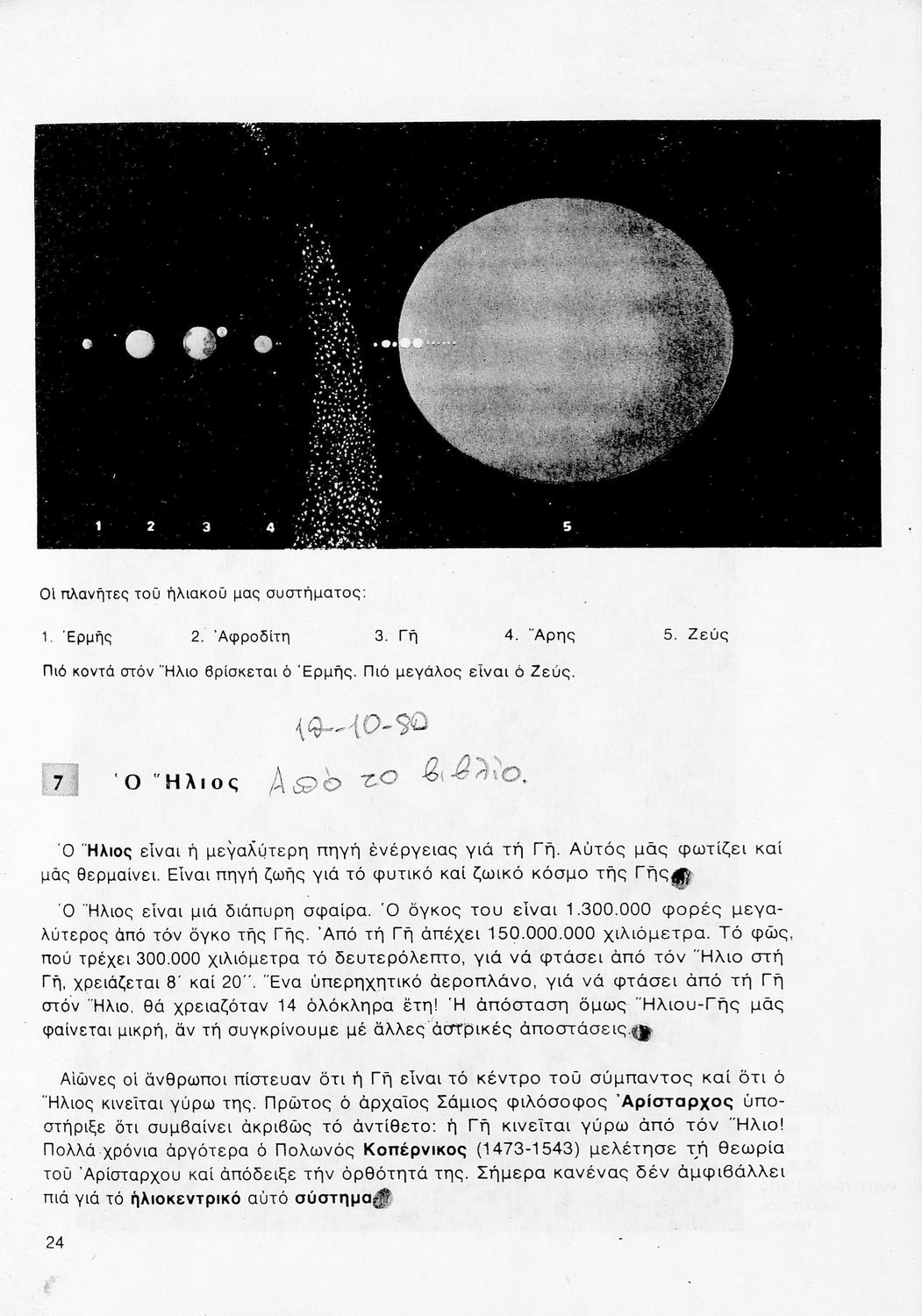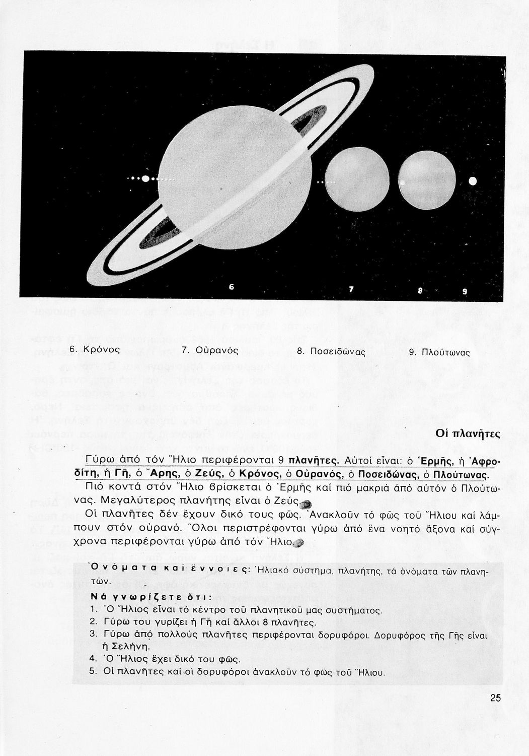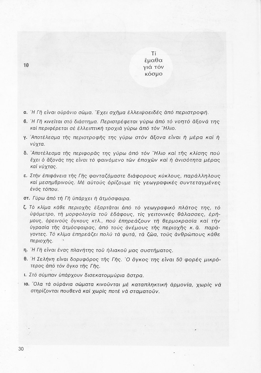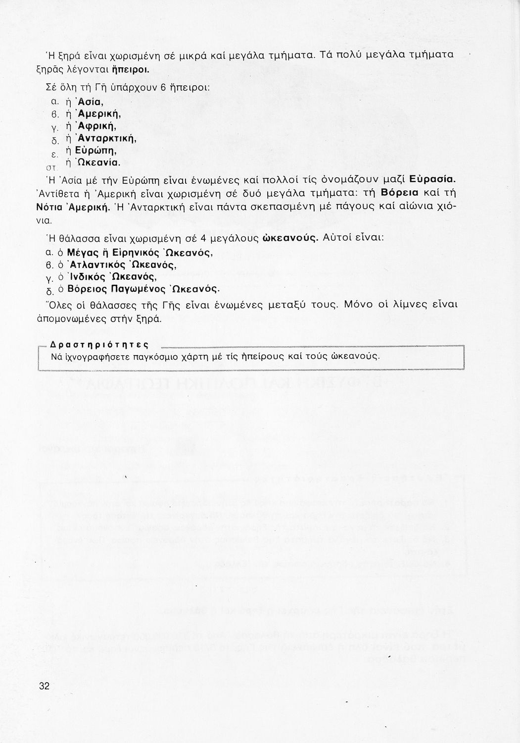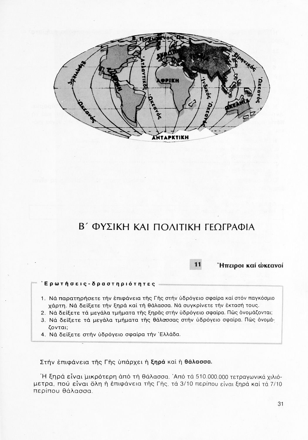 Σχολικό εγχειρίδιο Γεωγραφίας ΣΤ΄ Δημοτικού που περιλαμβάνει εισαγωγή στη φυσική, μαθηματική και πολιτική γεωγραφία και εξετάζει την Ελλάδα και ενδεικτικές χώρες και περιοχές από τις πέντε ηπείρους, εκτός της Ευρώπης, από γεωφυσική και πολιτική άποψη. Περιέχει και στοιχεία ανθρωπογεωγραφίας.