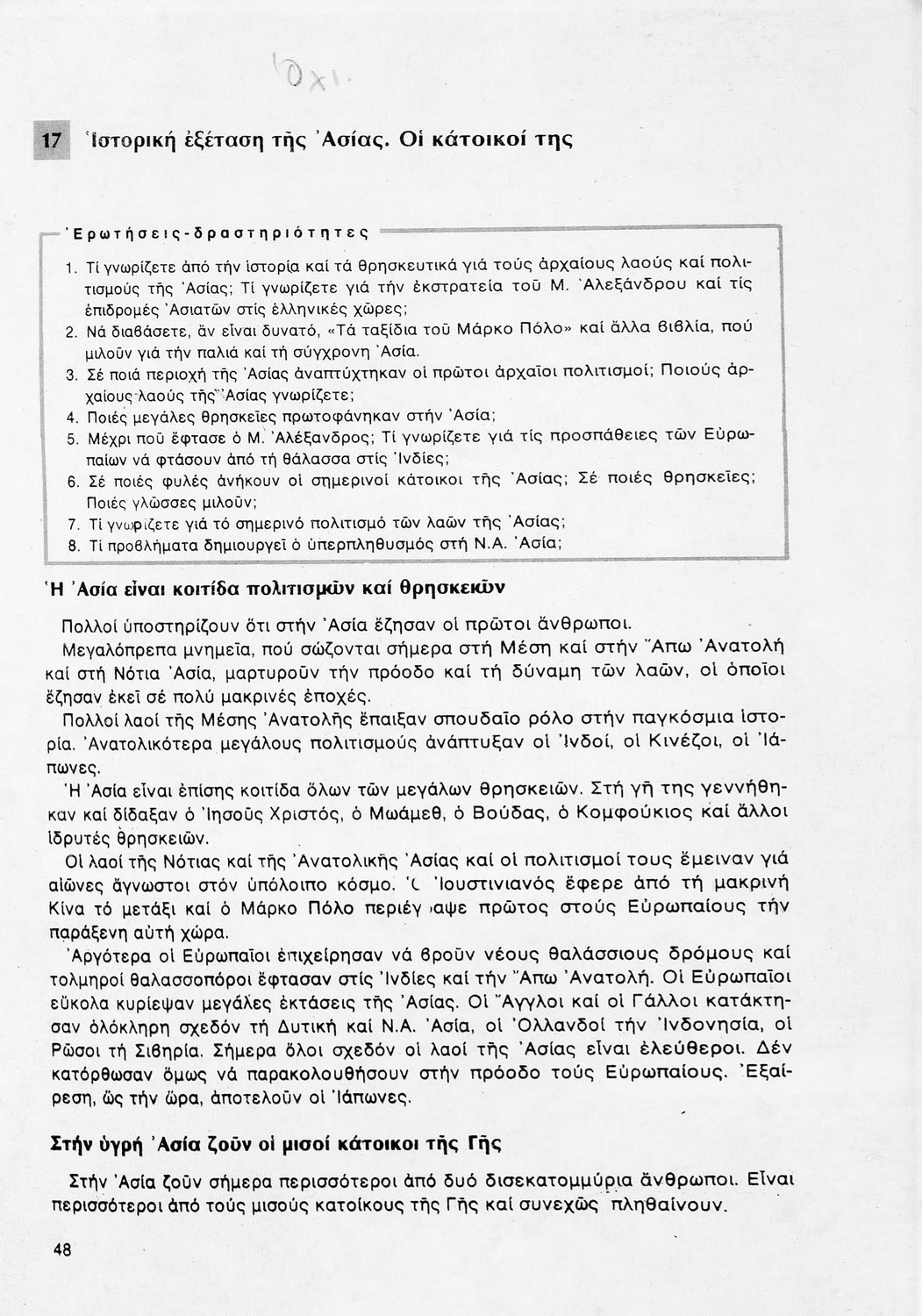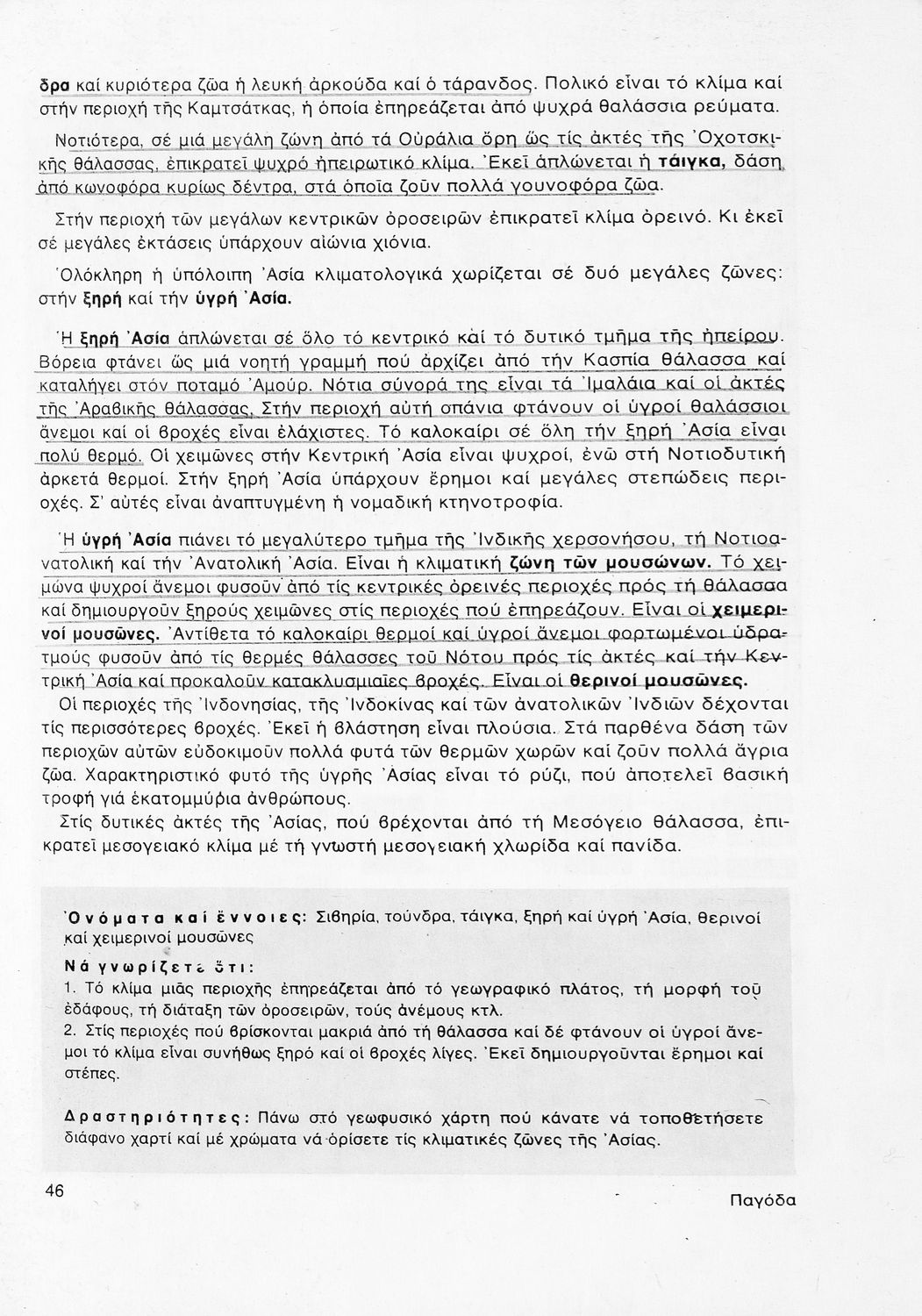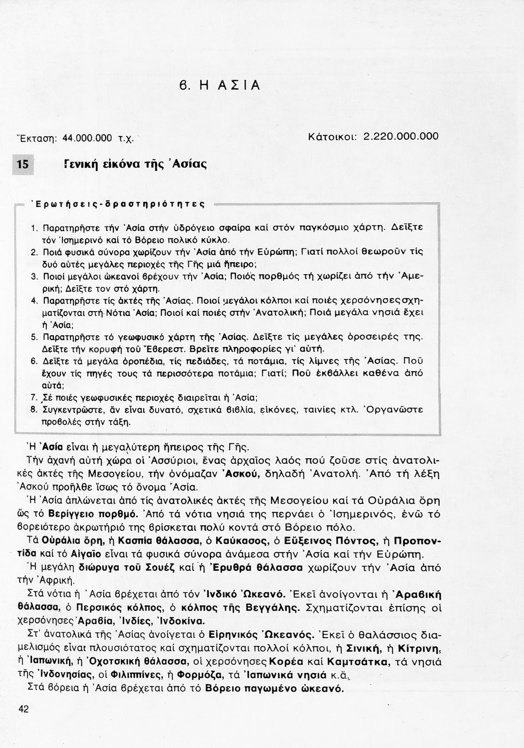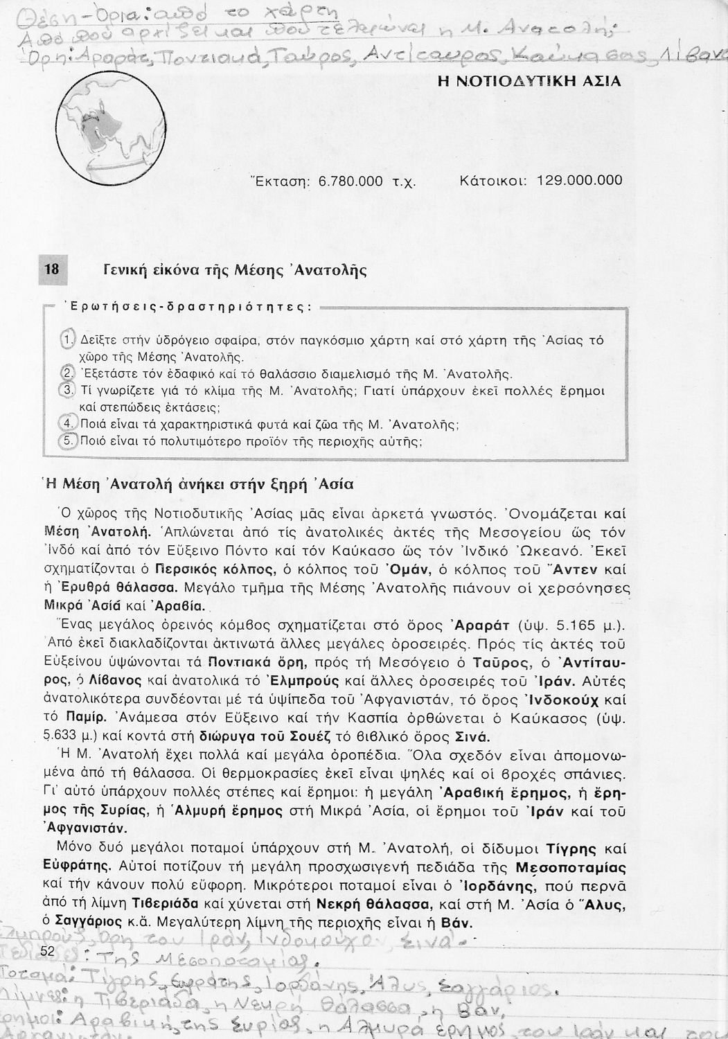 Σχολικό εγχειρίδιο Γεωγραφίας ΣΤ΄ Δημοτικού που περιλαμβάνει εισαγωγή στη φυσική, μαθηματική και πολιτική γεωγραφία και εξετάζει την Ελλάδα και ενδεικτικές χώρες και περιοχές από τις πέντε ηπείρους, εκτός της Ευρώπης, από γεωφυσική και πολιτική άποψη. Περιέχει και στοιχεία ανθρωπογεωγραφίας.