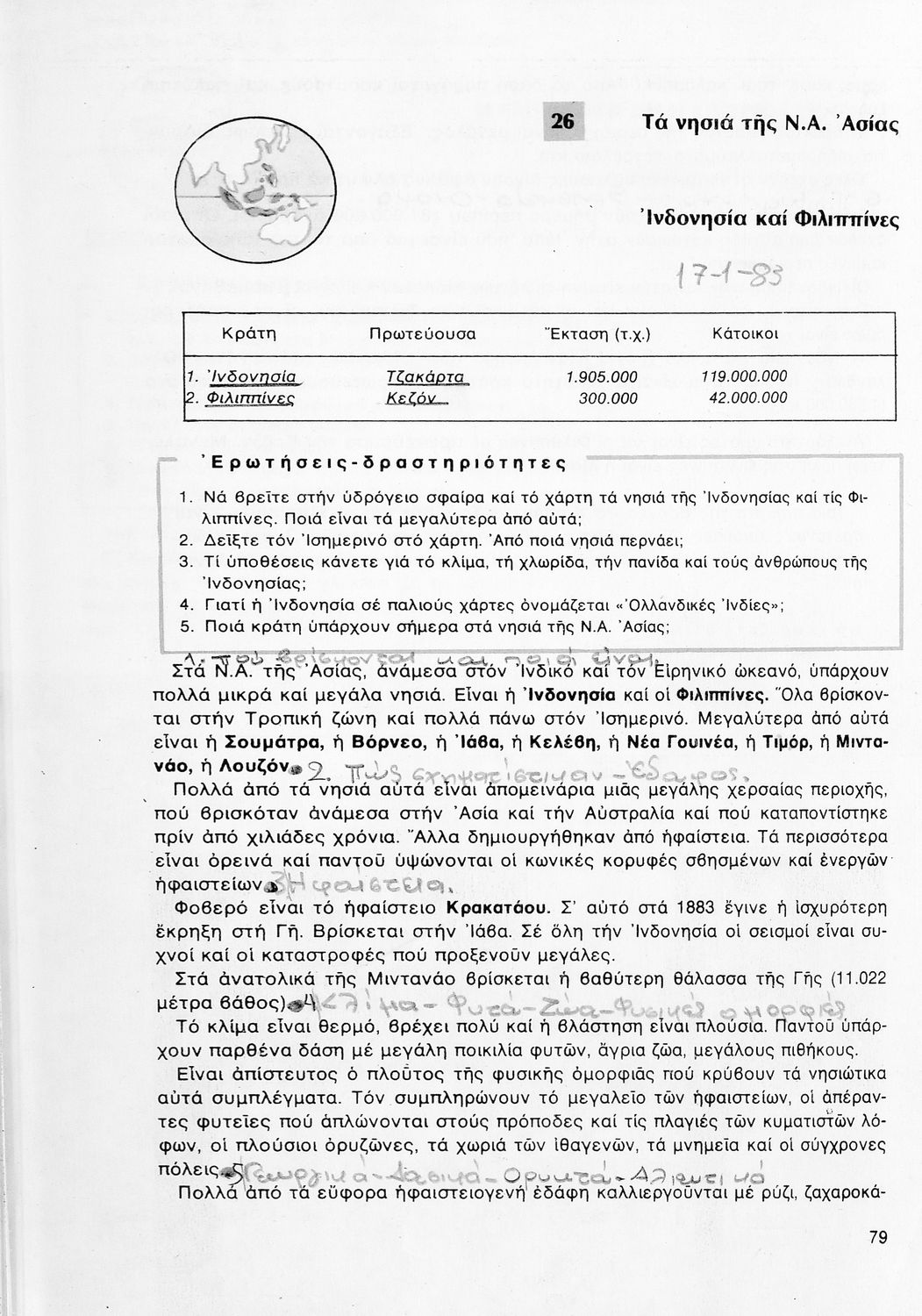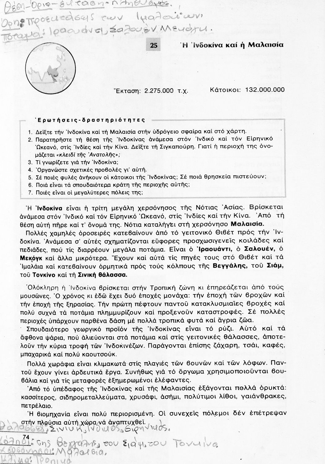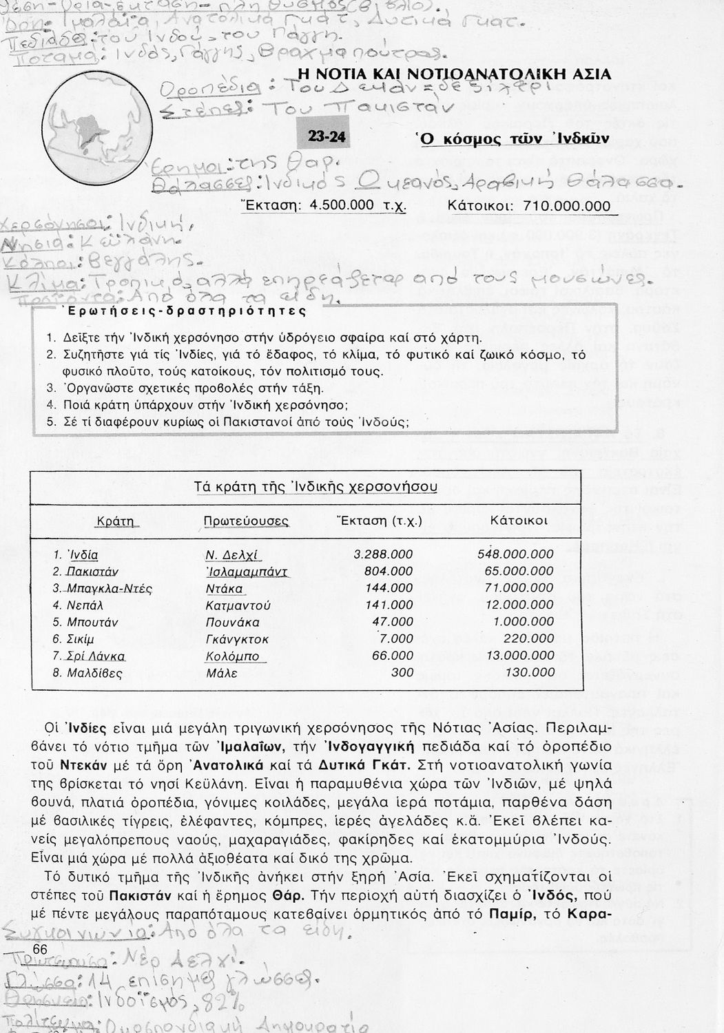 Σχολικό εγχειρίδιο Γεωγραφίας ΣΤ΄ Δημοτικού που περιλαμβάνει εισαγωγή στη φυσική, μαθηματική και πολιτική γεωγραφία και εξετάζει την Ελλάδα και ενδεικτικές χώρες και περιοχές από τις πέντε ηπείρους, εκτός της Ευρώπης, από γεωφυσική και πολιτική άποψη. Περιέχει και στοιχεία ανθρωπογεωγραφίας.
