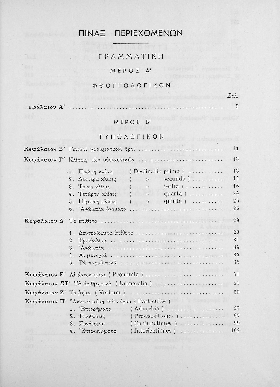 Σχολικό εγχειρίδιο Λατινικών Γυμνασίου που περιλαμβάνει γραμματική και συντακτικό και είναι χωρισμένο σε φθογγολογικό, τυπολογικό και ετυμολογικό μέρος.