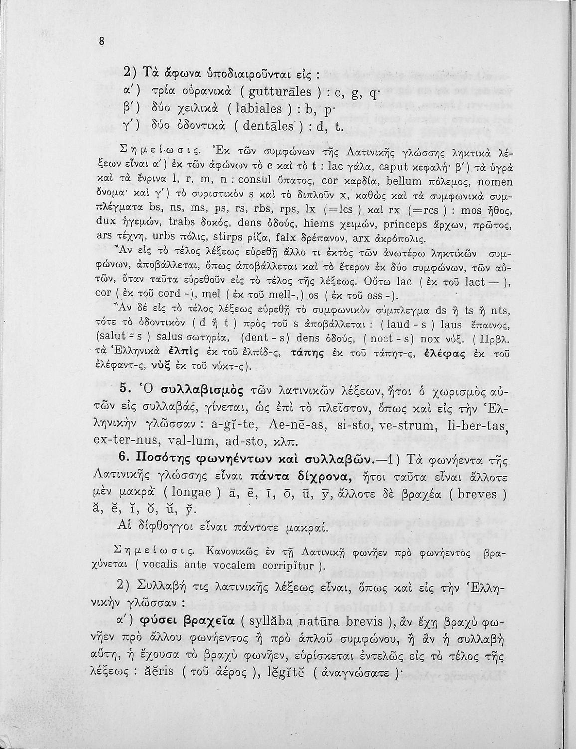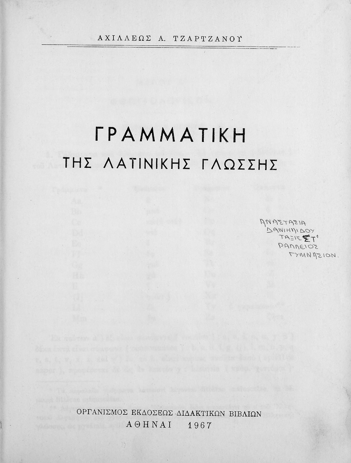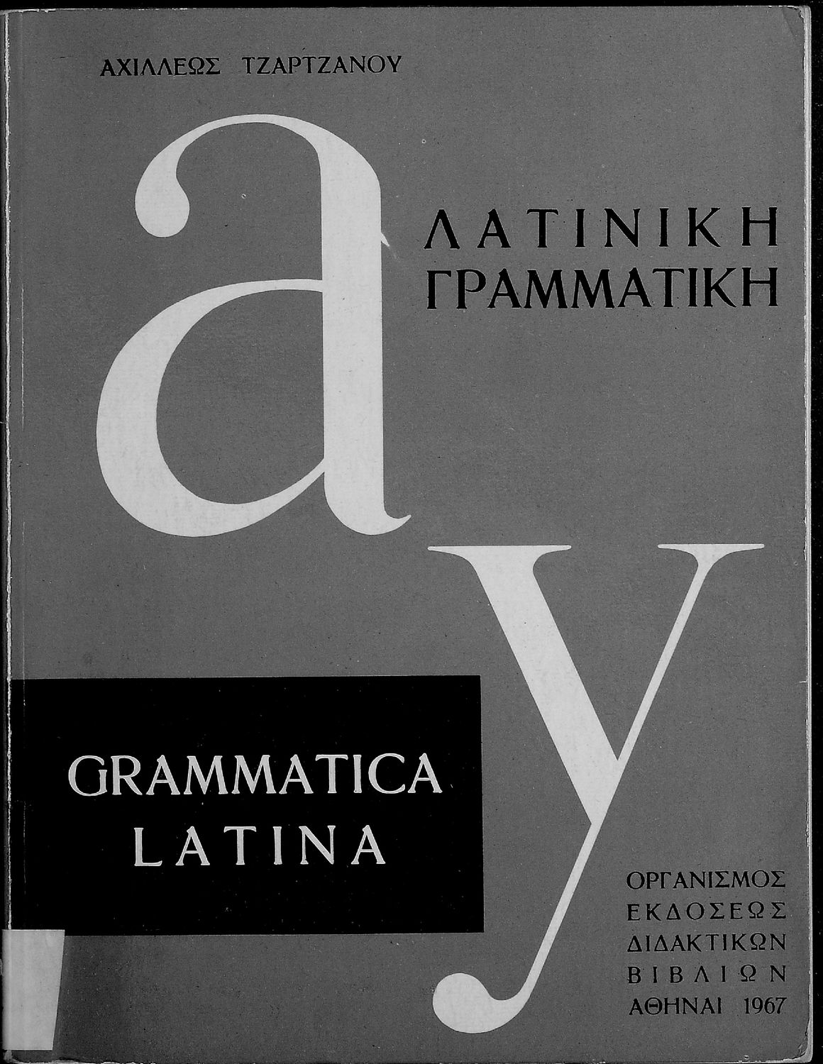 Σχολικό εγχειρίδιο Λατινικών Α΄, Β΄, Γ' Γυμνασίου που περιλαμβάνει γραμματική και συντακτικό και είναι χωρισμένο σε φθογγολογικό, τυπολογικό και ετυμολογικό μέρος.