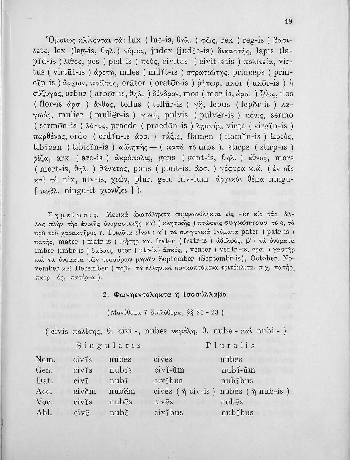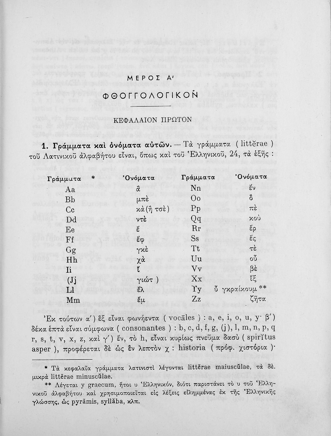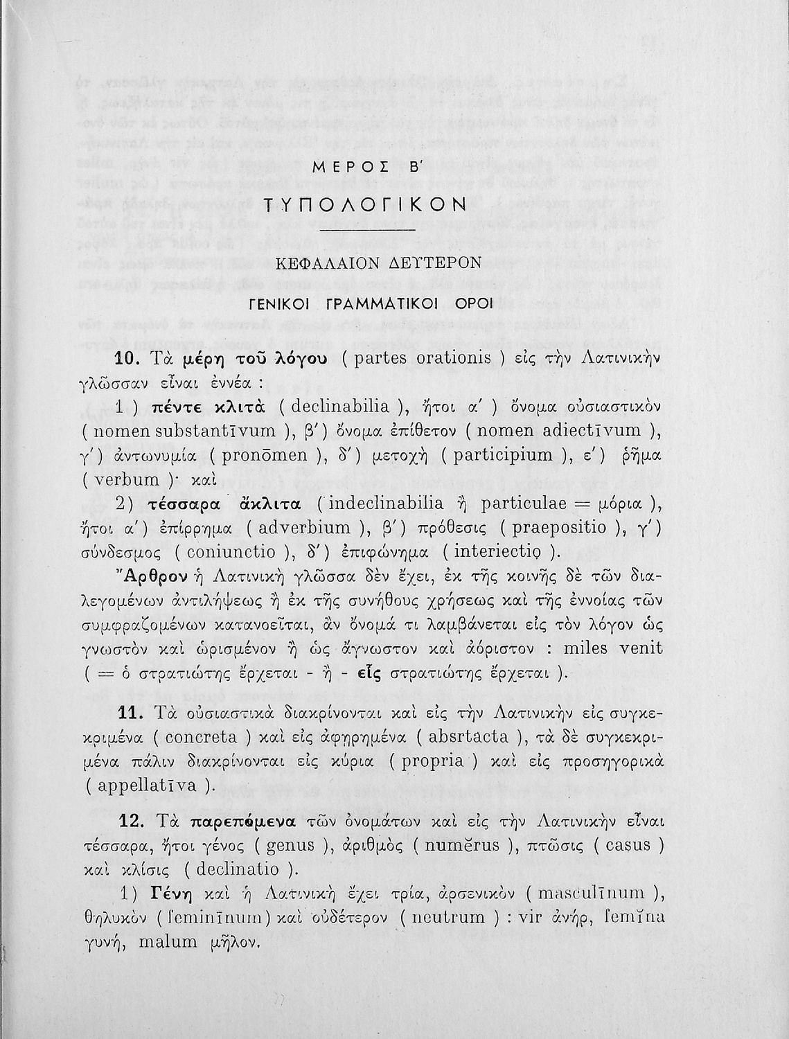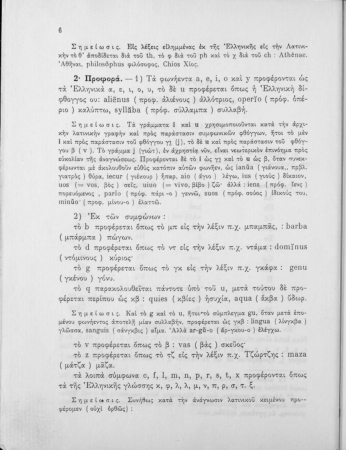 Σχολικό εγχειρίδιο Λατινικών Γυμνασίου που περιλαμβάνει γραμματική και συντακτικό και είναι χωρισμένο σε φθογγολογικό, τυπολογικό και ετυμολογικό μέρος.