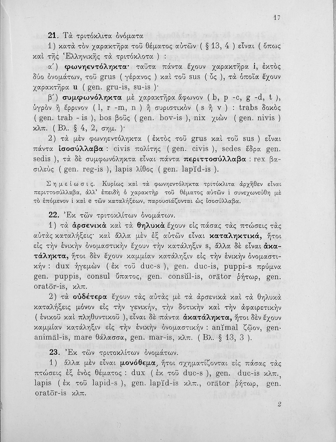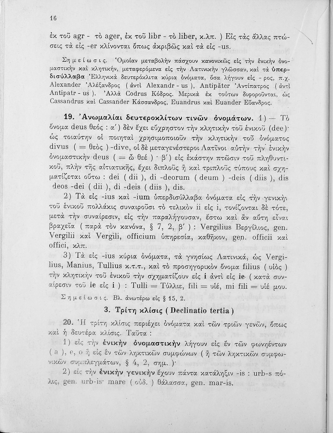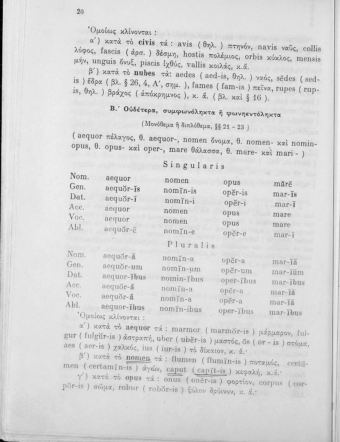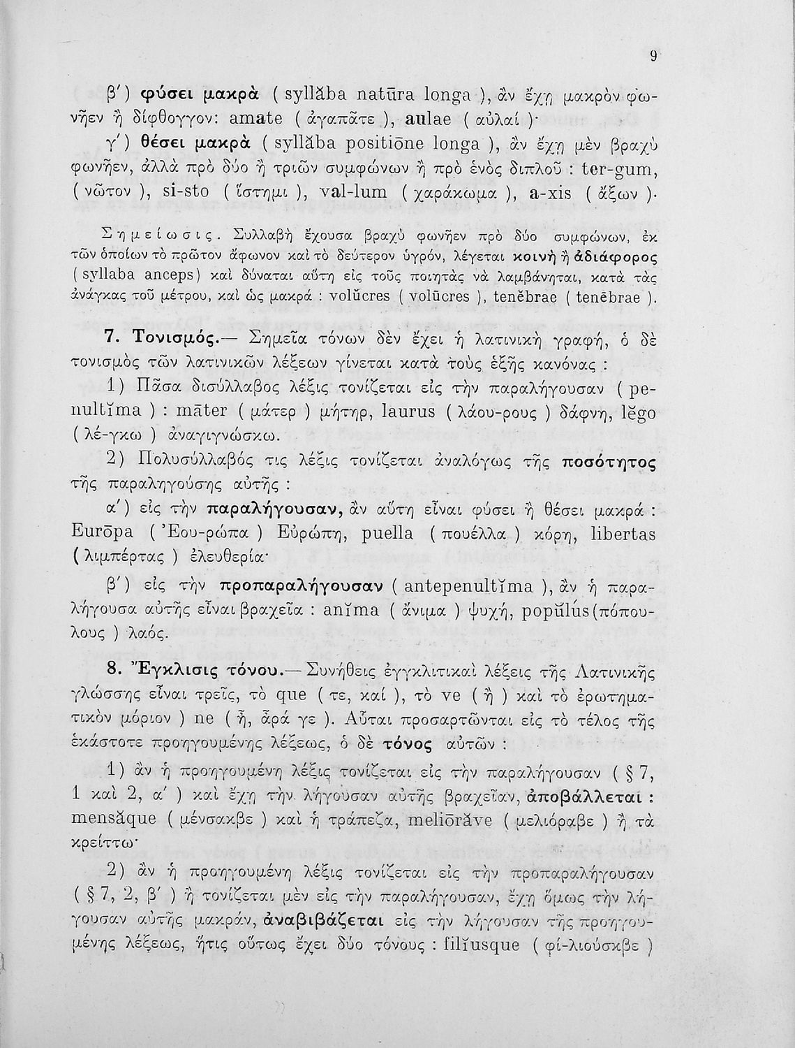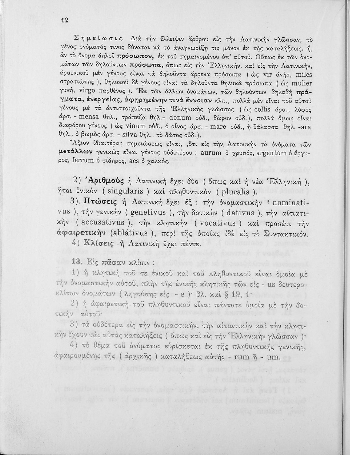 Σχολικό εγχειρίδιο Λατινικών Γυμνασίου που περιλαμβάνει γραμματική και συντακτικό και είναι χωρισμένο σε φθογγολογικό, τυπολογικό και ετυμολογικό μέρος.