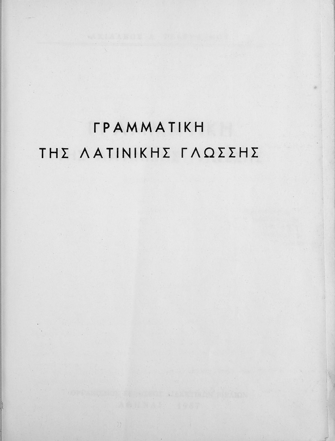 Σχολικό εγχειρίδιο Λατινικών Α΄, Β΄ και Γ΄ Λυκείου που περιλαμβάνει γραμματική και συντακτικό και είναι χωρισμένο σε φθογγολογικό, τυπολογικό και ετυμολογικό μέρος.