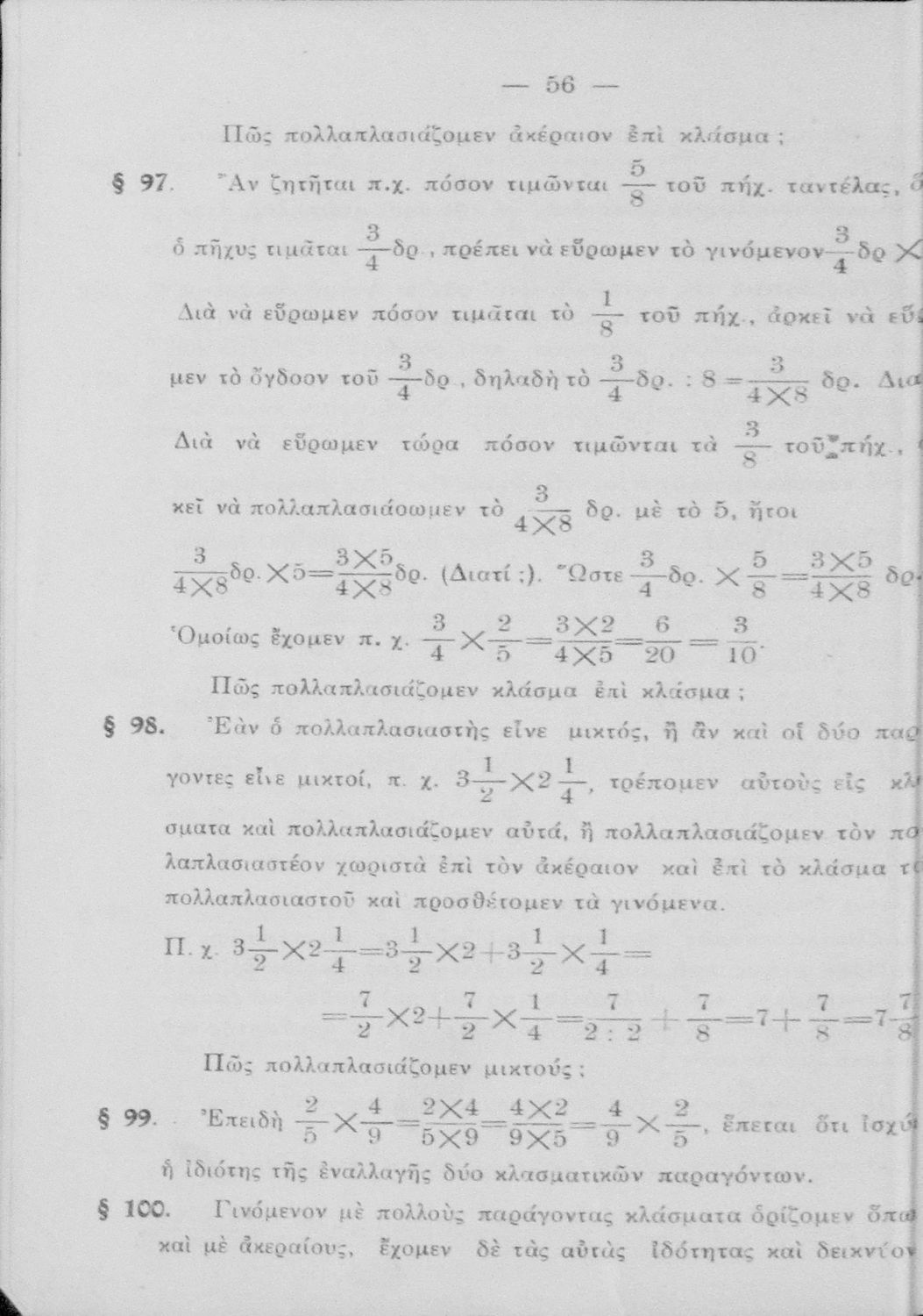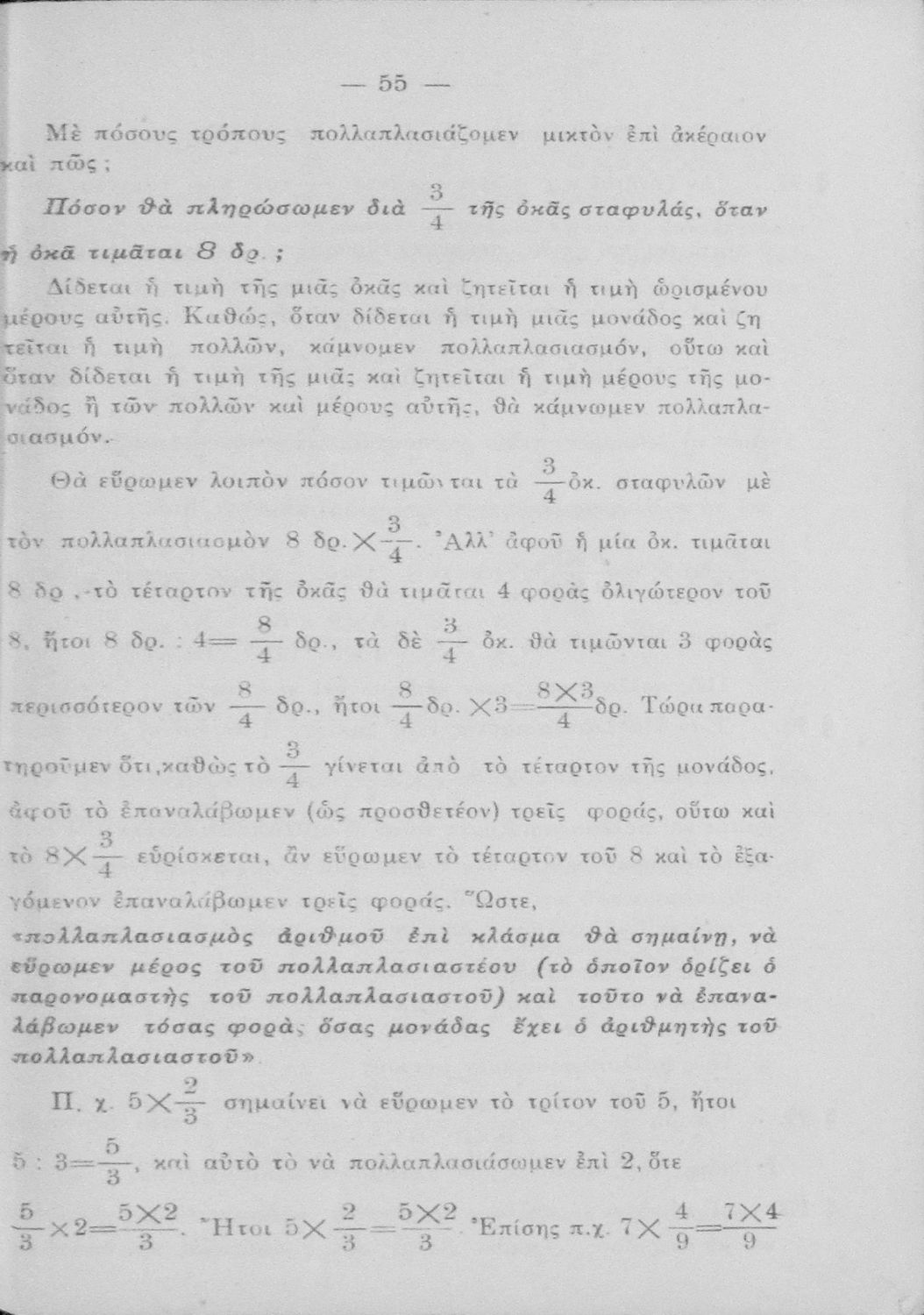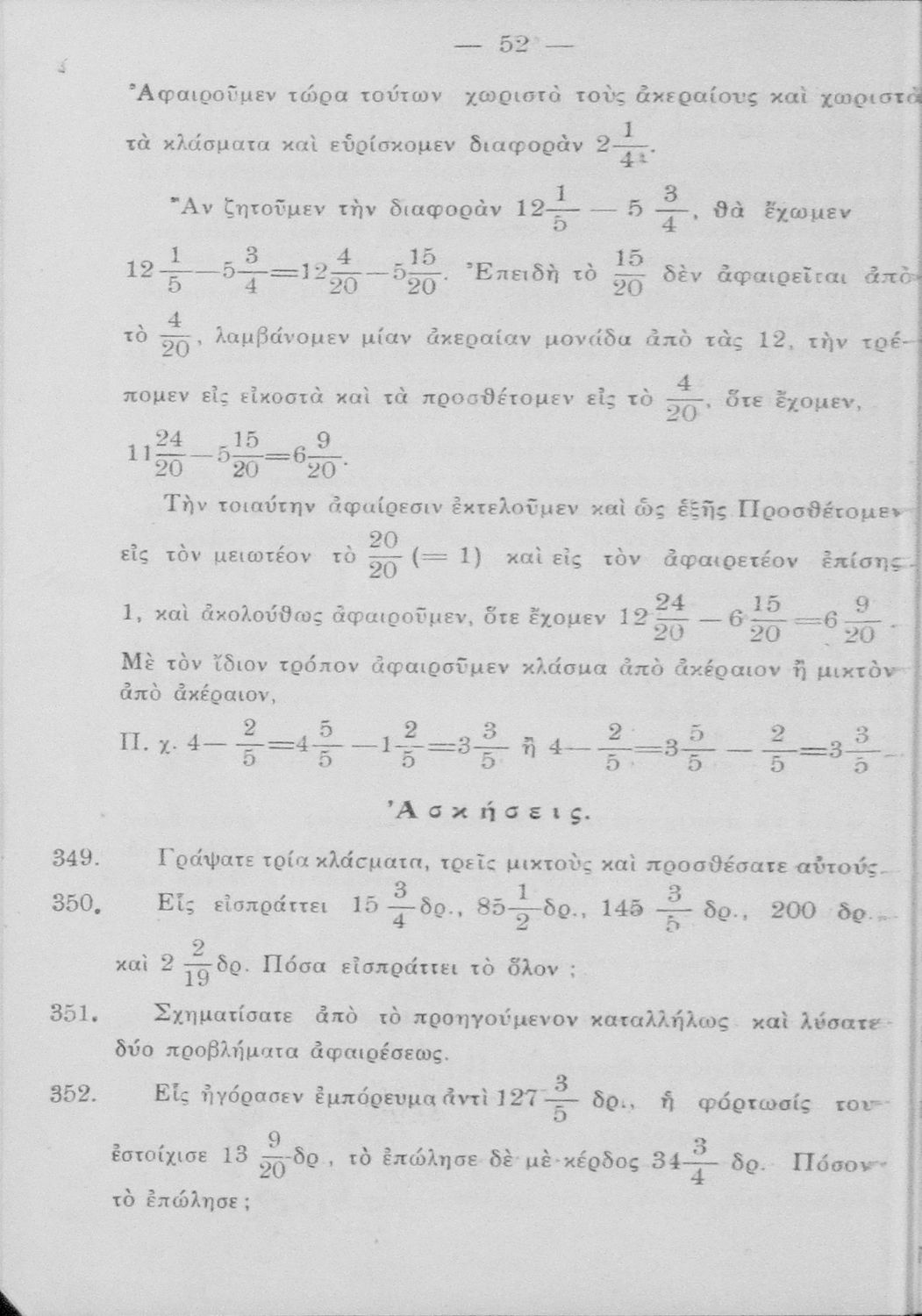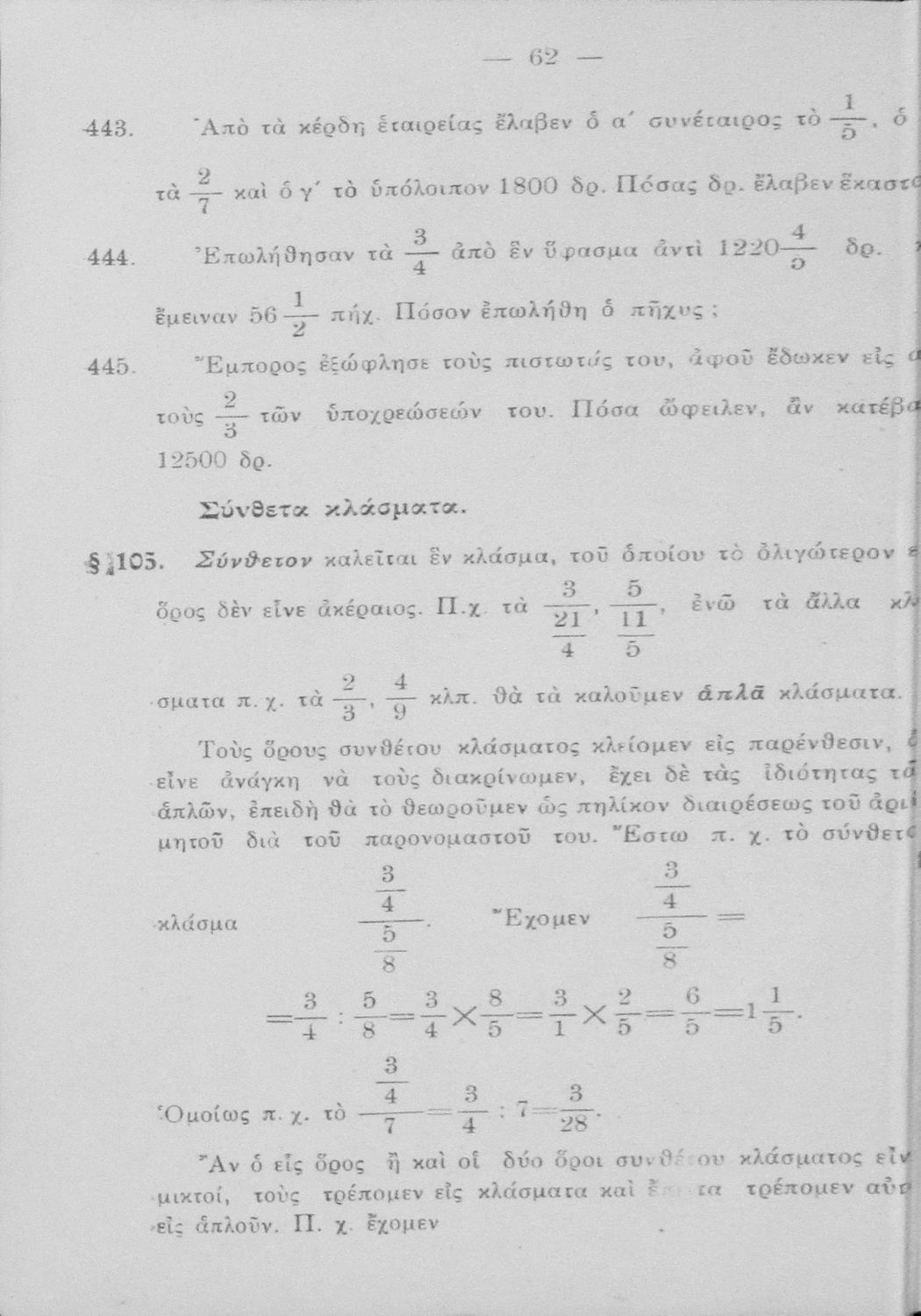 Σχολικό εγχειρίδιο Αριθμητικής για τα Ελληνικά Σχολεία χωρισμένο σε θεωρία και ασκήσεις που εστιάζει στις αριθμητικές πράξεις και τα κλάσματα. Περιέχει και παράρτημα λογιστικής.