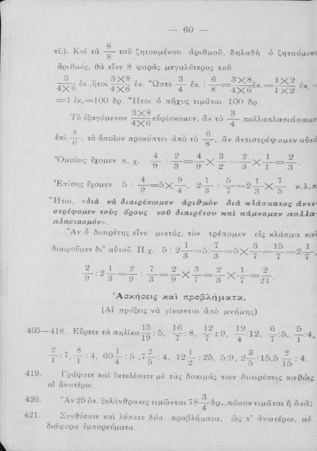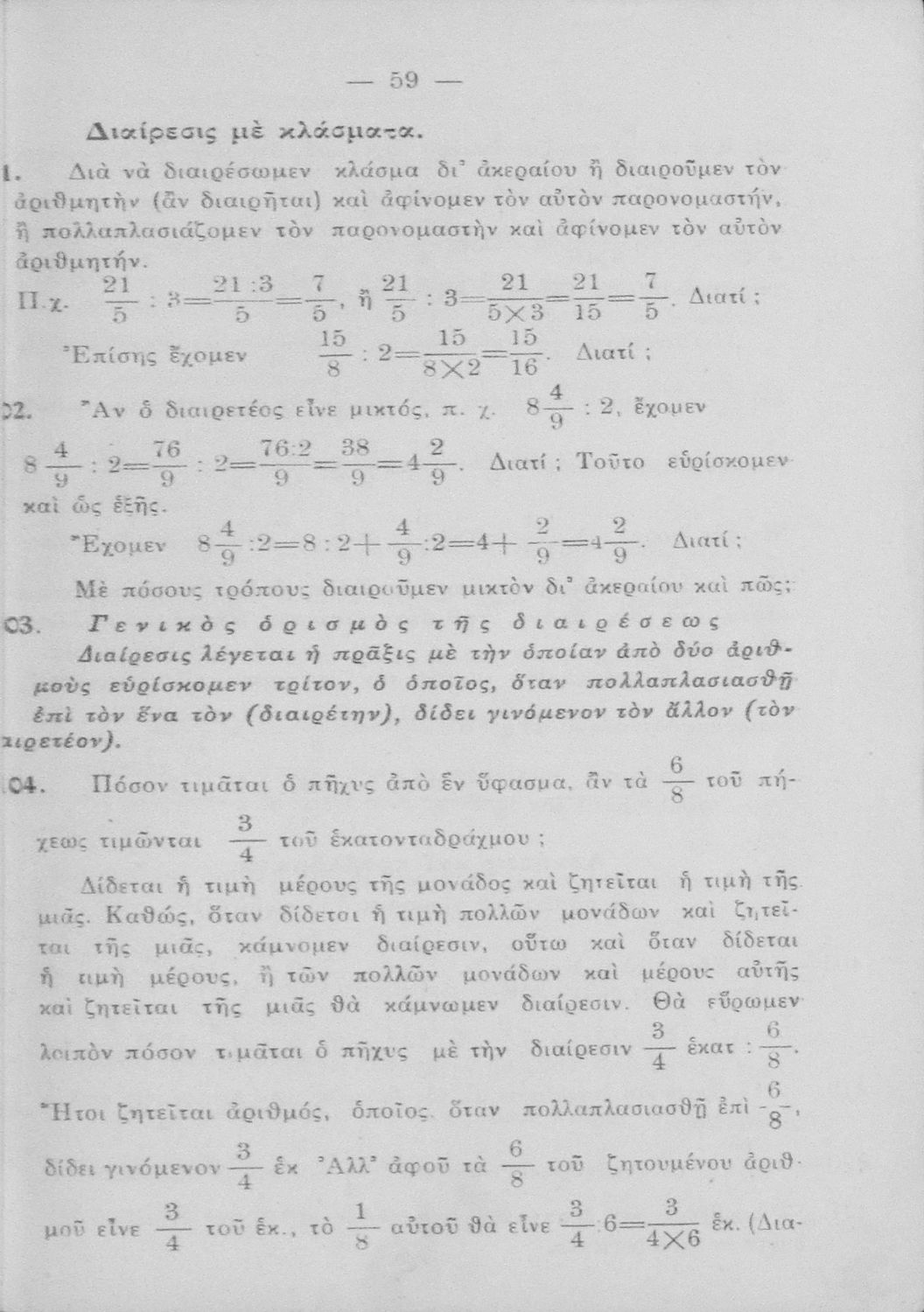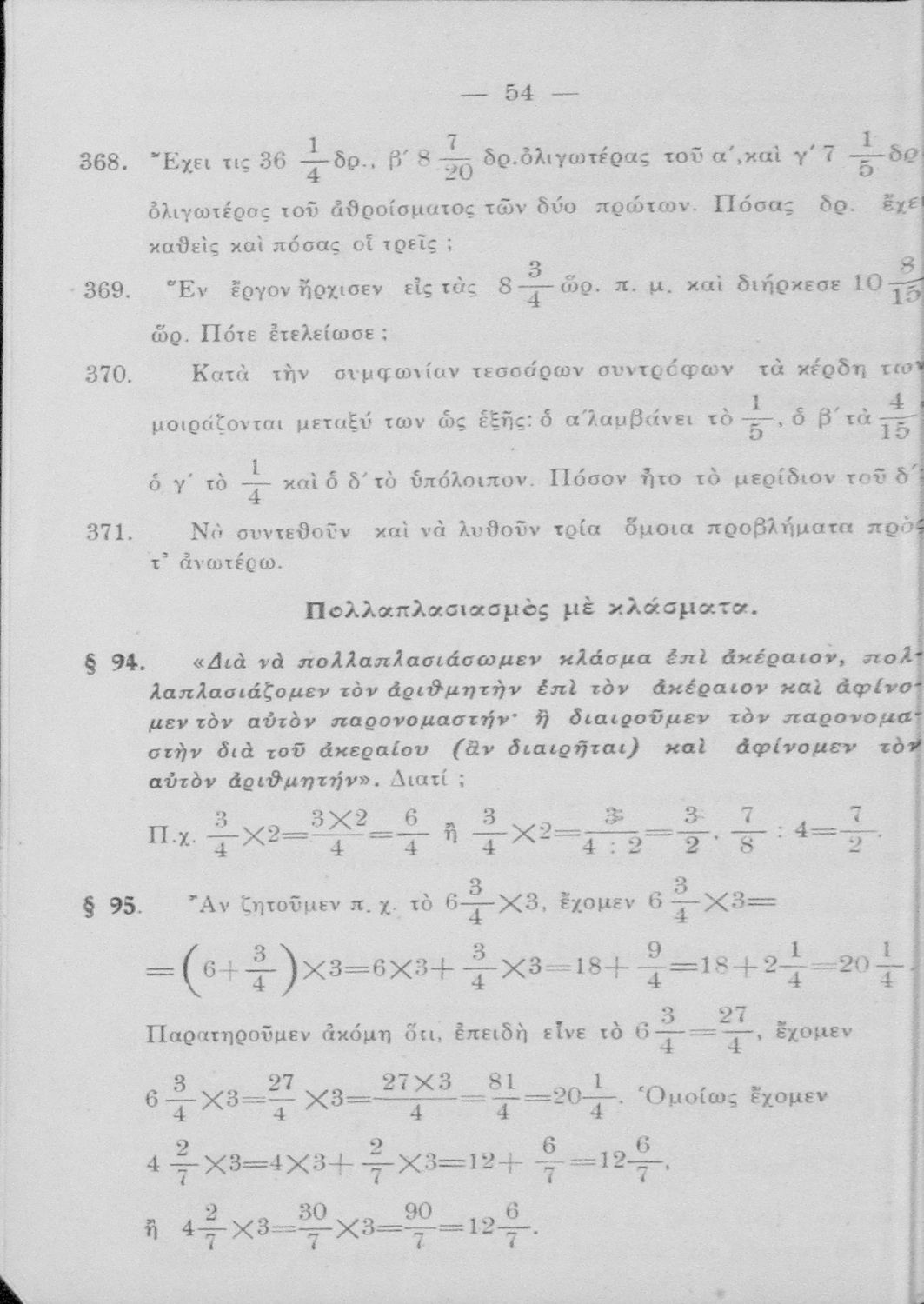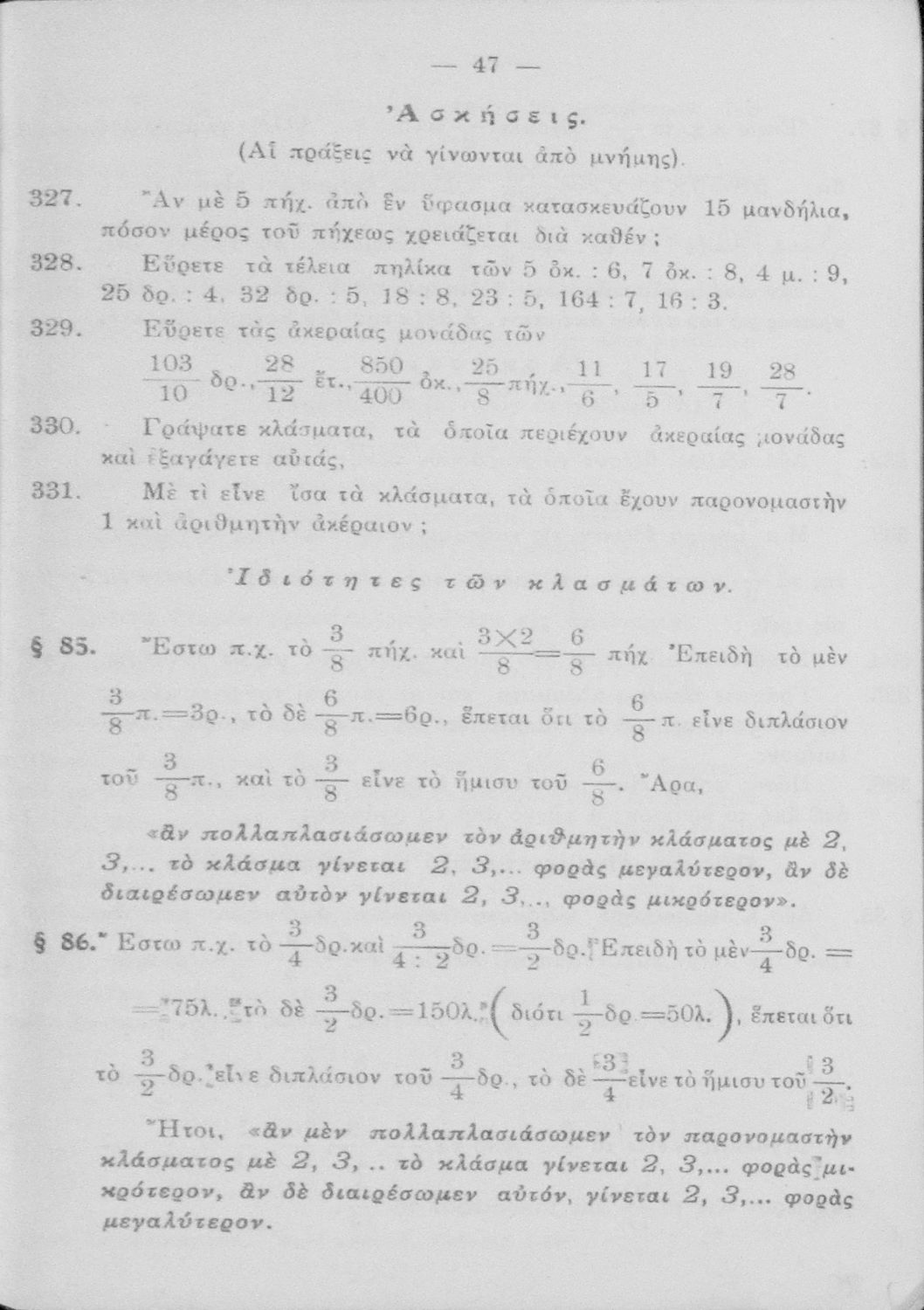 Σχολικό εγχειρίδιο Αριθμητικής για τα Ελληνικά Σχολεία χωρισμένο σε θεωρία και ασκήσεις που εστιάζει στις αριθμητικές πράξεις και τα κλάσματα. Περιέχει και παράρτημα λογιστικής.